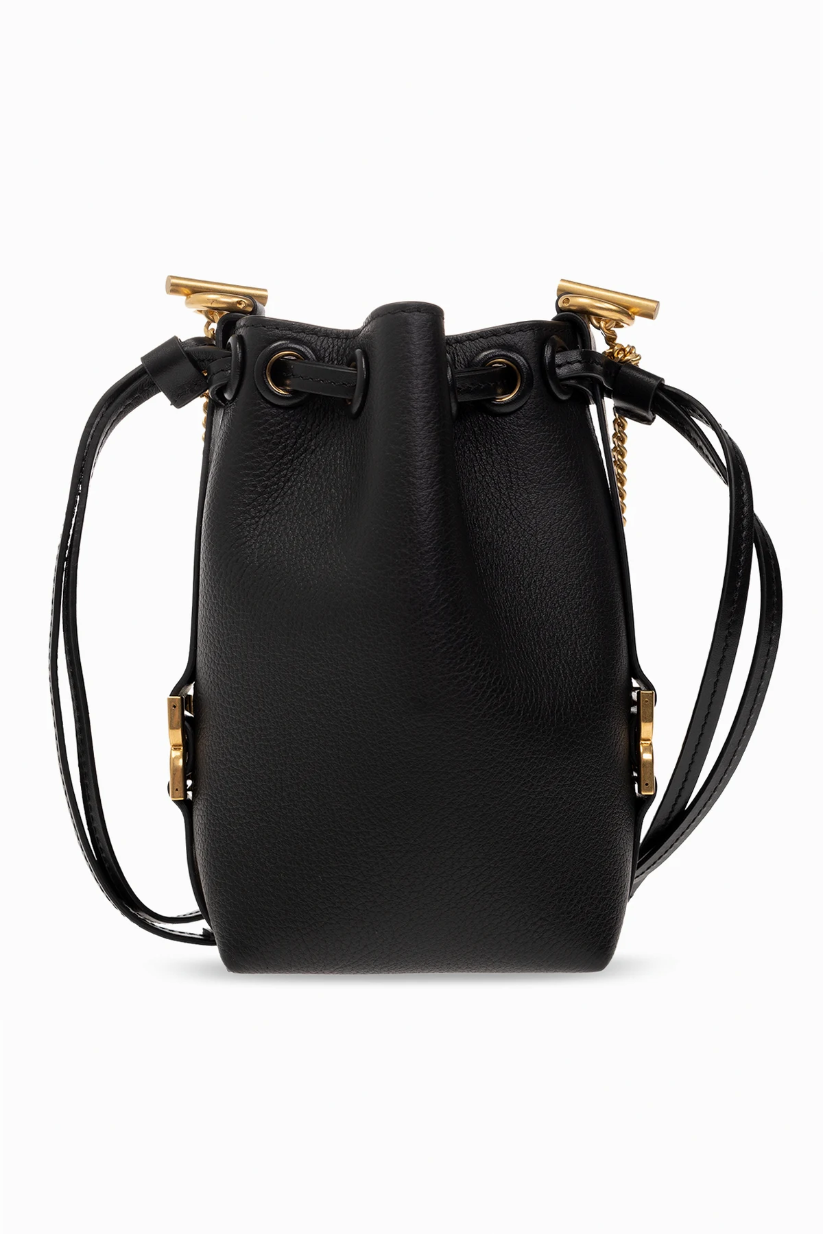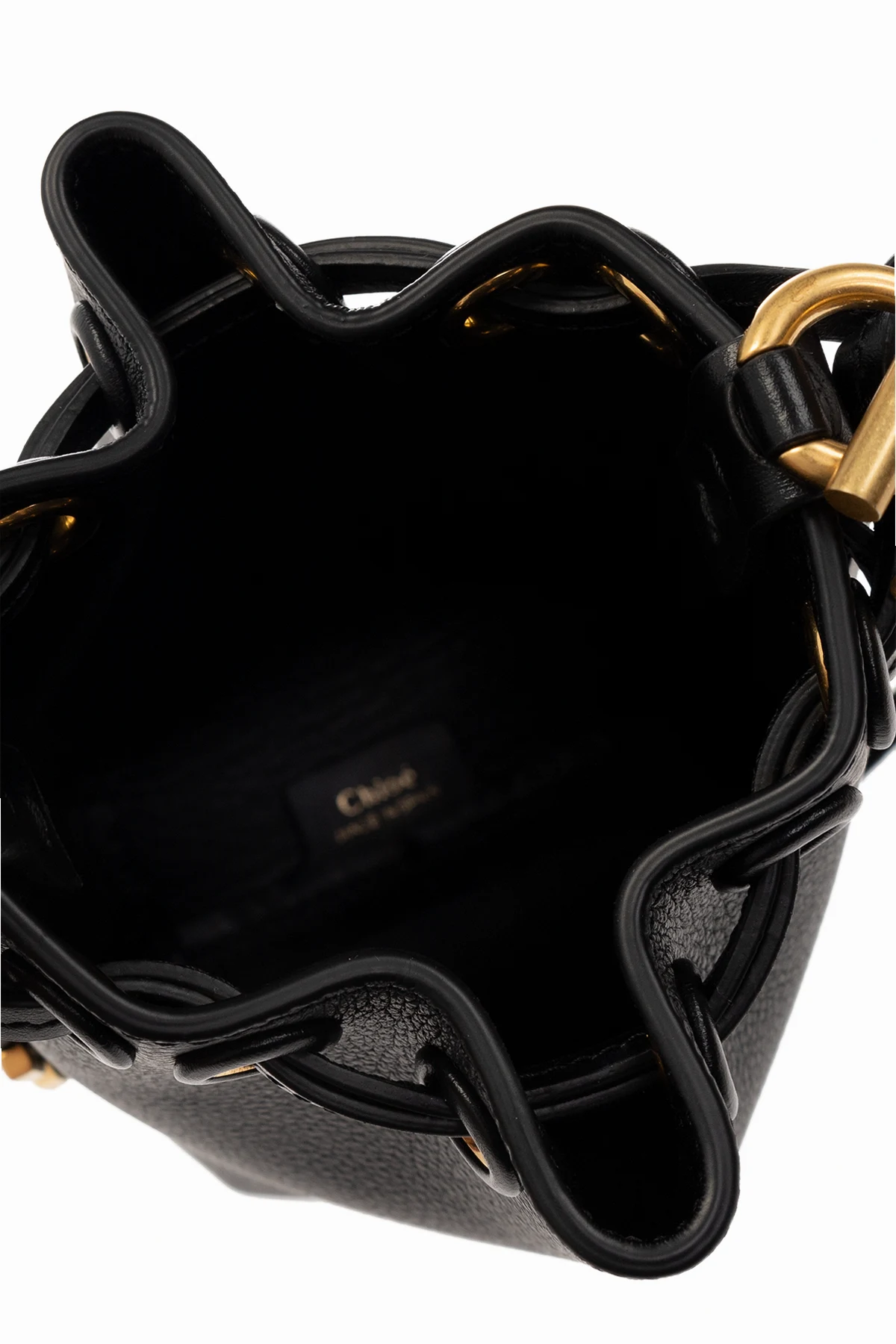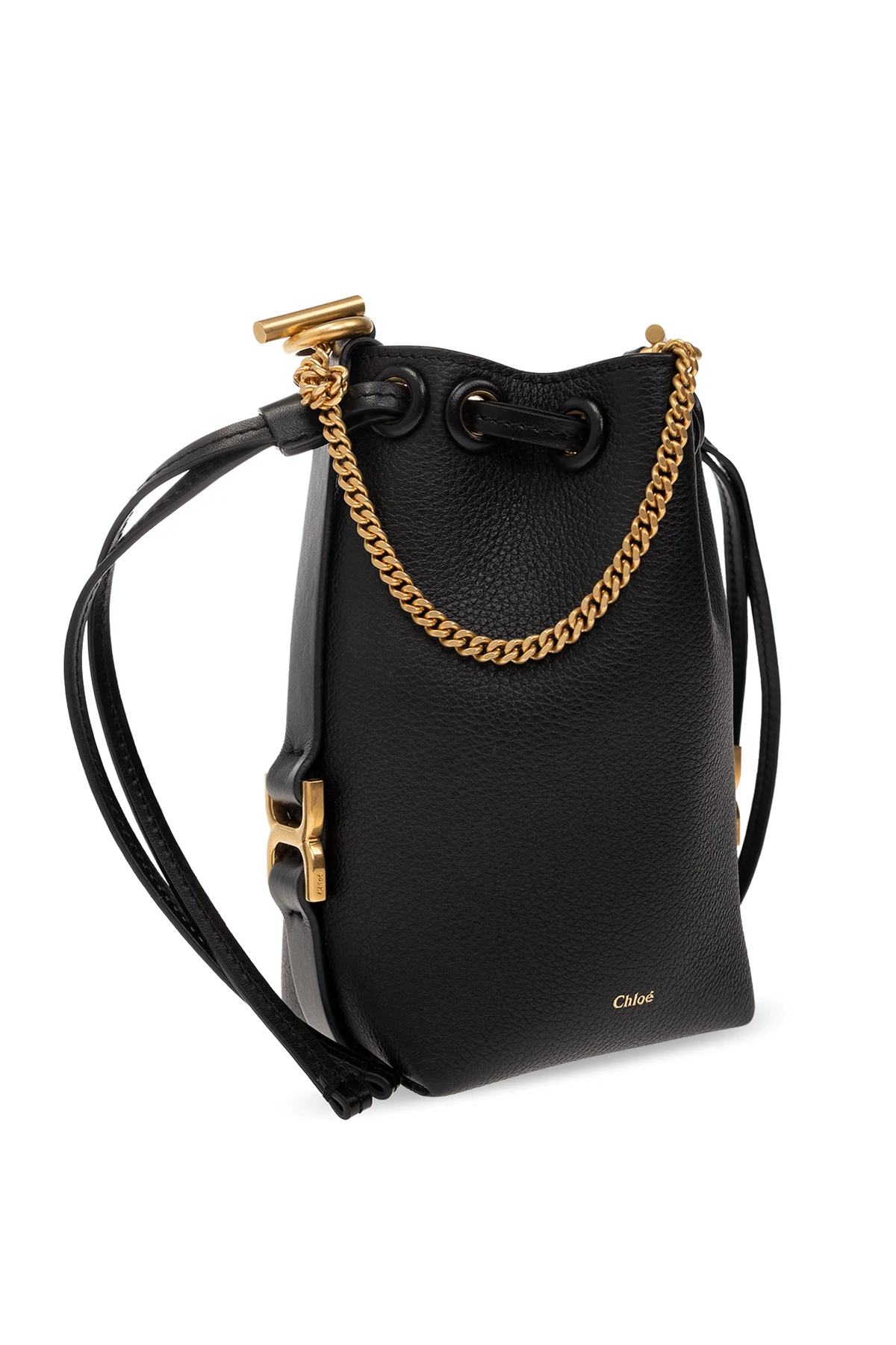 Czarna torba na ramię typu ‘bucket’, model ‘Marcie Micro’ Chloe. Wykonana ze skóry. Ściągana trokami. Ozdobiona logo i dekoracyjnymi aplikacjami. Długi łańcuch. Wewnątrz komora. Metalowe elementy w kolorze złotym.