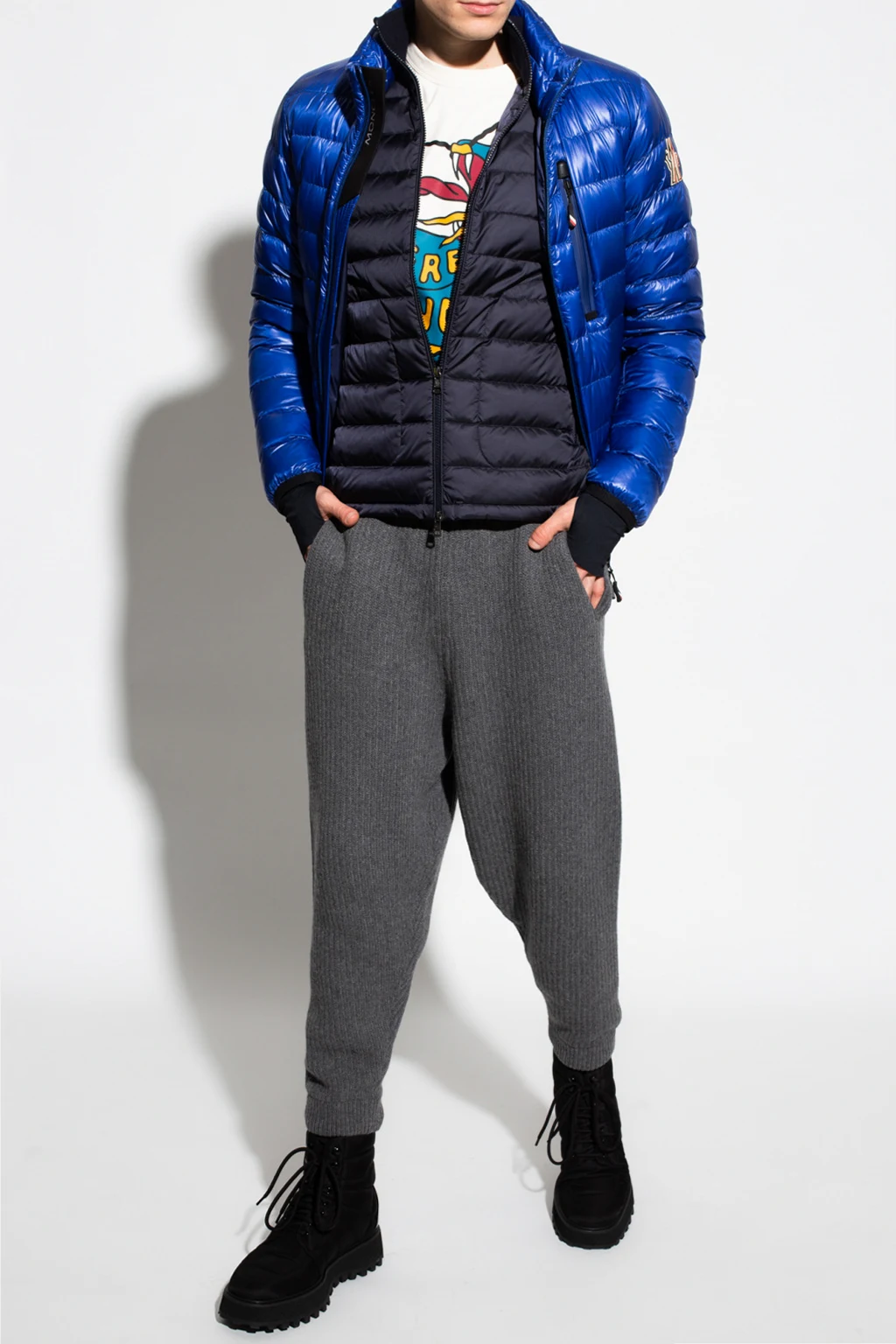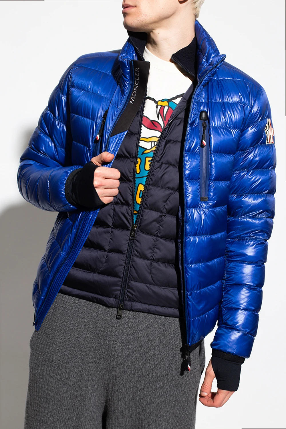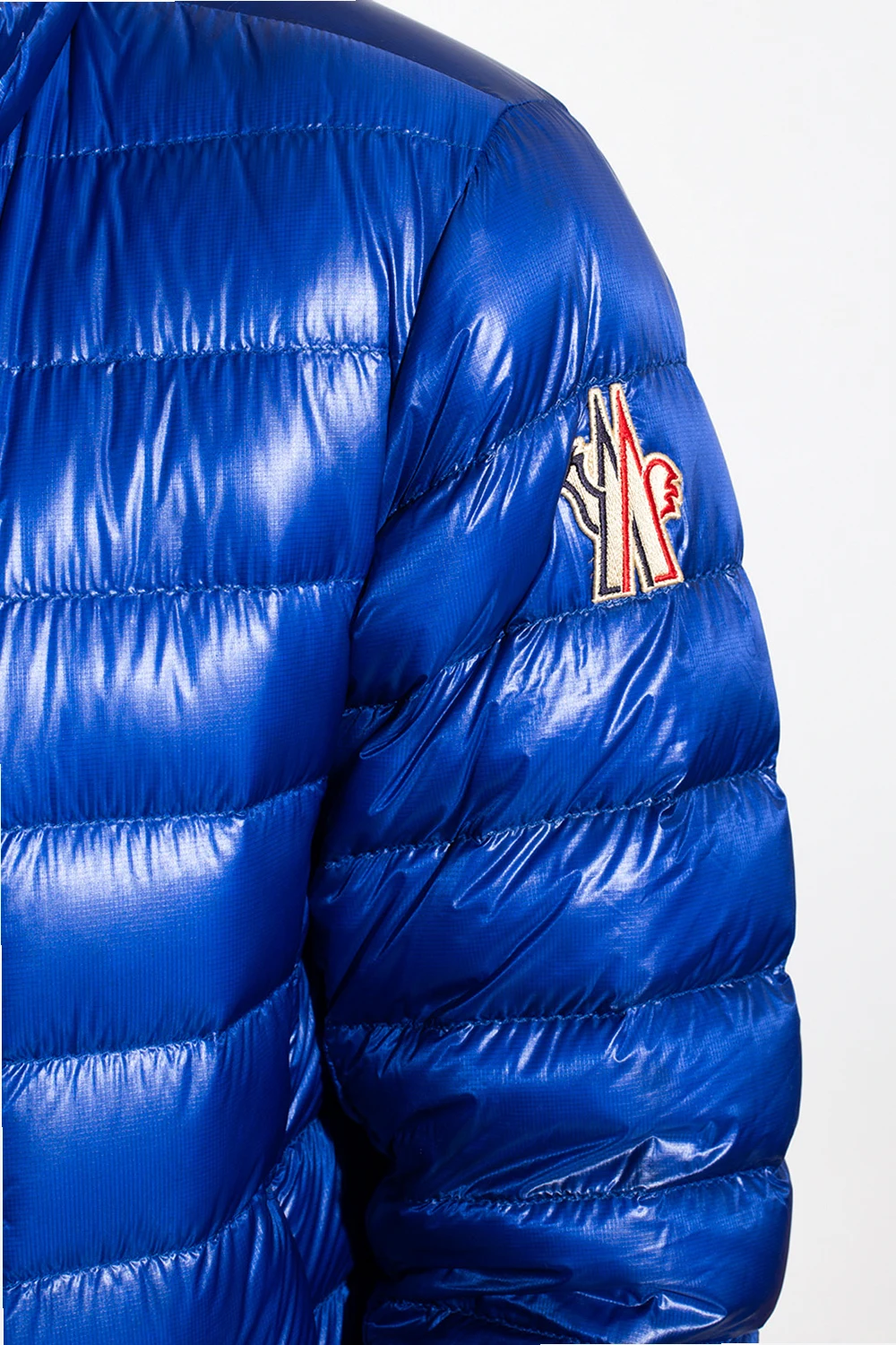 Granatowa, pikowana kurtka, model ‘Hers’ Moncler Grenoble. Zapinana na zamek. Ozdobiona naszywką z logo w kolorze kremowo-czarno-czerwonym. Cztery kieszenie zapinane na zamek. Na dole wszyta guma. Długie rękawy wykończone ściągaczem z miejscem na kciuk.