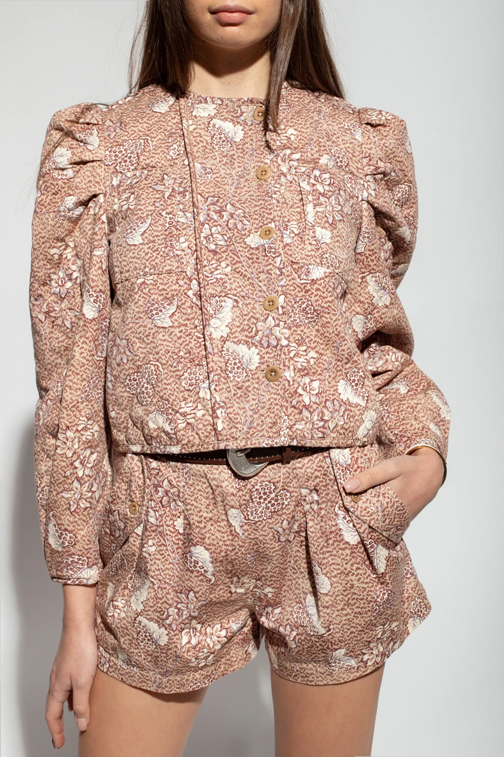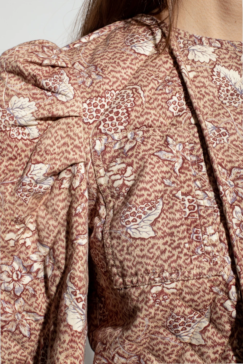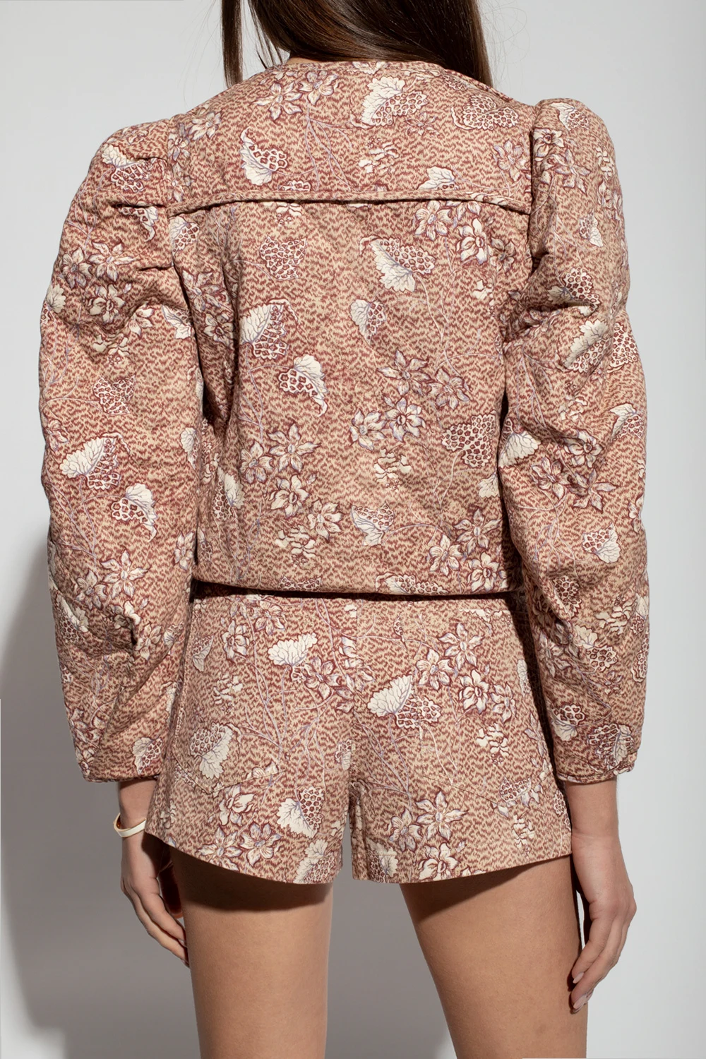 Beżowo-kremowo-brązowa kurtka, model ‘Syd’ Ulla Johnson. Wykonana z bawełny. Zapinana na guziki. Ozdobiona wzorem z motywem kwiatowym. Z przodu wsuwana kieszeń. Długie, bufiaste rękawy.