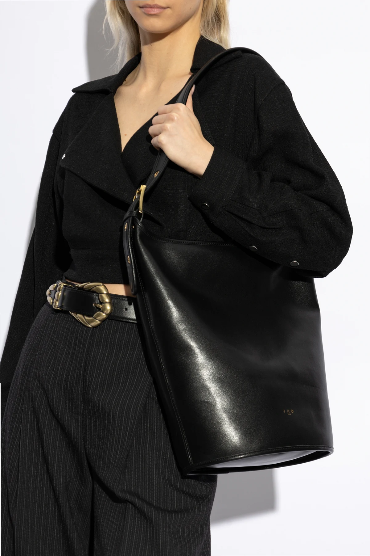Subtelne, złote logo IRO Paris zdobi przednią stronę torby, nadając jej charakteru. Szeroki pasek na ramię, przymocowany za pomocą złotych elementów, dodaje jej funkcjonalności i stylu. Wnętrze torby zabezpieczone jest zamkiem błyskawicznym, zapewniając ochronę wartościowych przedmiotów.