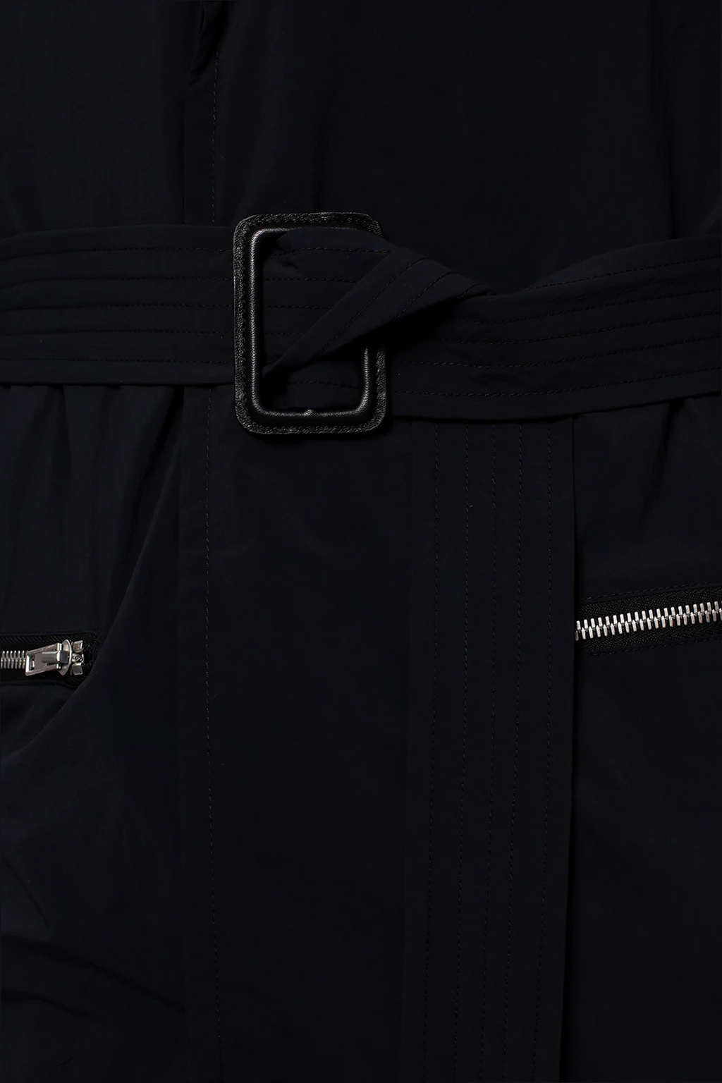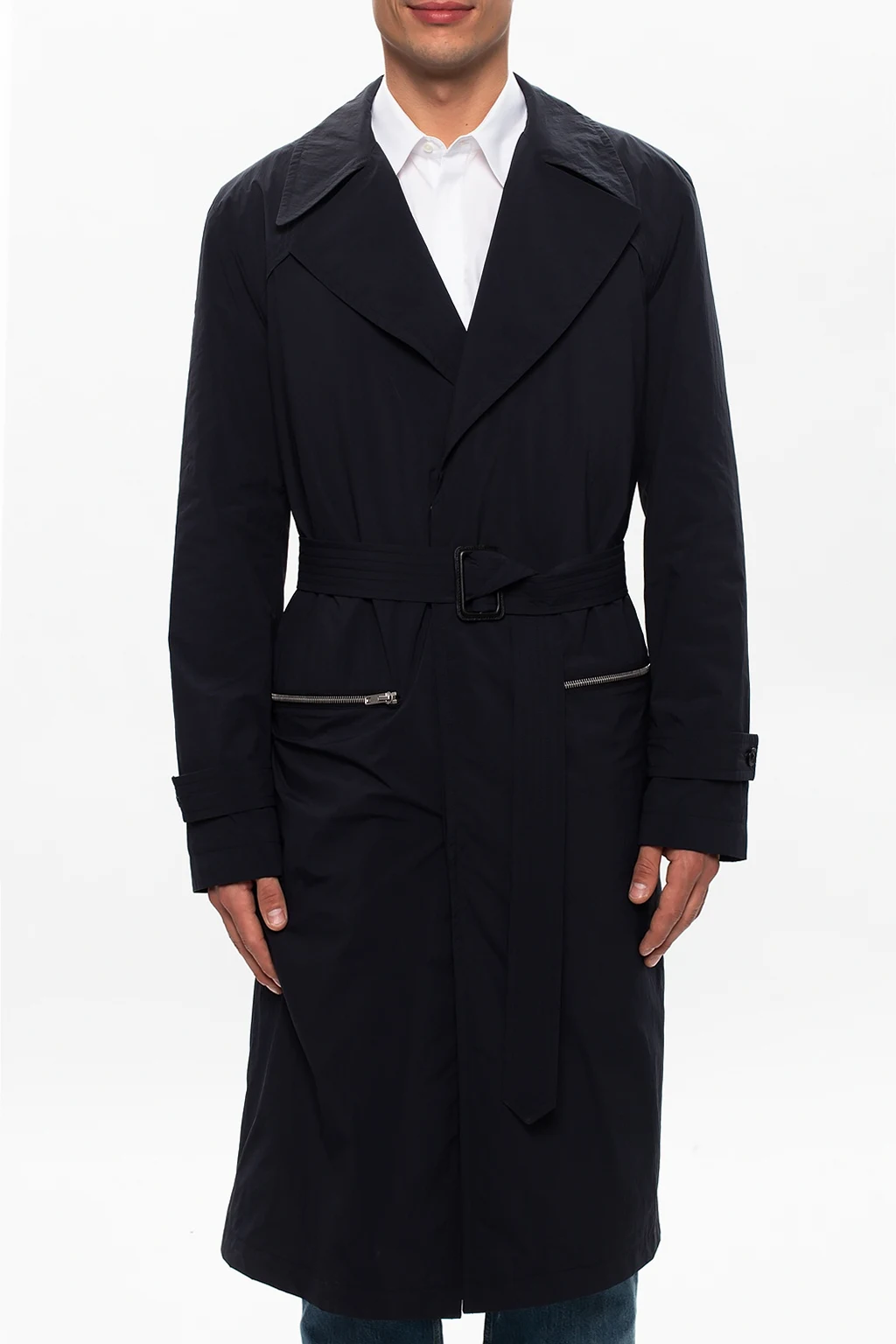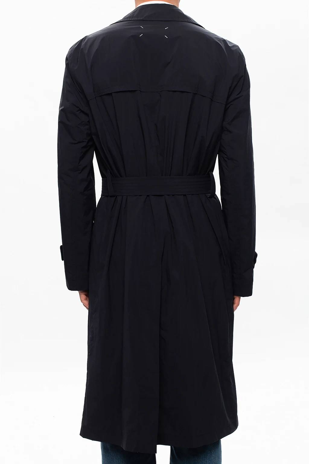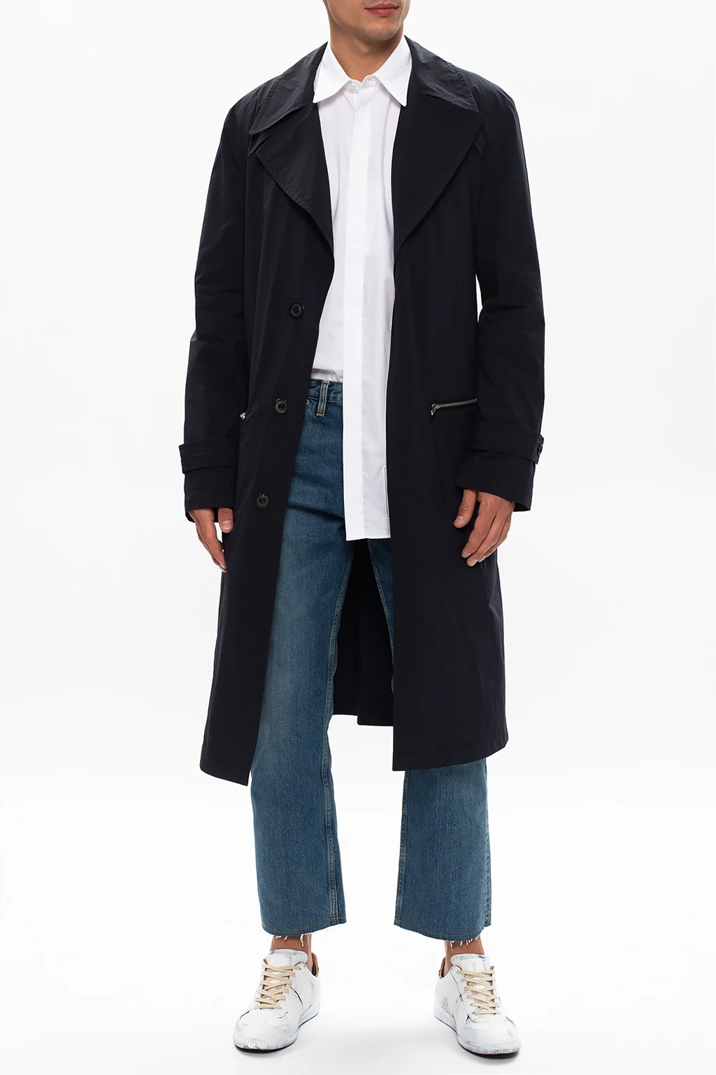 Czarny płaszcz Maison Margiela. Zapinany na guziki z krytą plisą. Dołączony pasek z klamrą. Z tyłu wyszyte logo w kolorze białym. Dwie kieszenie zapinane na zamki. Metalowe elementy w kolorze srebrnym.