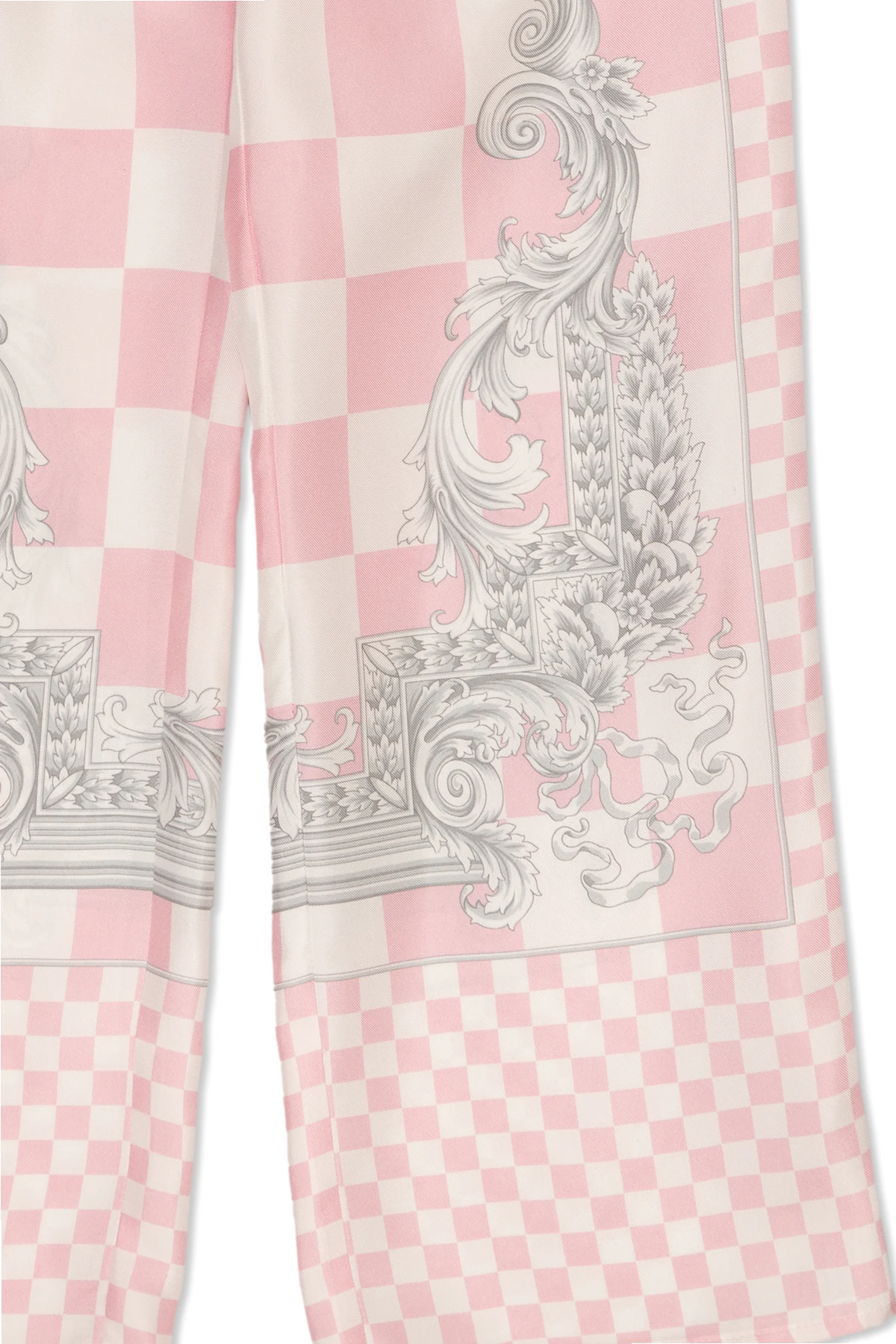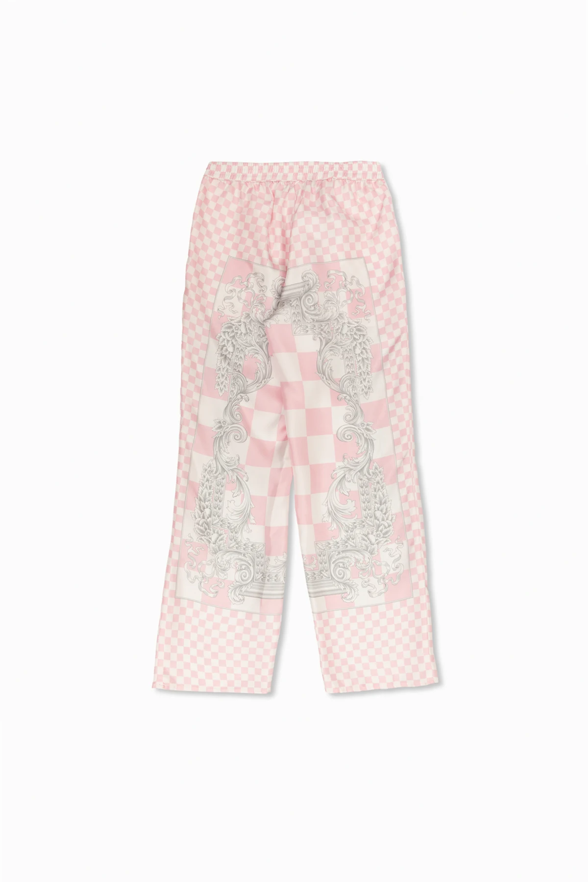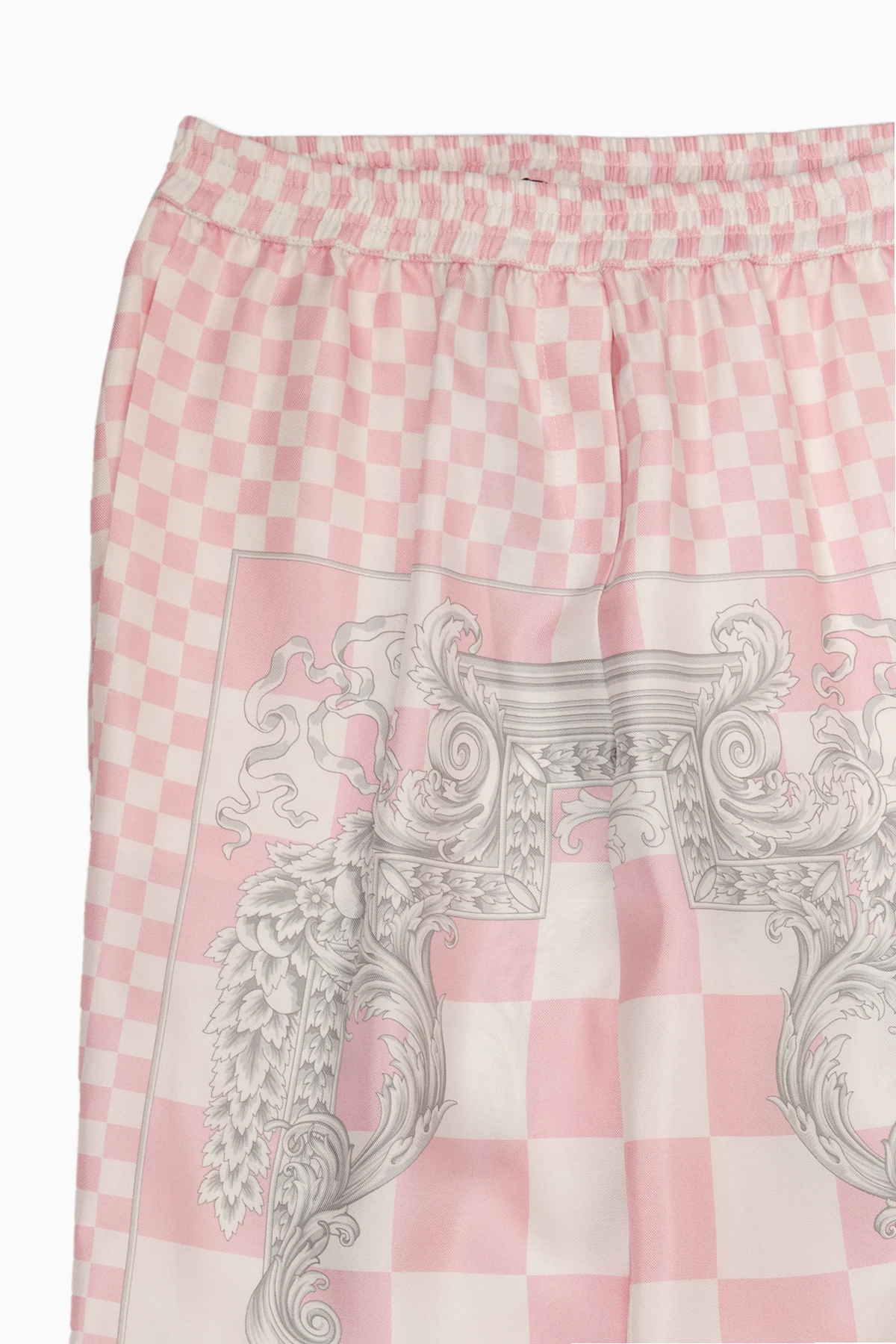 Prezentujemy Państwu wyrafinowane jedwabne spodnie z najnowszej kolekcji Versace Kids , dedykowane dla dziewczynki ceniącej sobie zarówno komfort, jak i niepowtarzalny styl. Dominujący różowy kolor spodni, przełamany jest unikatowym wzorem w dużą szachownicę, gdzie kwadraty w głębokim różu przeplatają się z delikatnymi, jasnymi elementami ozdobionymi motywami roślinnymi oraz ornamentami w stylu barokowym. Subtelne odcienie szarości i srebra nadają całości elegancki i luksusowy charakter.