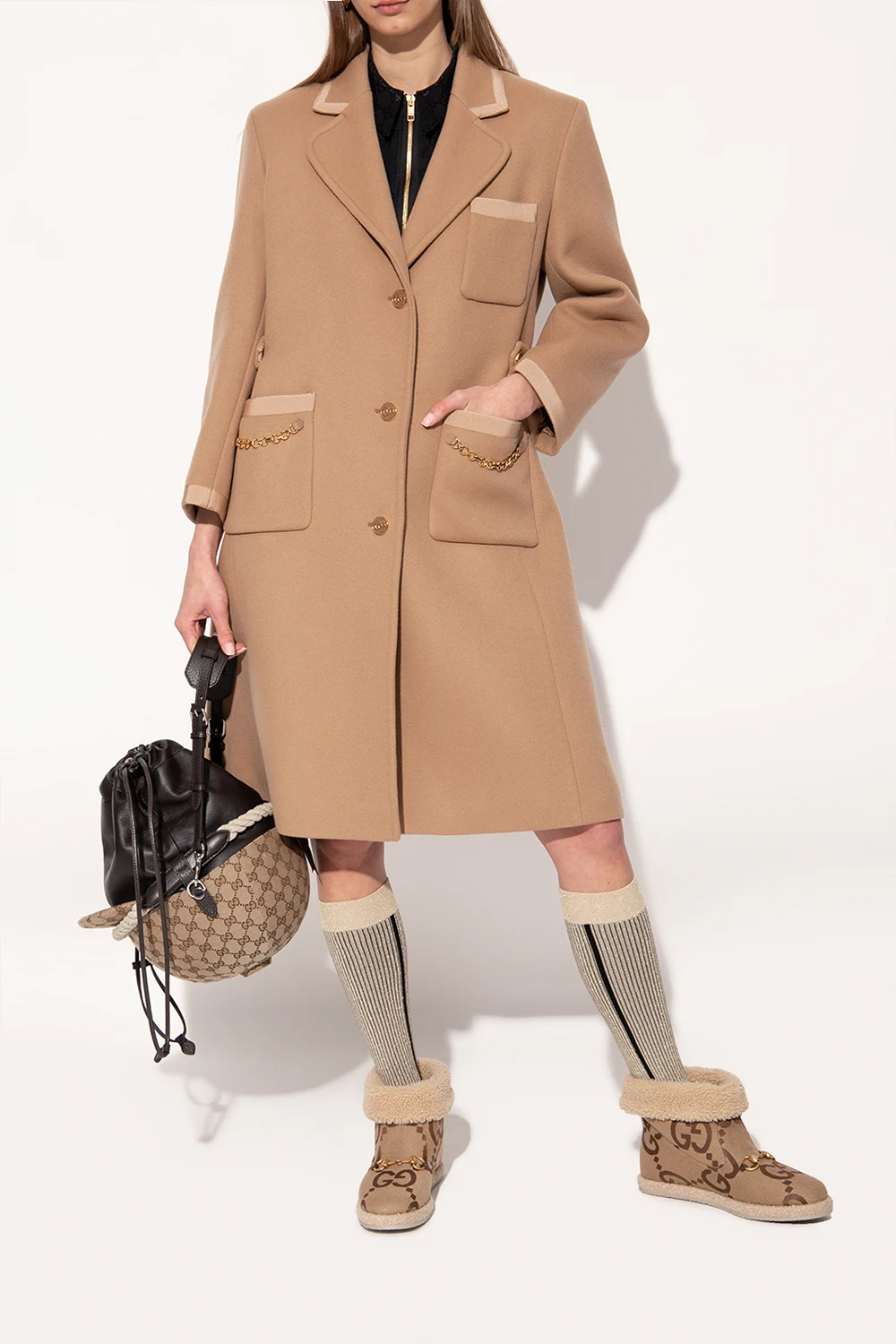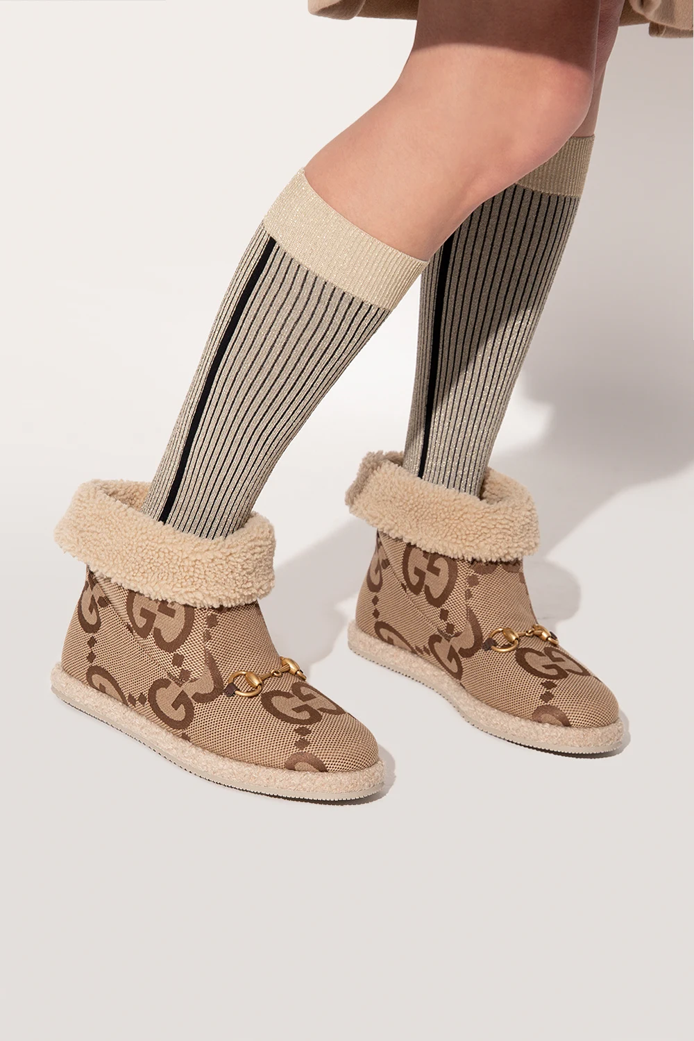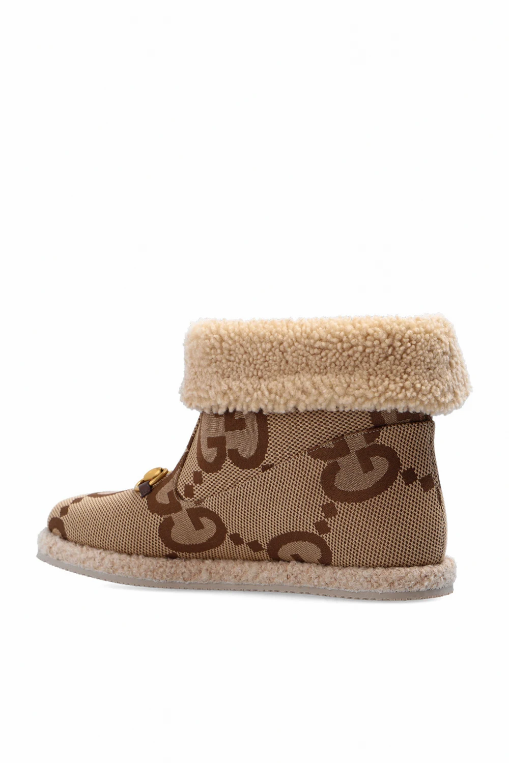 Beżowo-brązowe, wsuwane buty za kostkę Gucci. Wykonane z płótna ‘GG Supreme’ i wykończone wełną z merynosów. Z przodu ozdobione charakterystycznym dla marki wędzidłem w kolorze złotym. Beżowa, gumowa podeszwa.