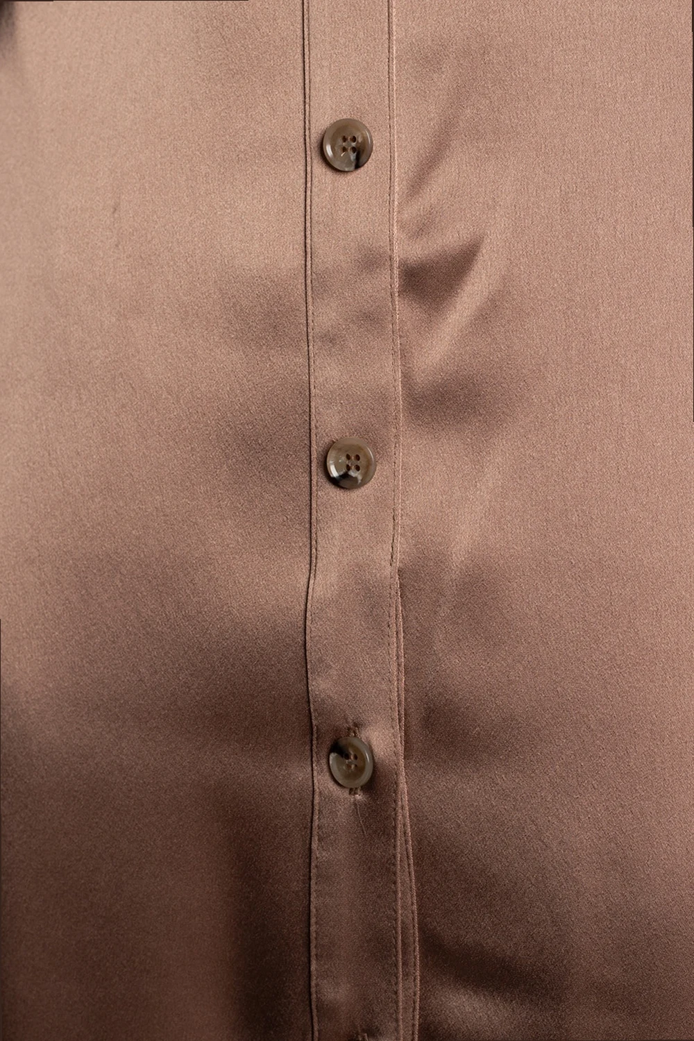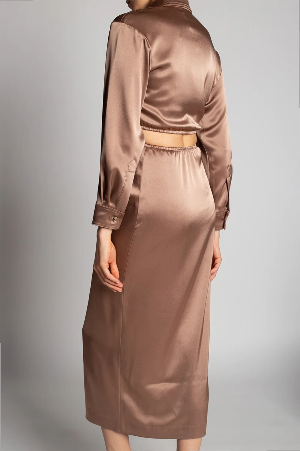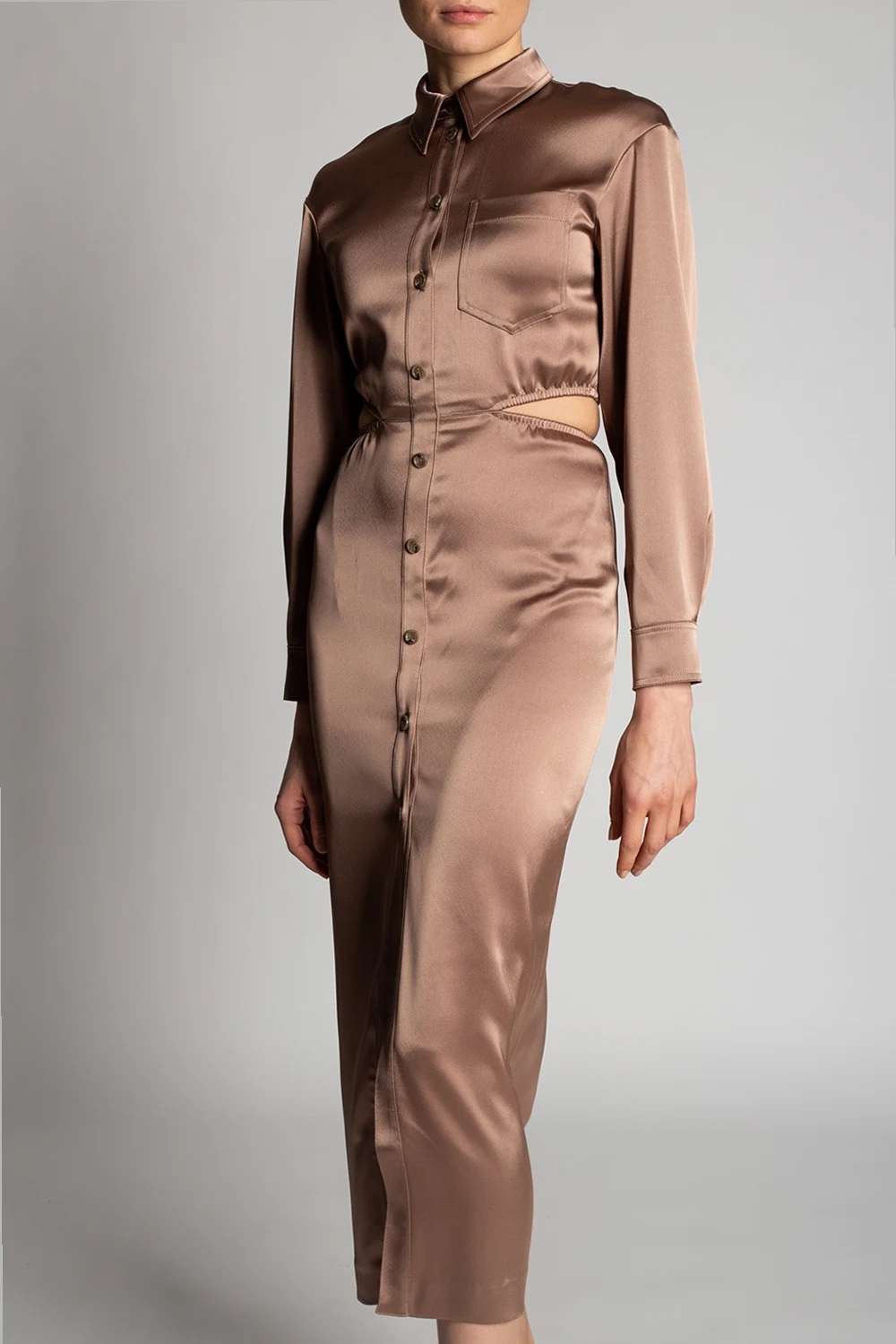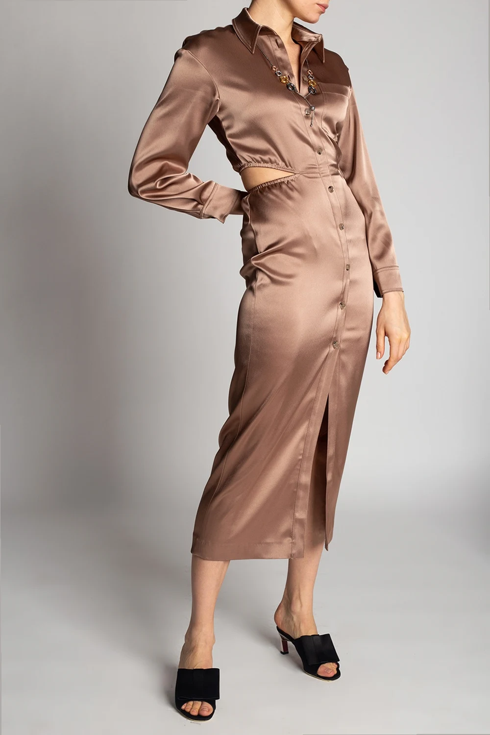 Długa sukienka w kolorze beżowo-złotym z wycięciem Nanushka. Zapinana z przodu na guziki. Z przodu wsuwana kieszeń. Długie rękawy, mankiety zapinane na guzik.