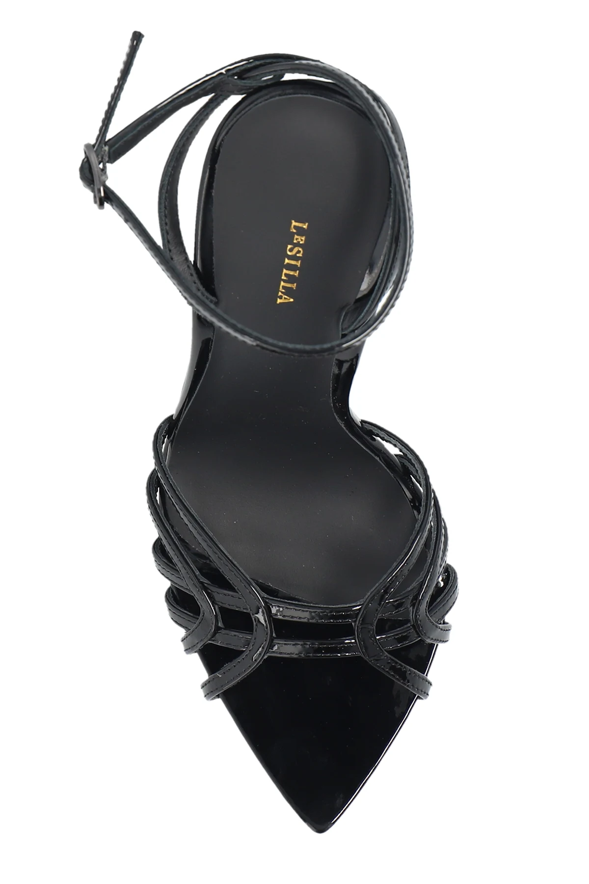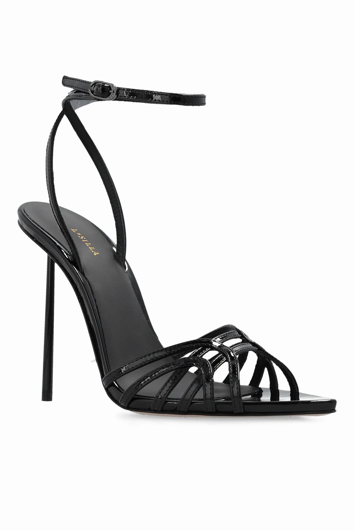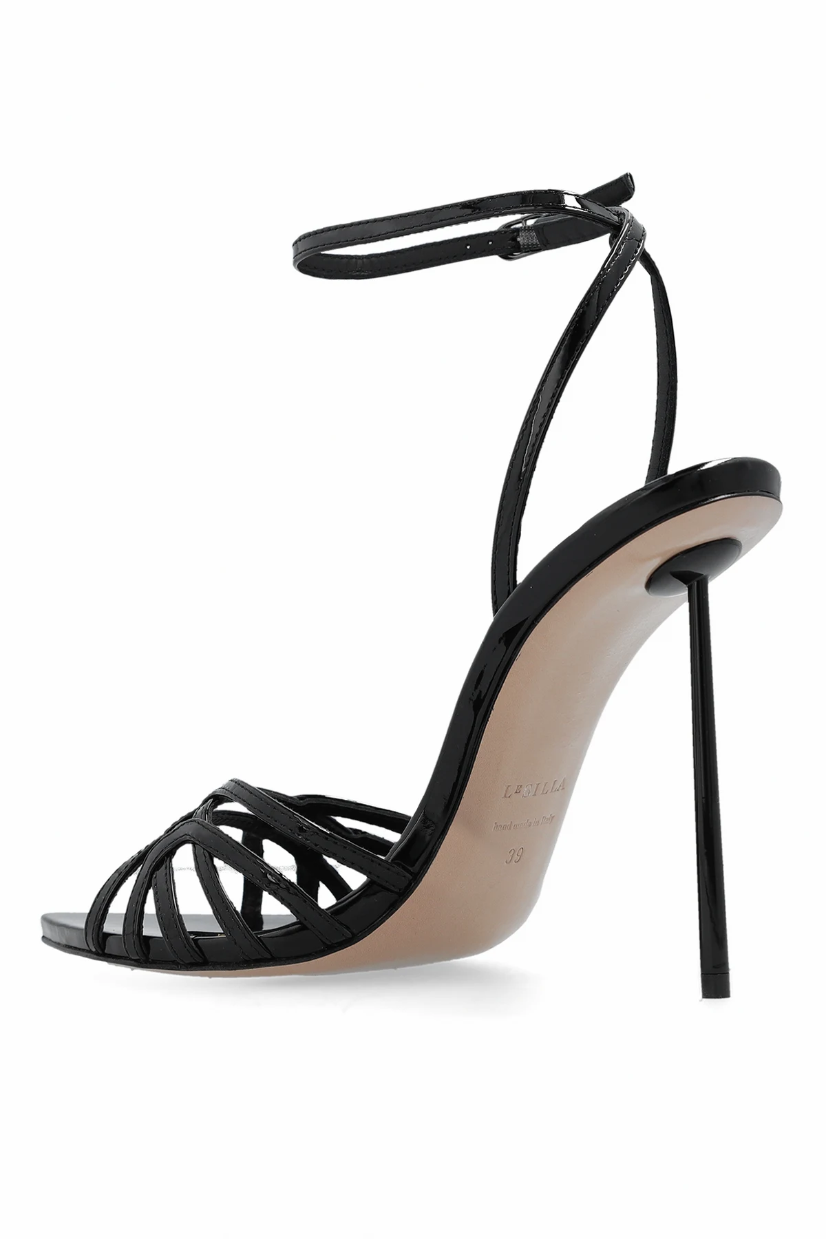 Czarne sandały na obcasie, model ‘Bella’ Le Silla. Wykonane z lakierowanej skóry. Zapinane wokół kostki na pasek z klamrą. Podeszwa w kolorze jasnobeżowym wykonana ze skóry wykończonej gumą.