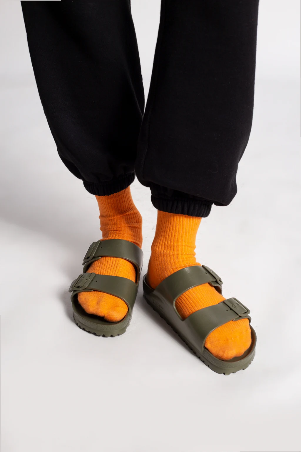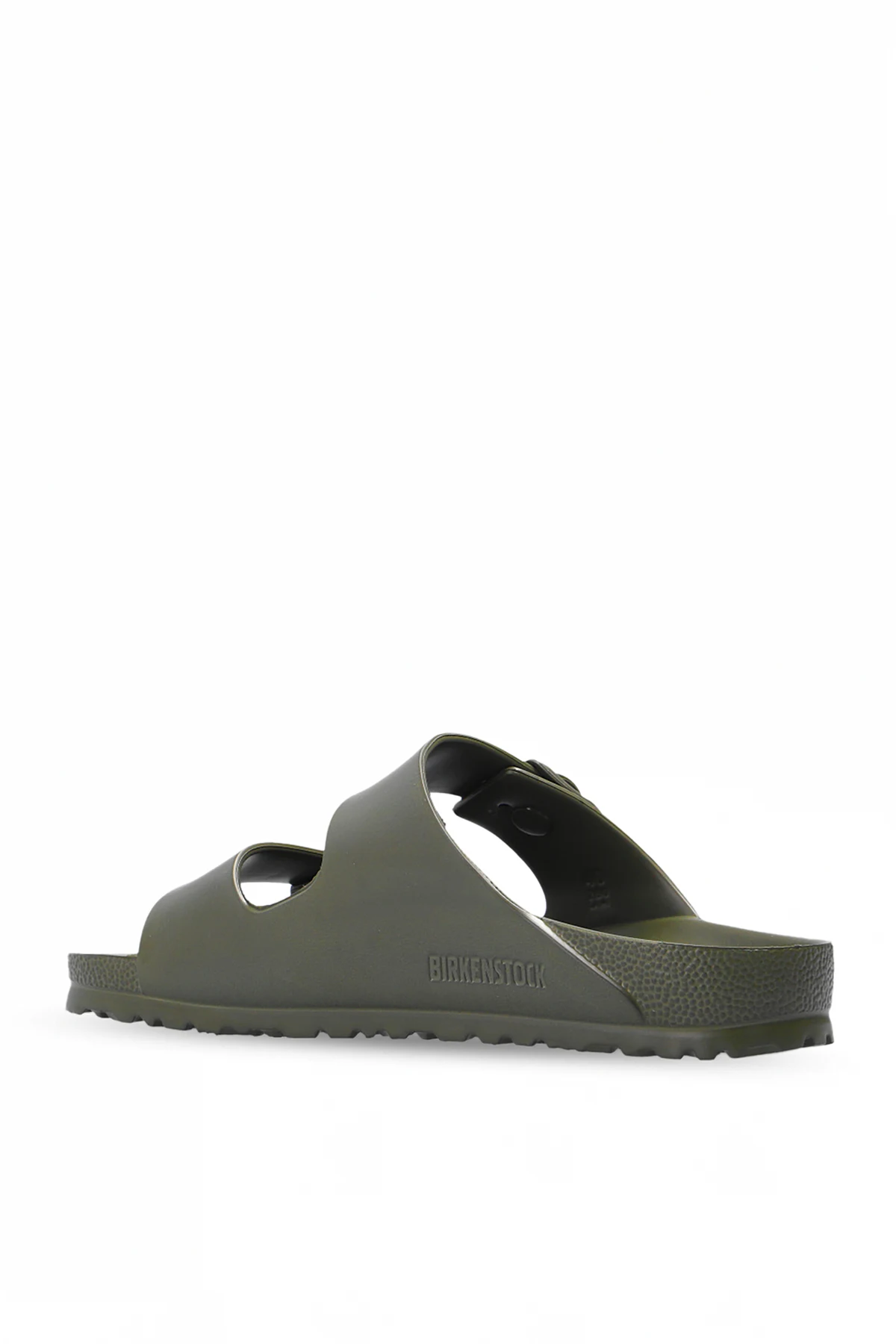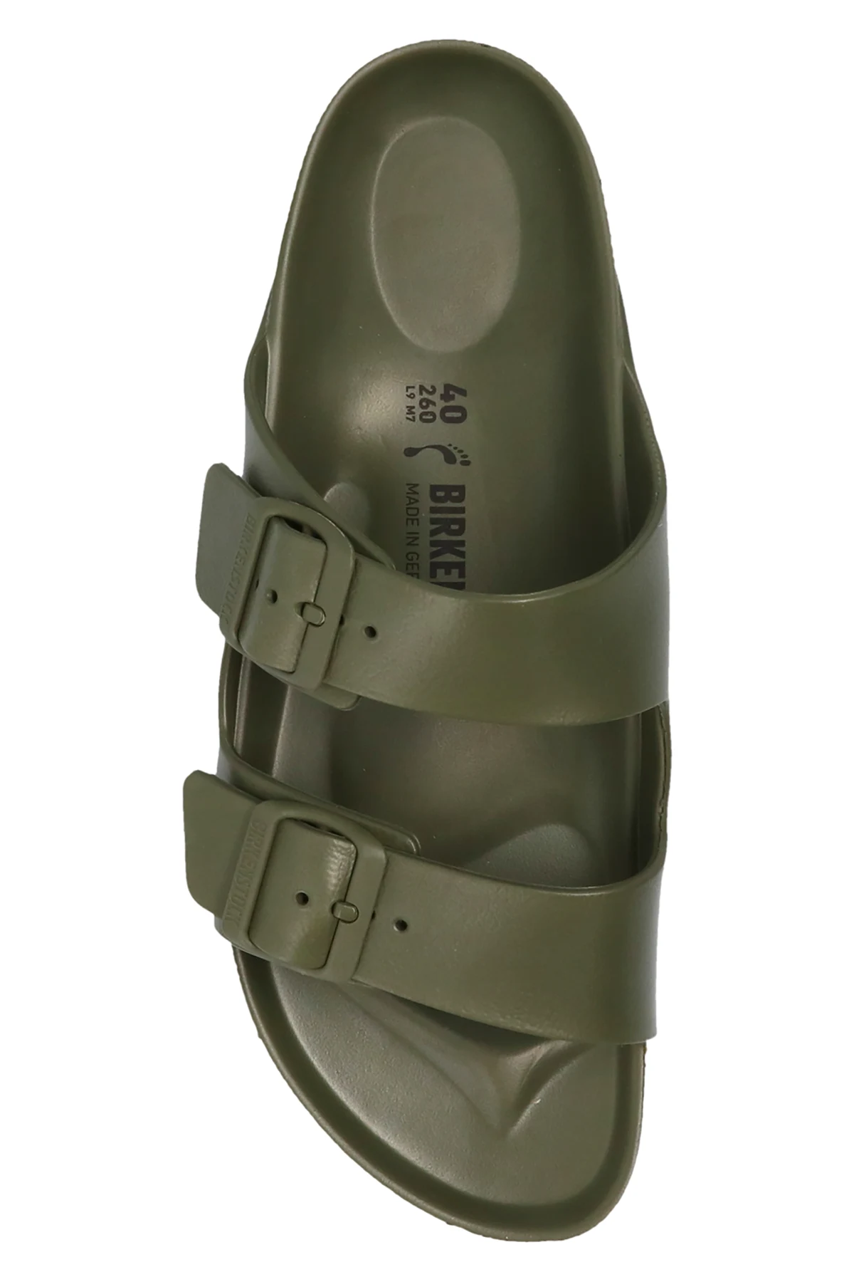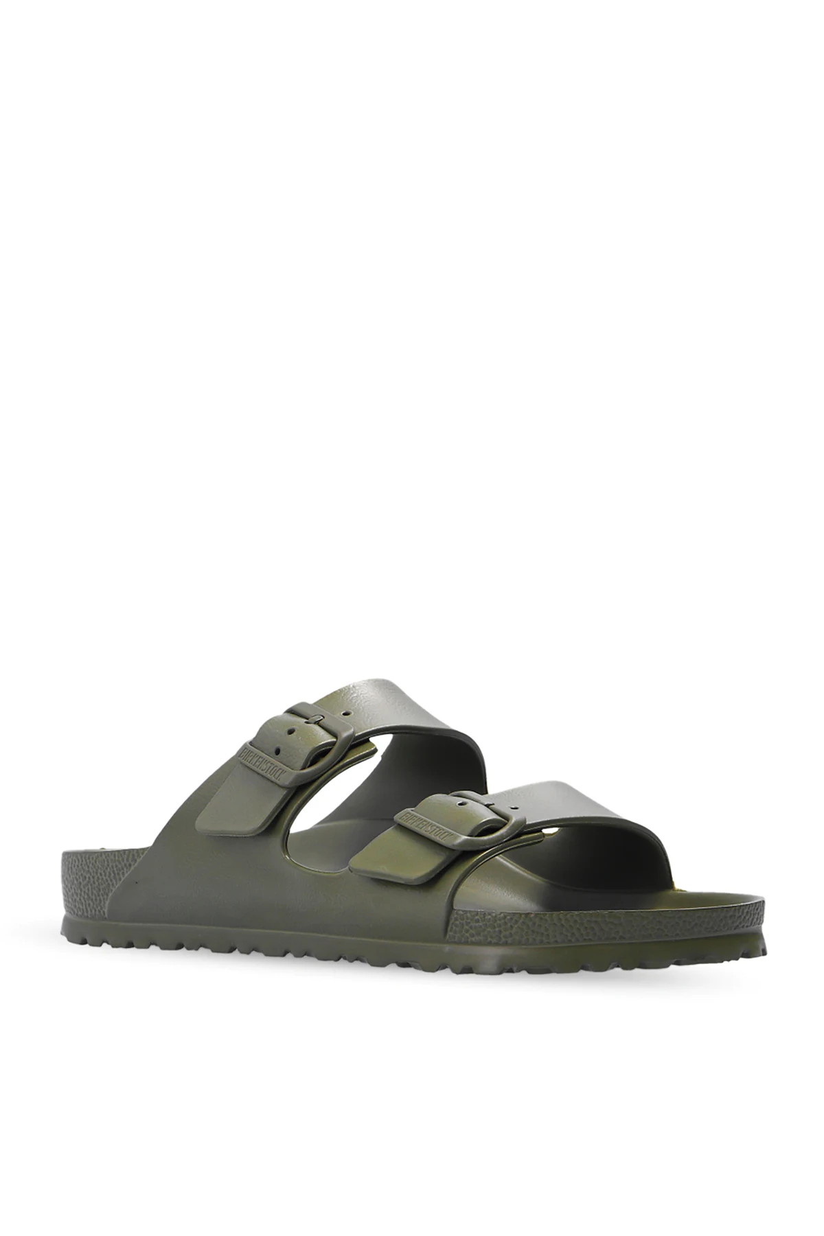 Ciemnozielone klapki, model ‘Arizona EVA’ Birkenstock. Wykonane z pianki EVA. Paski z klamrami w kolorze ciemnozielonym z wytłoczonym logo. Ciemnozielona podeszwa wykonana z pianki EVA.