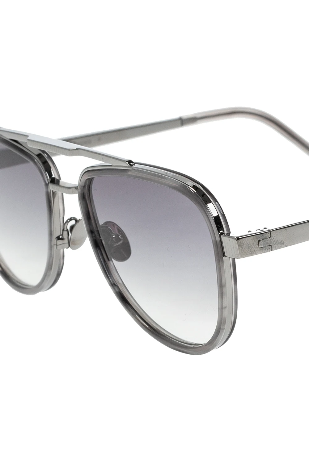 Okulary przeciwsłoneczne w kolorze srebrnym, model ‘Jim’ John Dalia. Inspirowane modą lat 80. Pokryte 22-karatowym złotem. Wewnątrz nauszników nadrukowane logo oraz nazwa modelu. Podwójny nosek. Szare, certyfikowane soczewki UVA/UVB. Dołączone etui.