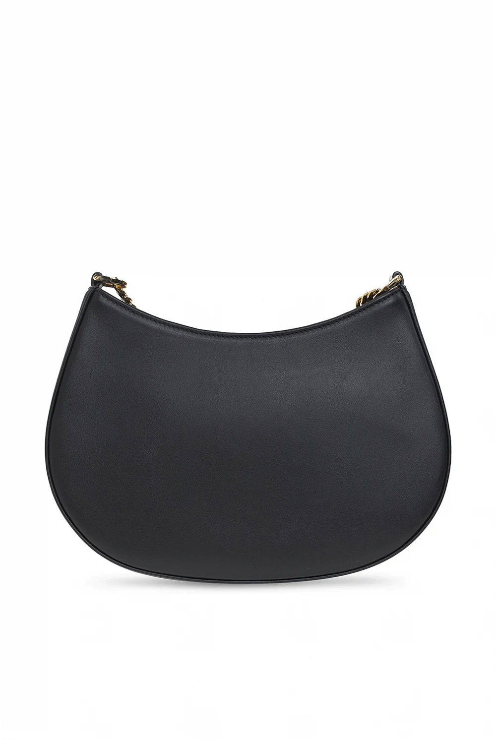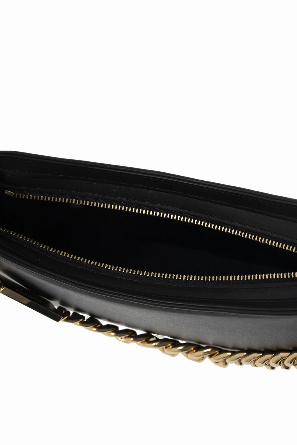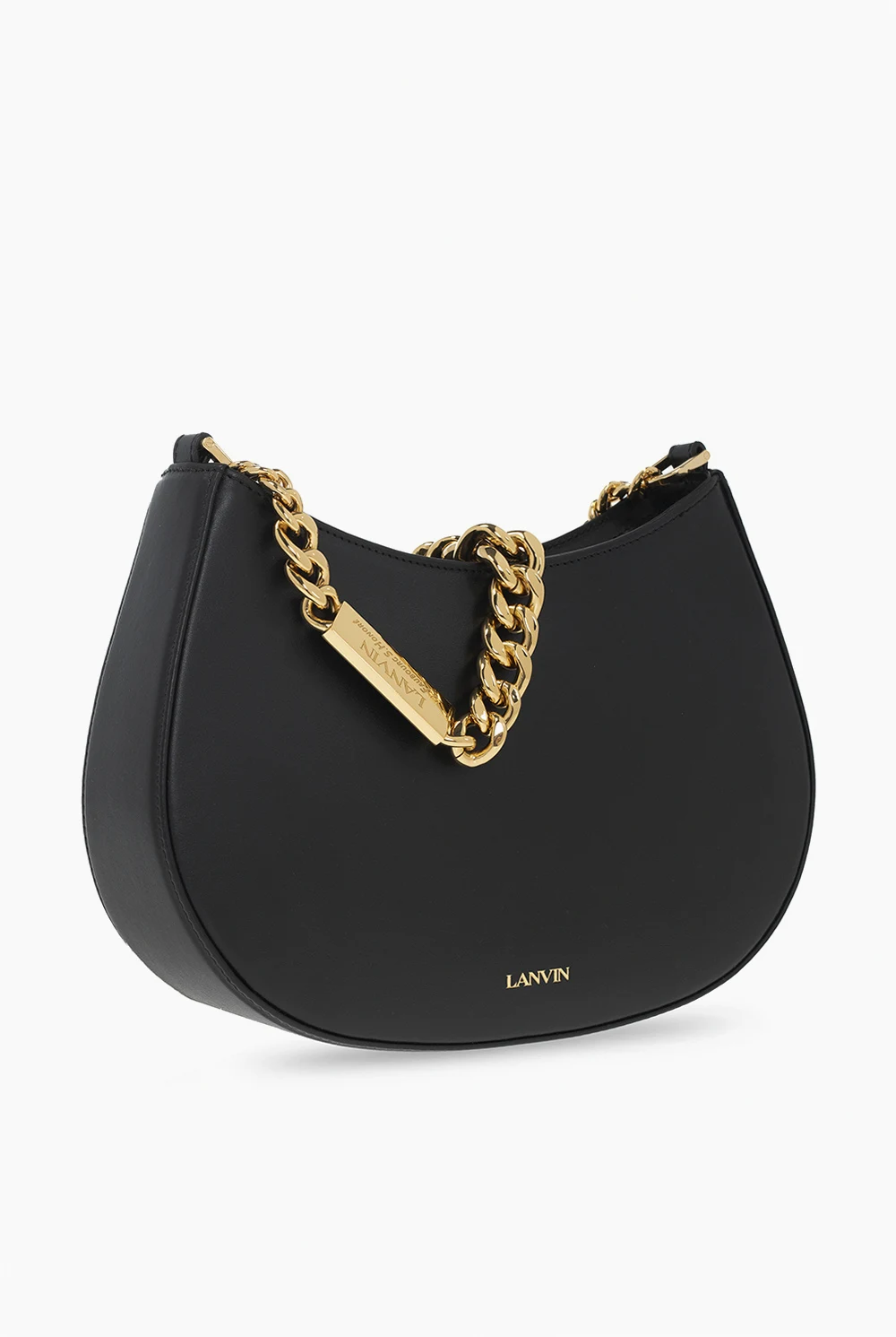 Czarna torba do ręki Lanvin. Wykonana ze skóry cielęcej. Zamykana na zamek. Ozdobiona wzorem z logo. Łańcuch do ręki. Odpinany pas na ramię z możliwością regulacji długości. Wewnątrz komora oraz kieszeń zamykana na zamek. Metalowe wykończenie w kolorze złotym.