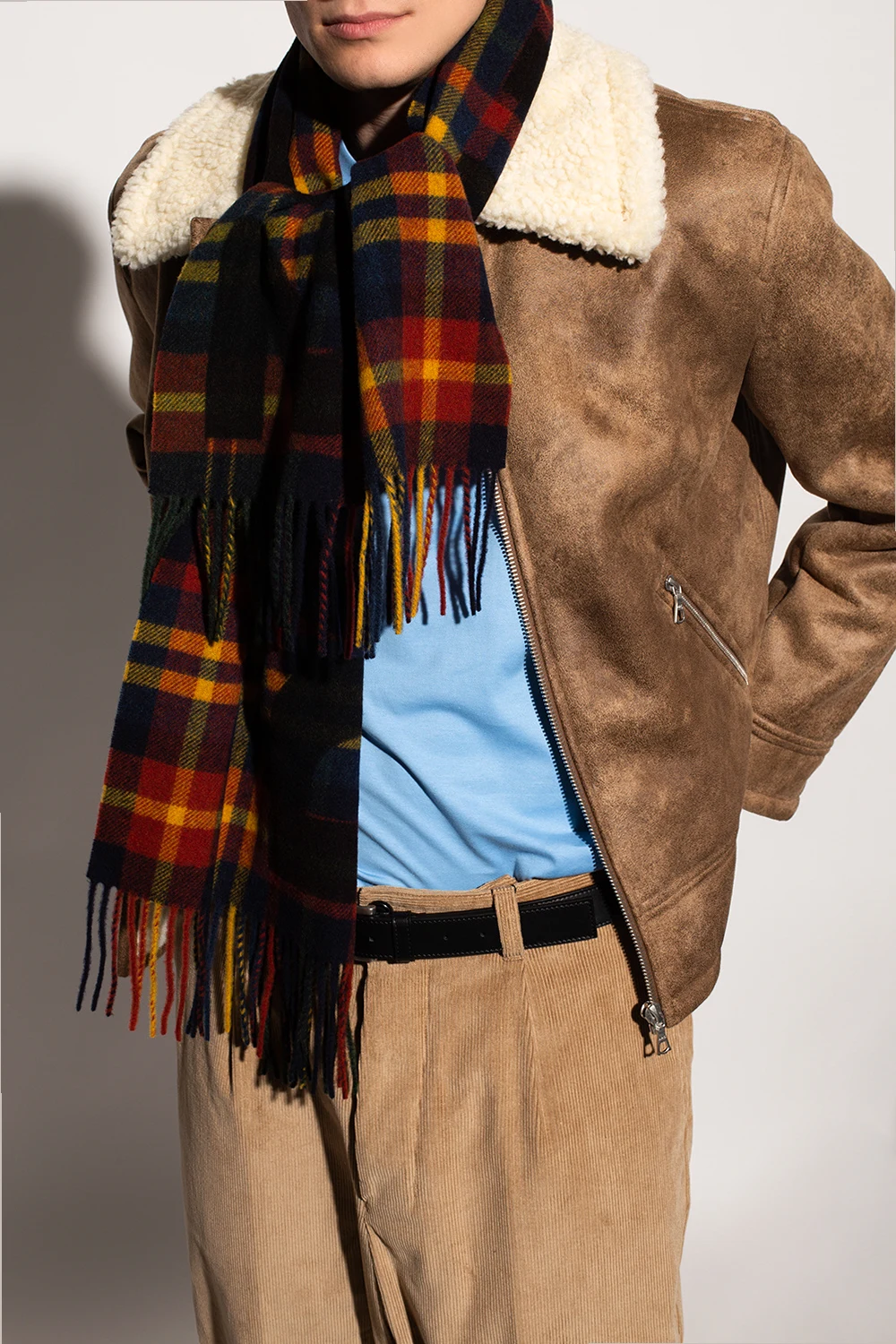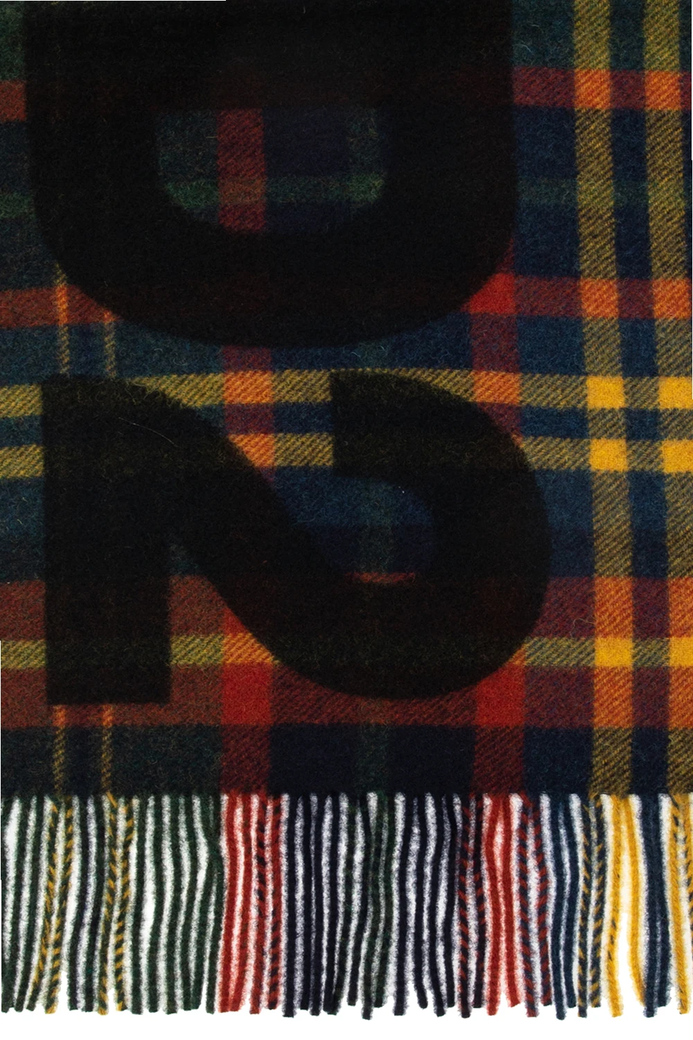 Kolorowy szal Dsquared2. Wykonany z wełny. Wzór w kratę. Nadrukowane logo. Zakończony frędzlami.