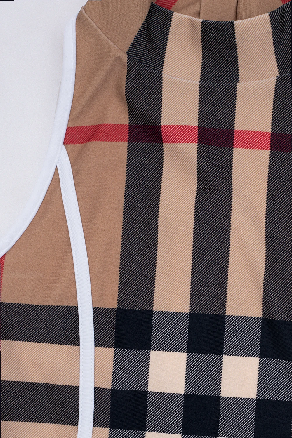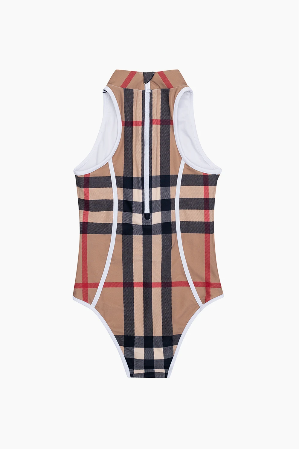 Brązowy, jednoczęściowy kostium kąpielowy Burberry Kids. Z tyłu zapinany na krótki zamek. Ozdobiony wzorem z motywem kraty w kolorze czarno-biało -czerwonym. Wykończony białymi lamówkami.