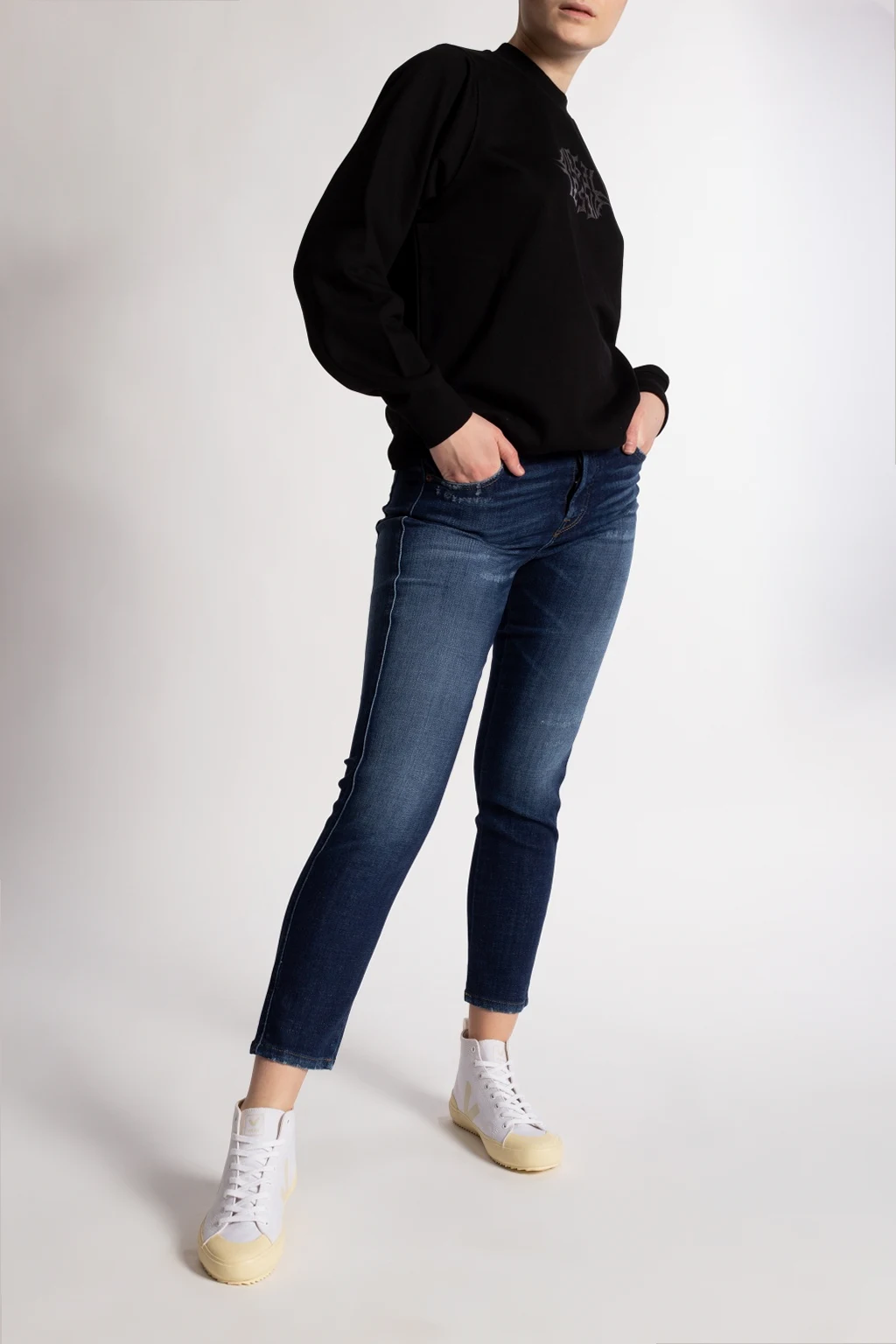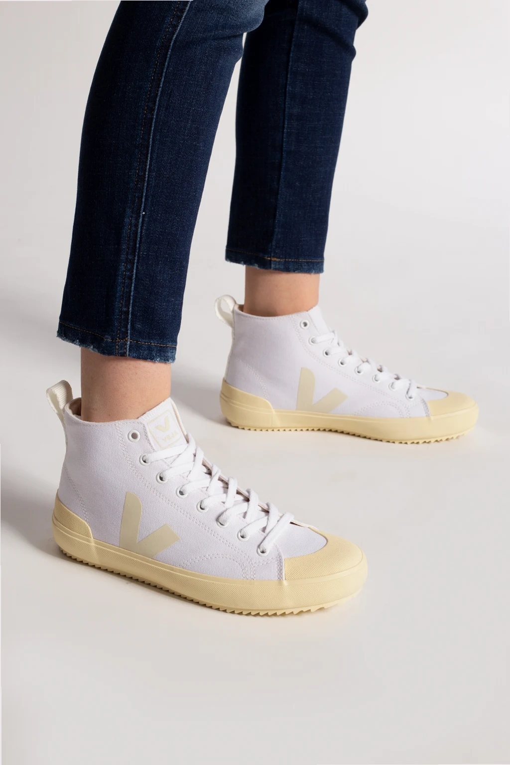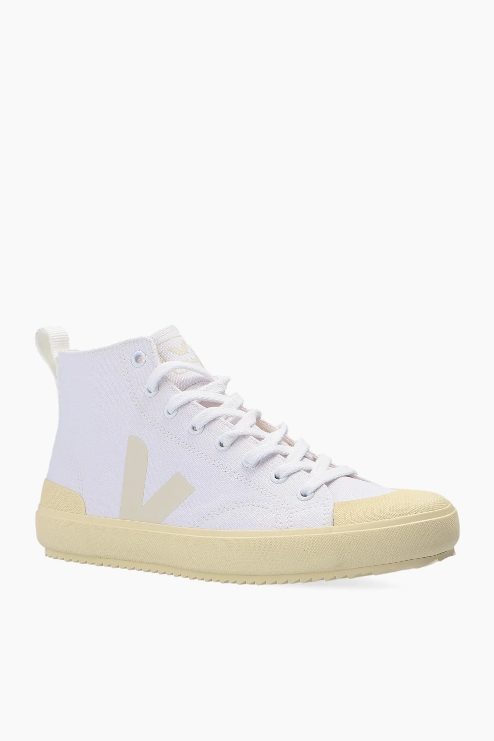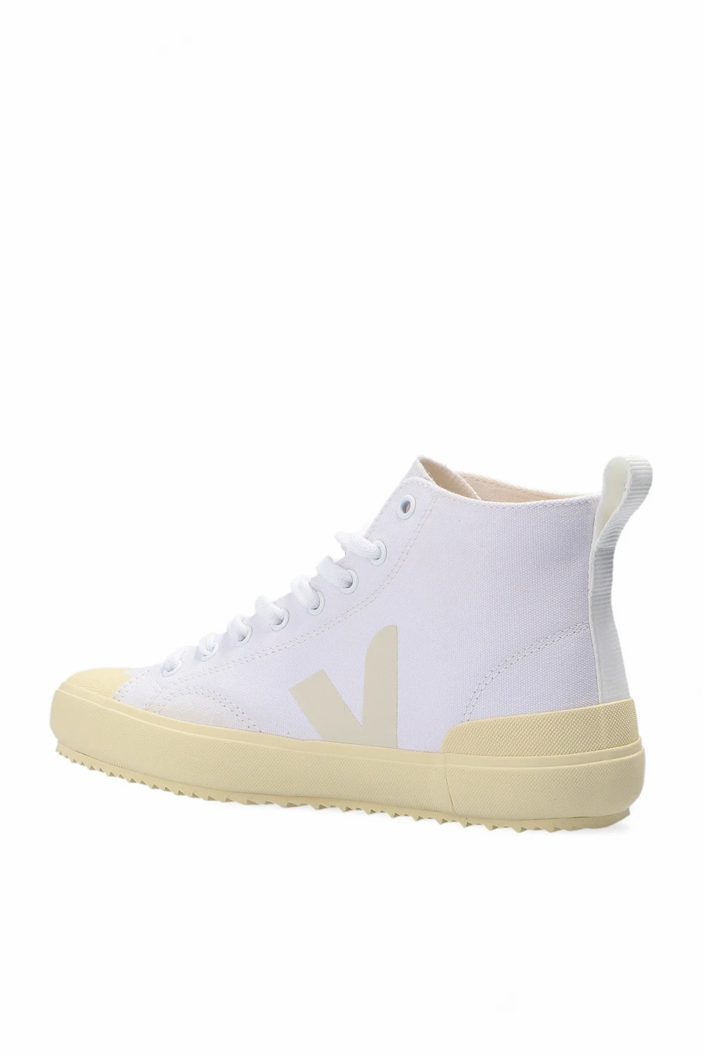 Białe, sznurowane buty sportowe za kostkę, model ‘Nova HT’ Veja. Dekoracyjne przeszycia. Nadrukowane logo w kolorze beżowym. Z tyłu biały, rypsowy pasek. Jasnożółta, gumowa podeszwa.