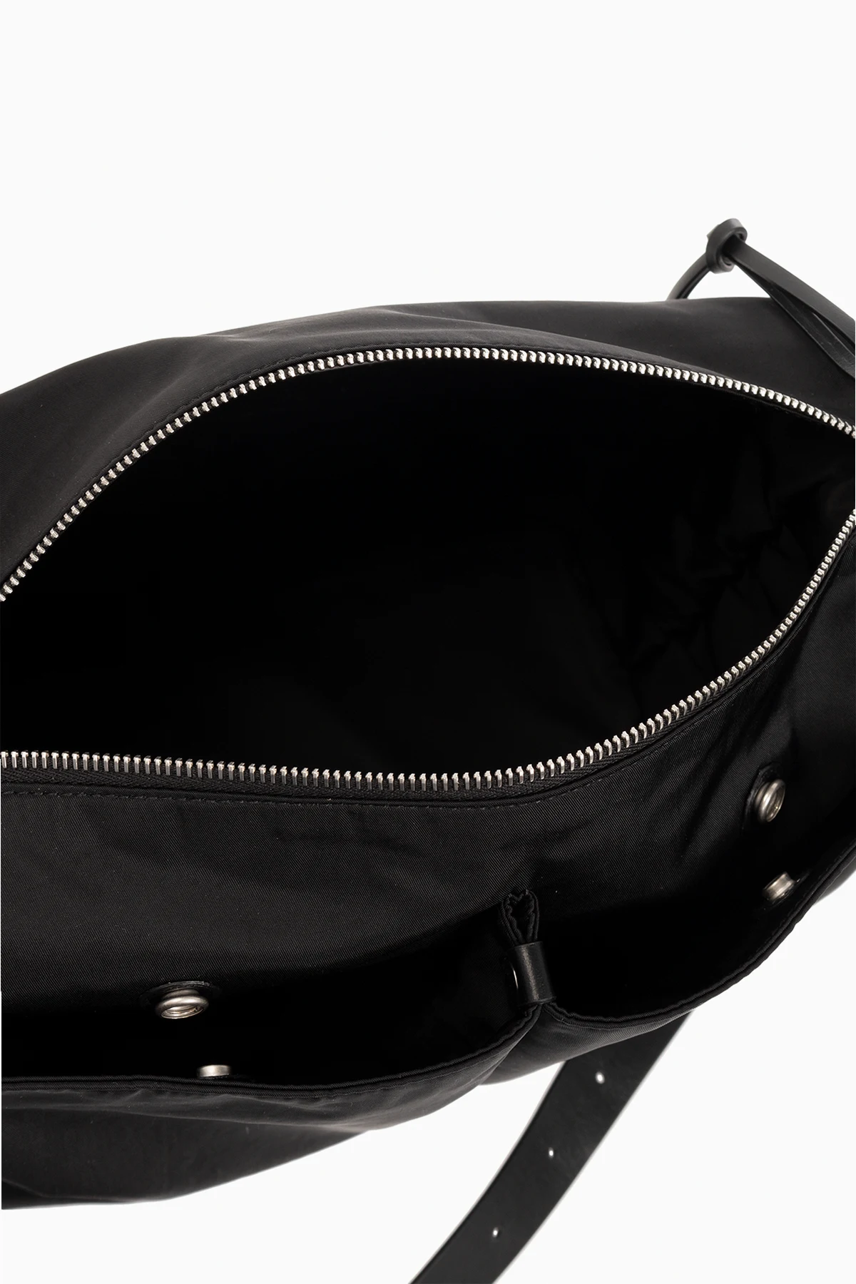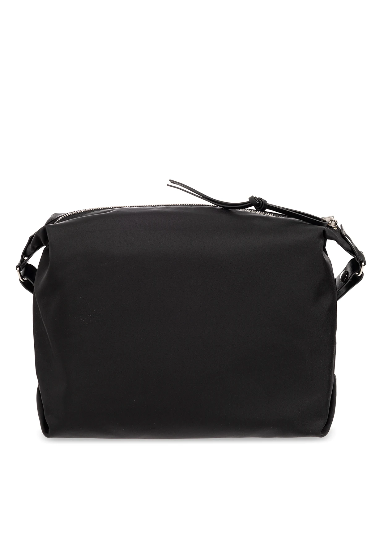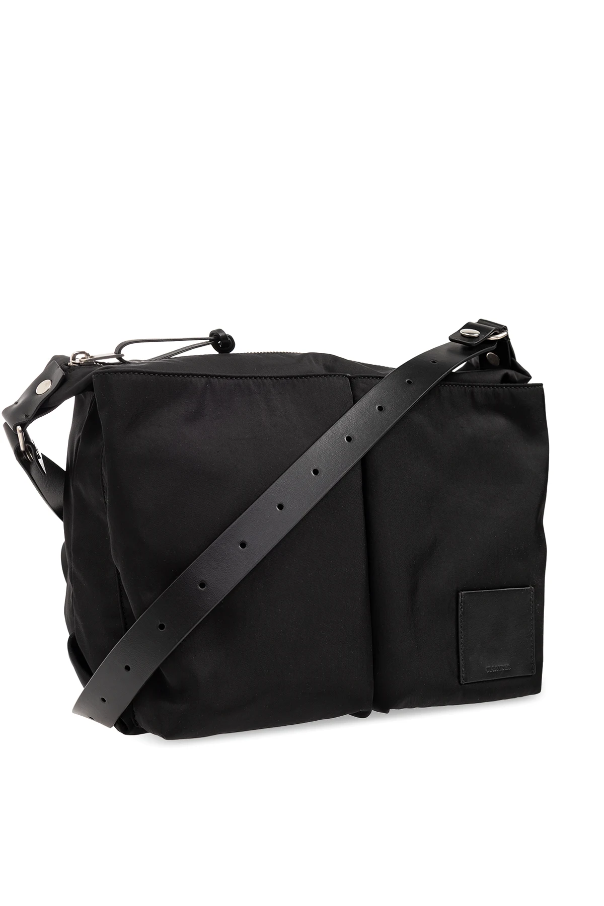 Czarna torba na ramię, model ‘Pilot’ JIL SANDER. Wykonana z tkaniny technicznej i wykończona skórą bydlęcą. Zamykana na zamek. Z przodu naszywka z wytłoczonym logo. Dwie kieszenie zamykane na zatrzaski. Regulowany pas na ramię. Wewnątrz komora ze wsuwaną kieszenią. Metalowe wykończenie w kolorze srebrnym.