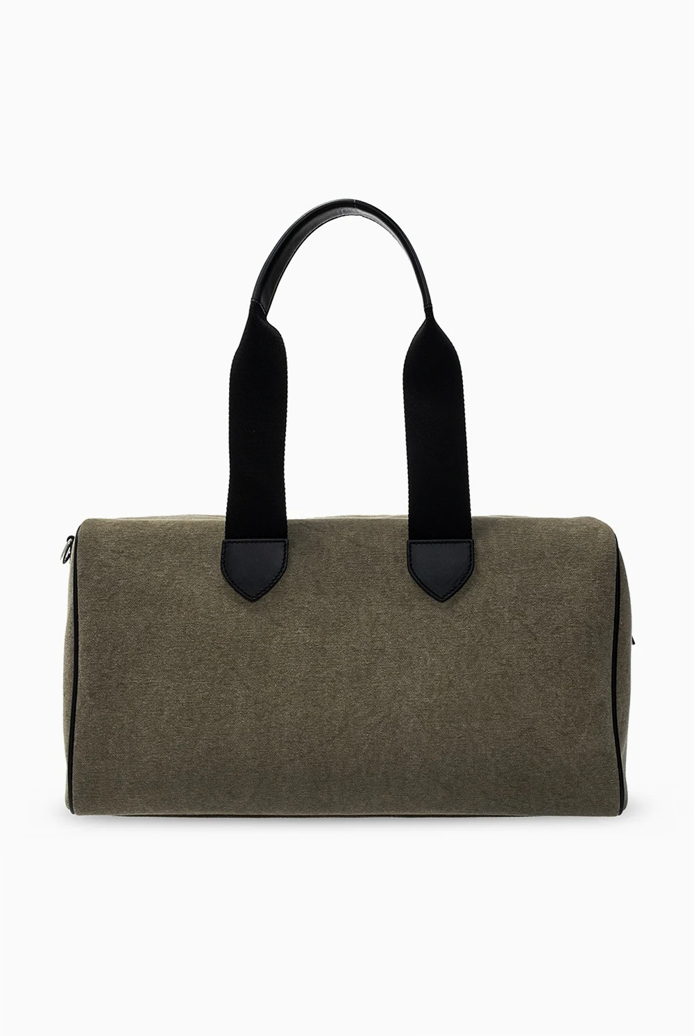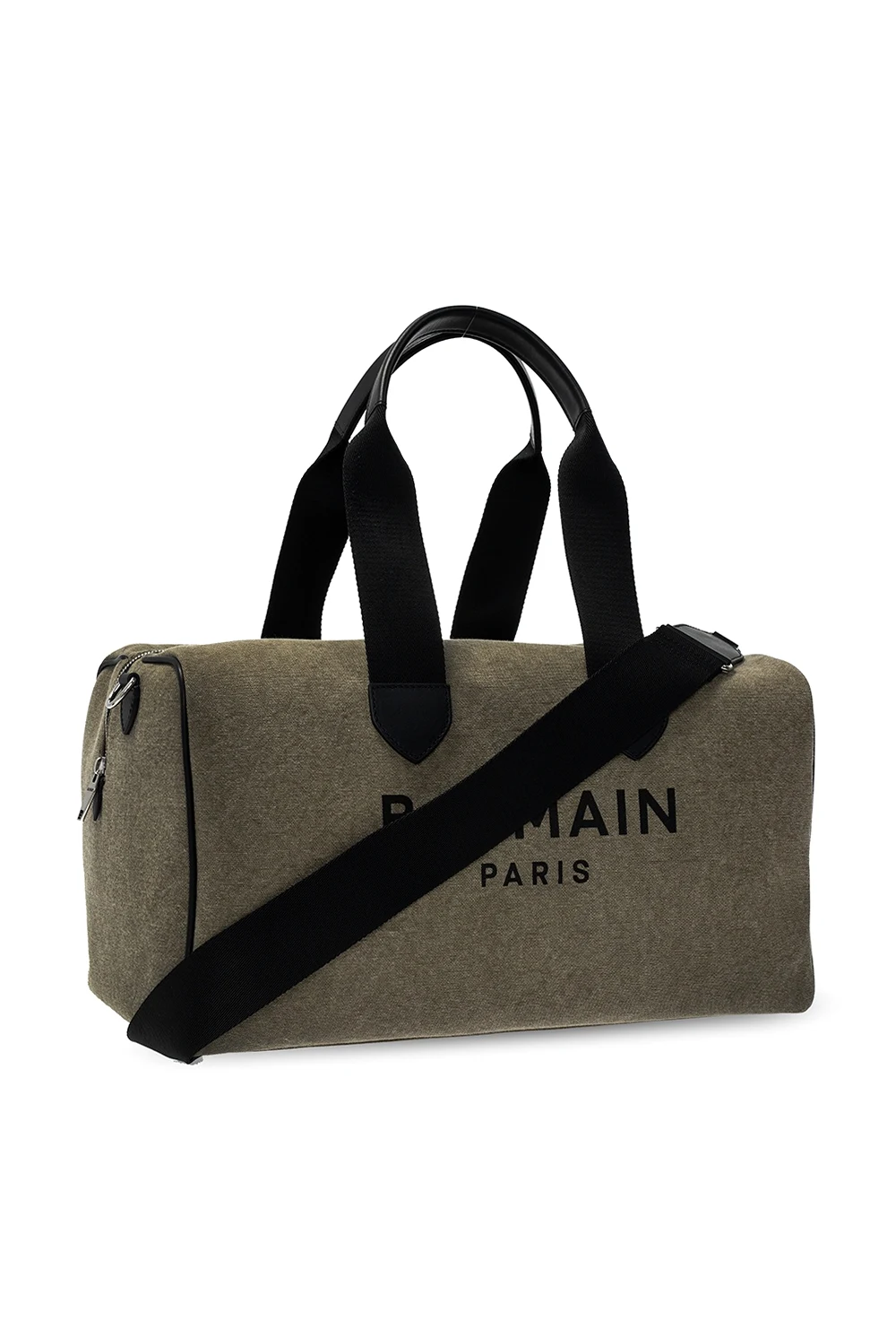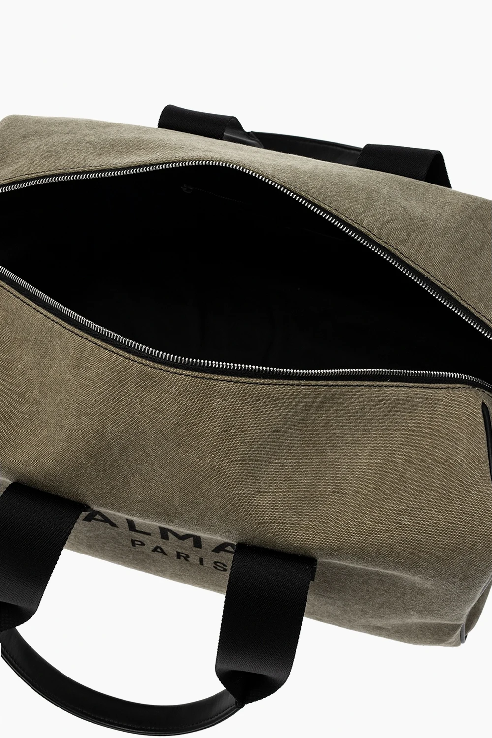 Zielono-szaro-czarna torba podręczna Balmain. Wykonana z bawełny. Wykończona skórą cielęcą. Zapinana na zamek. Z przodu nadrukowane logo w kolorze czarnym. Dwie półokrągłe rączki. Odpinany, regulowany pasek na ramię. Wewnątrz komora, kieszeń zamykana na zamek i miejsce na kartę. Metalowe elementy w kolorze srebrnym.