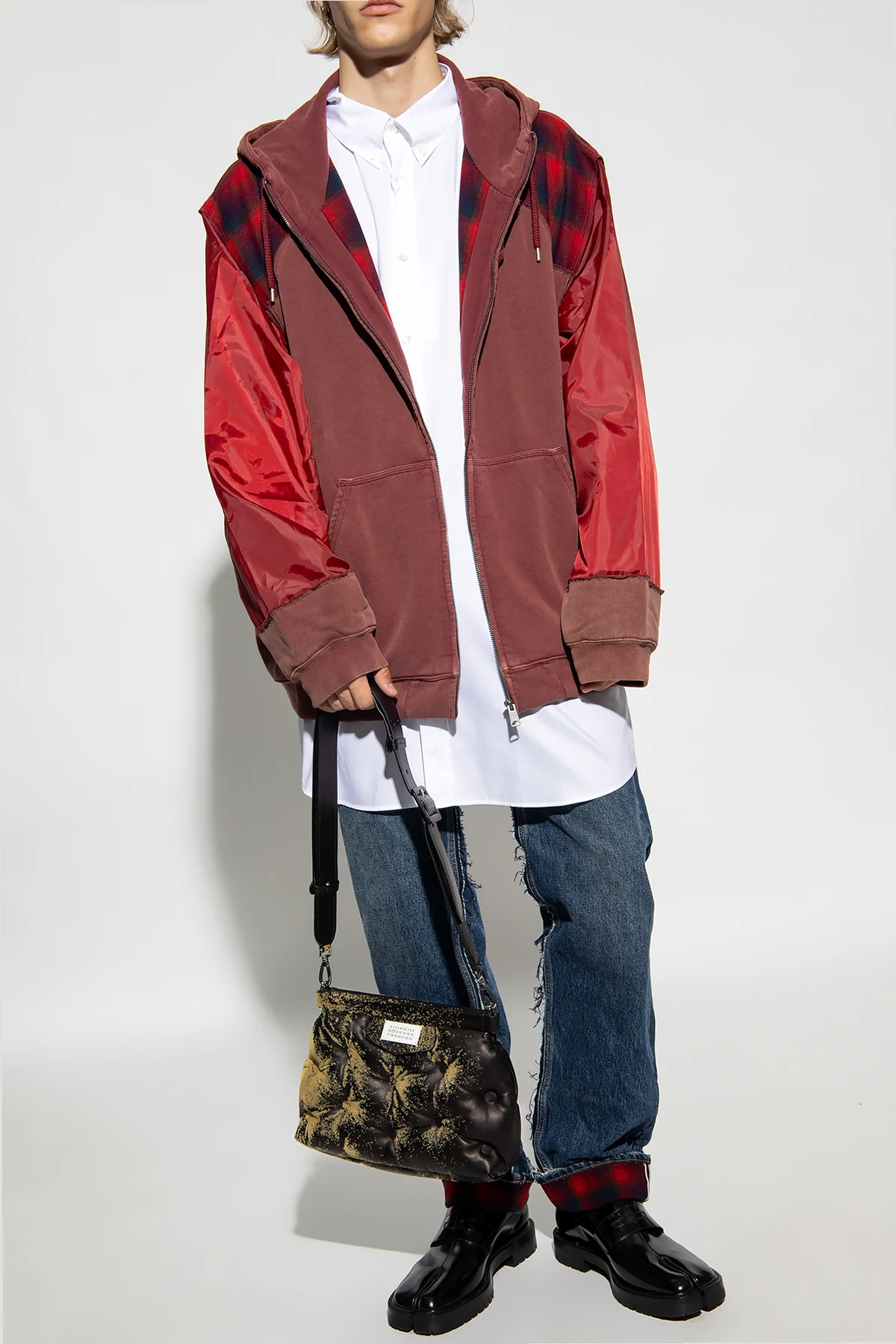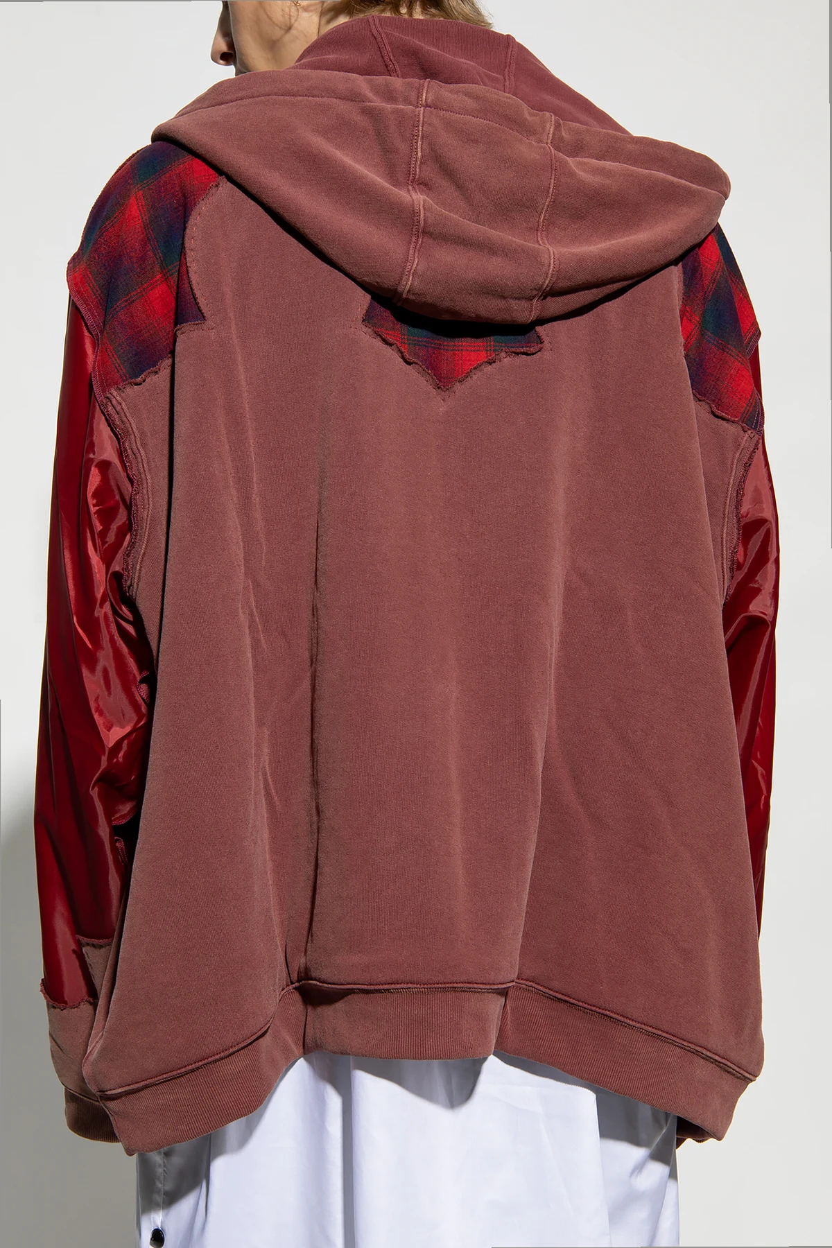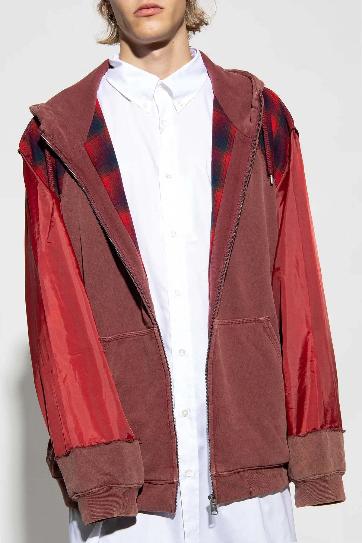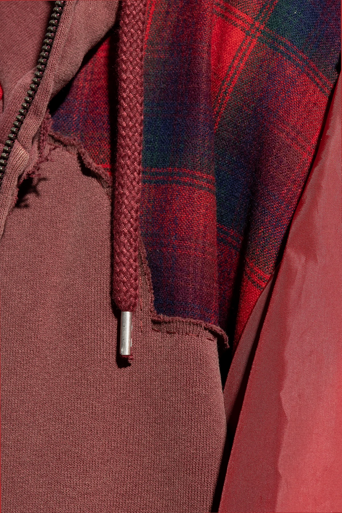 Bordowa bluza Maison Margiela. Wykonana z bawełny. Zapinana na zamek. Ozdobiona wstawkami ze wzorem w kratę oraz efektem znoszenia. Dwie wsuwane kieszenie. Kaptur ściągany trokami. Dół i długie rękawy wykończone ściągaczem.