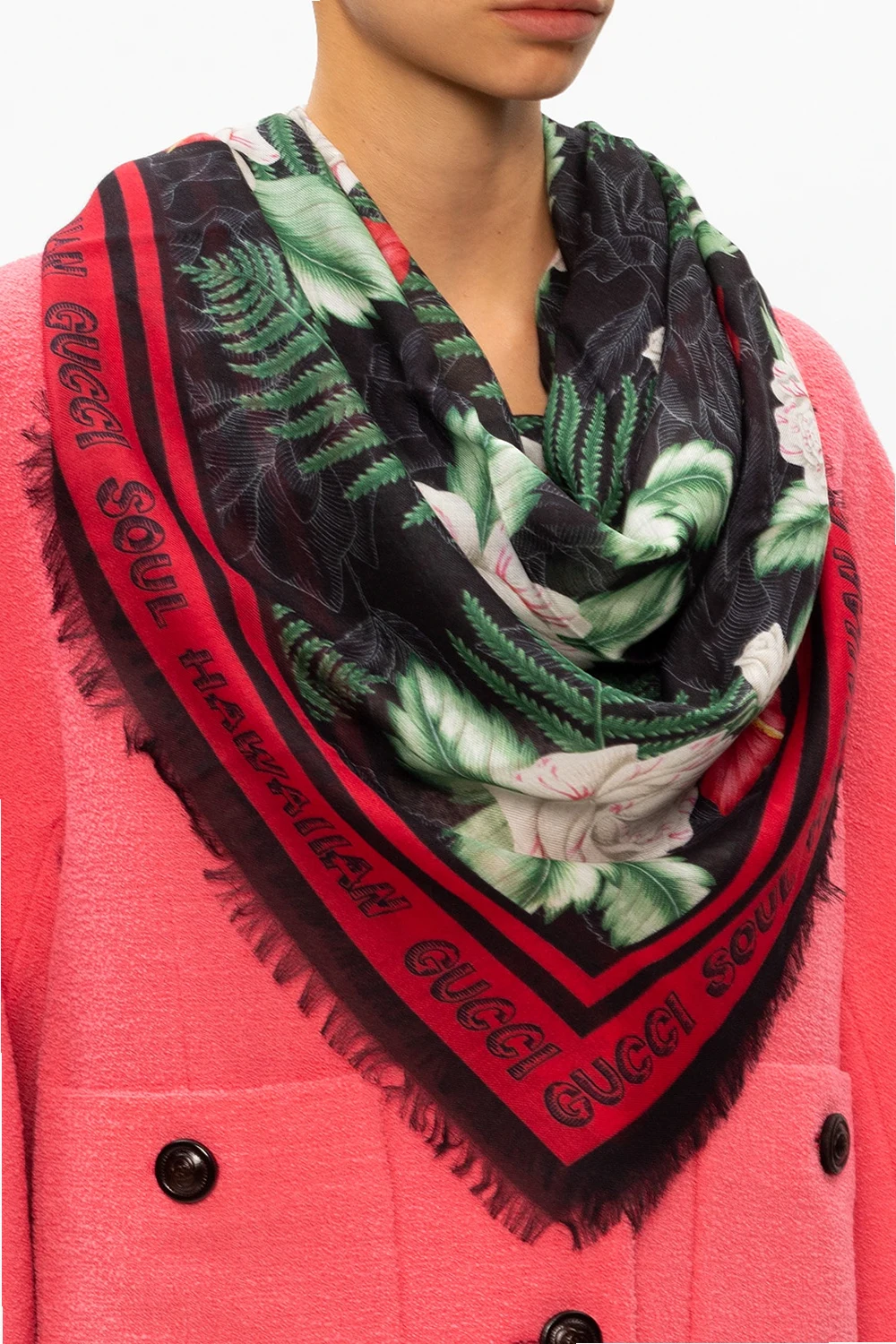 Kolorowa chusta Gucci. Ozdobiona wzorem 'Hawaiian Gucci Soul'.