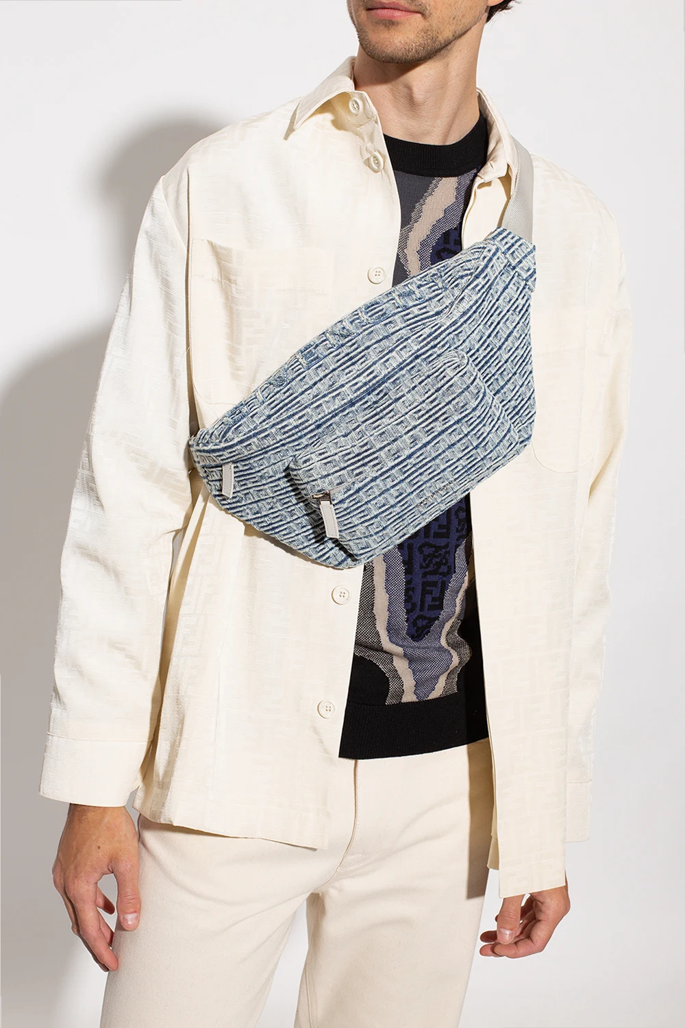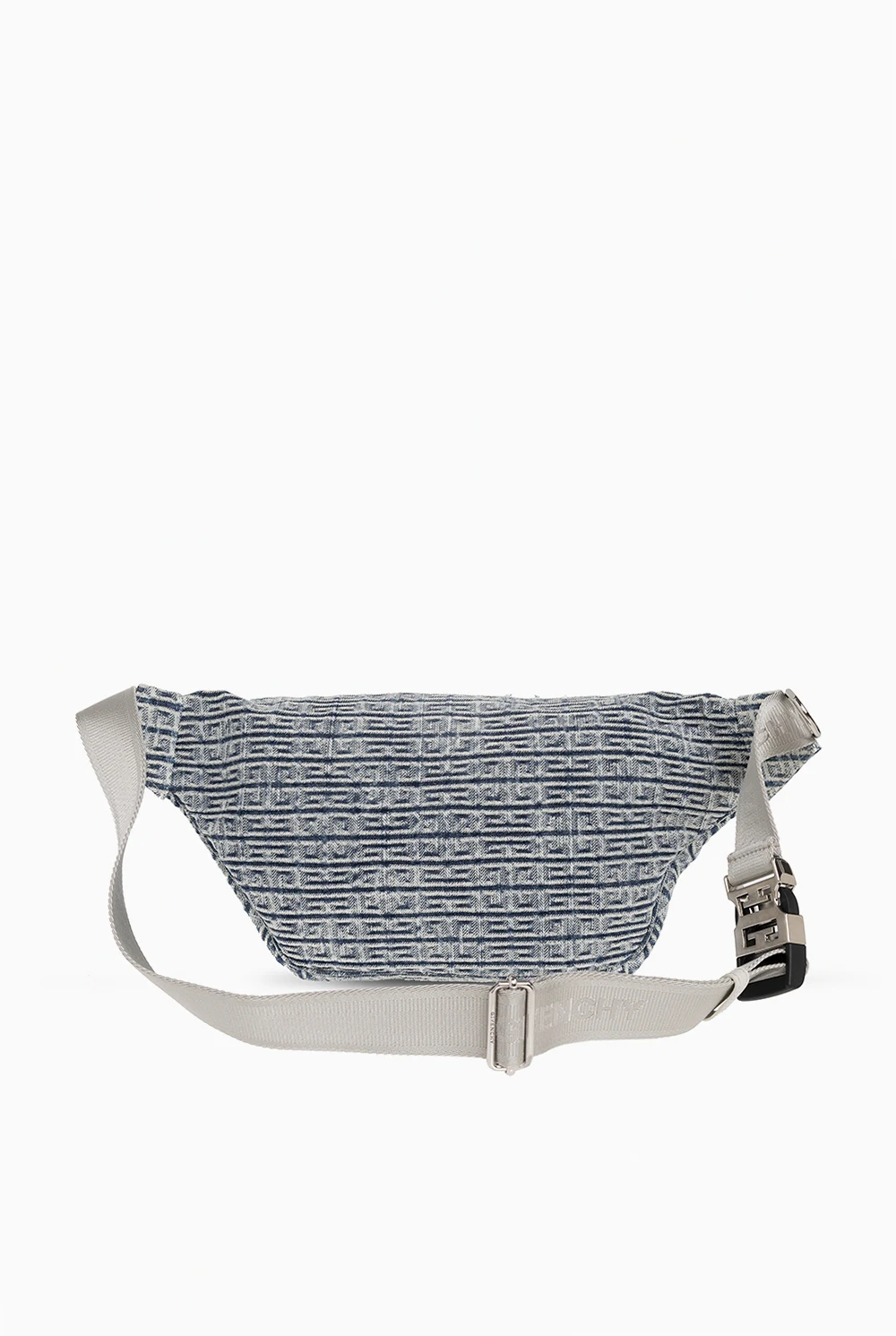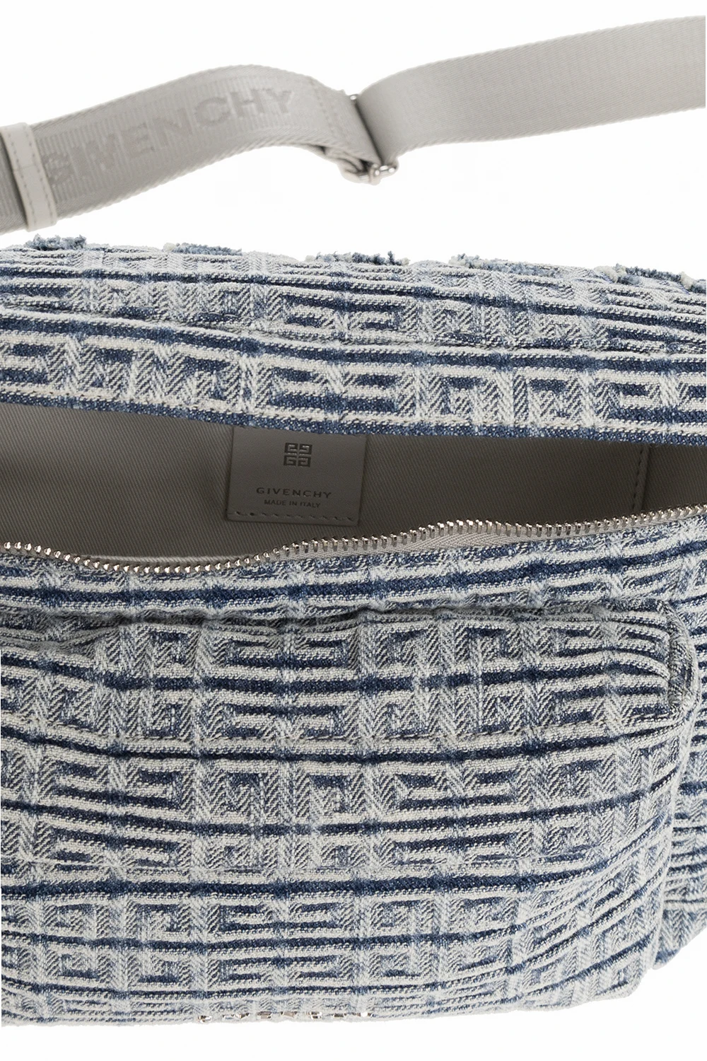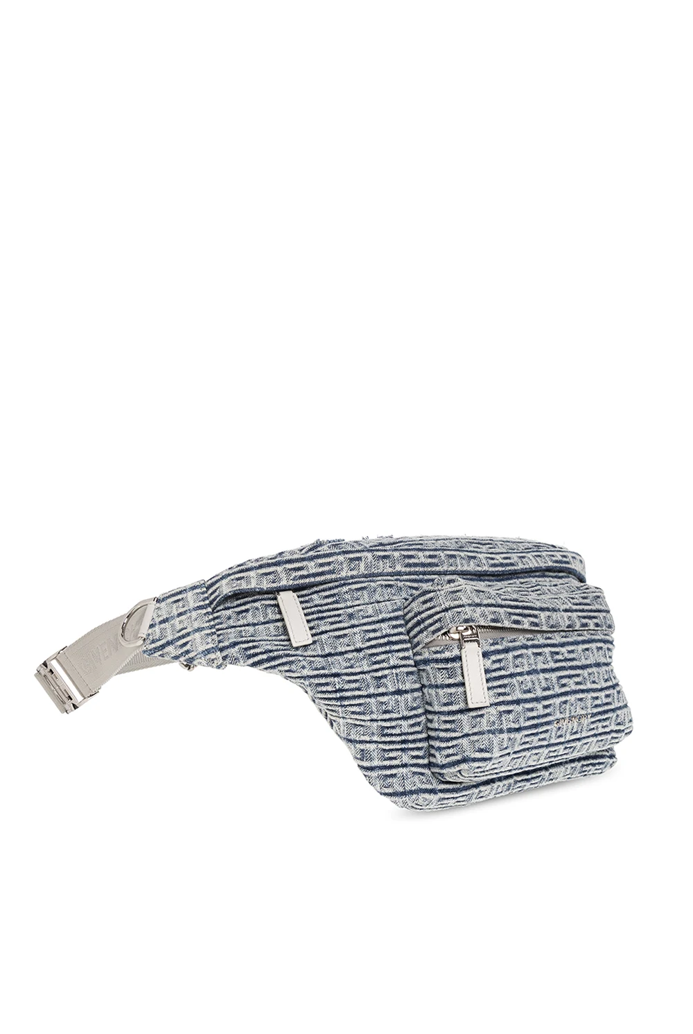 Niebiesko-biała torba na pas, model ‘Essential’ Givenchy. Wykonana ze skóry cielęcej i bawełny. Zapinana na zamek. Ozdobiona wzorem z monogramem. Z przodu kieszeń zamykana na zamek. Pas biodrowy z możliwością regulacji długości. Wewnątrz komora oraz wsuwana kieszeń. Metalowe wykończenie w kolorze srebrnym.