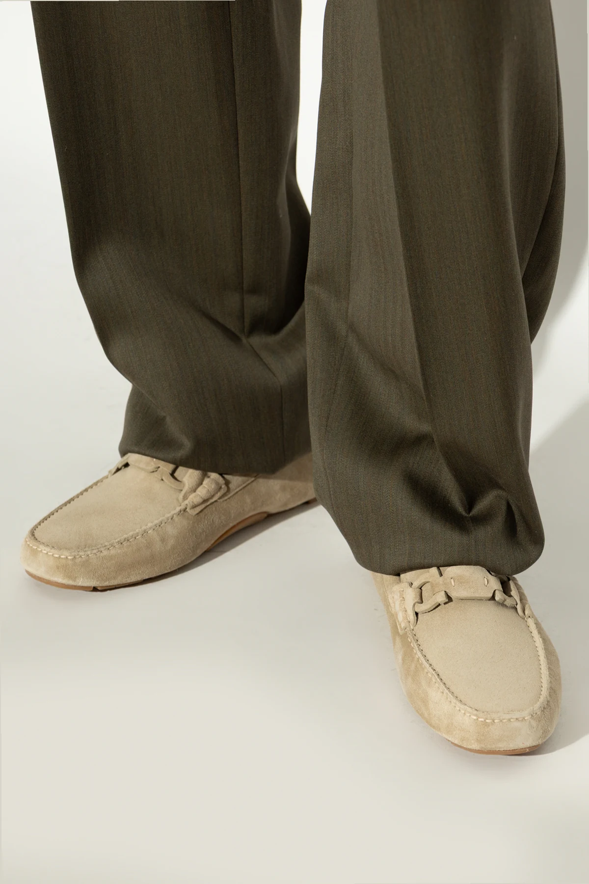 Wykonane z najwyższej jakości zamszu, mokasyny te zachwycają miękkością i subtelną elegancją. Wnętrze wykończone skórą zapewnia komfort noszenia, a zaokrąglony nosek i ozdobne wiązanie na przodzie dodają im charakteru. Widoczne przeszycia wokół krawędzi potwierdzają ich wyjątkową jakość i styl.