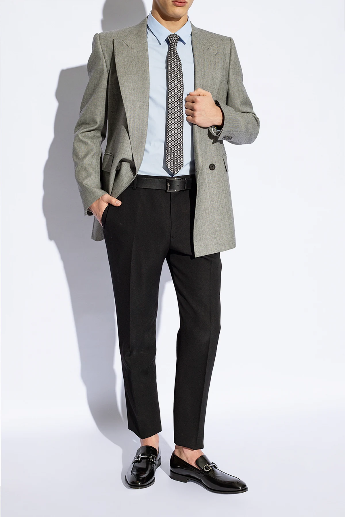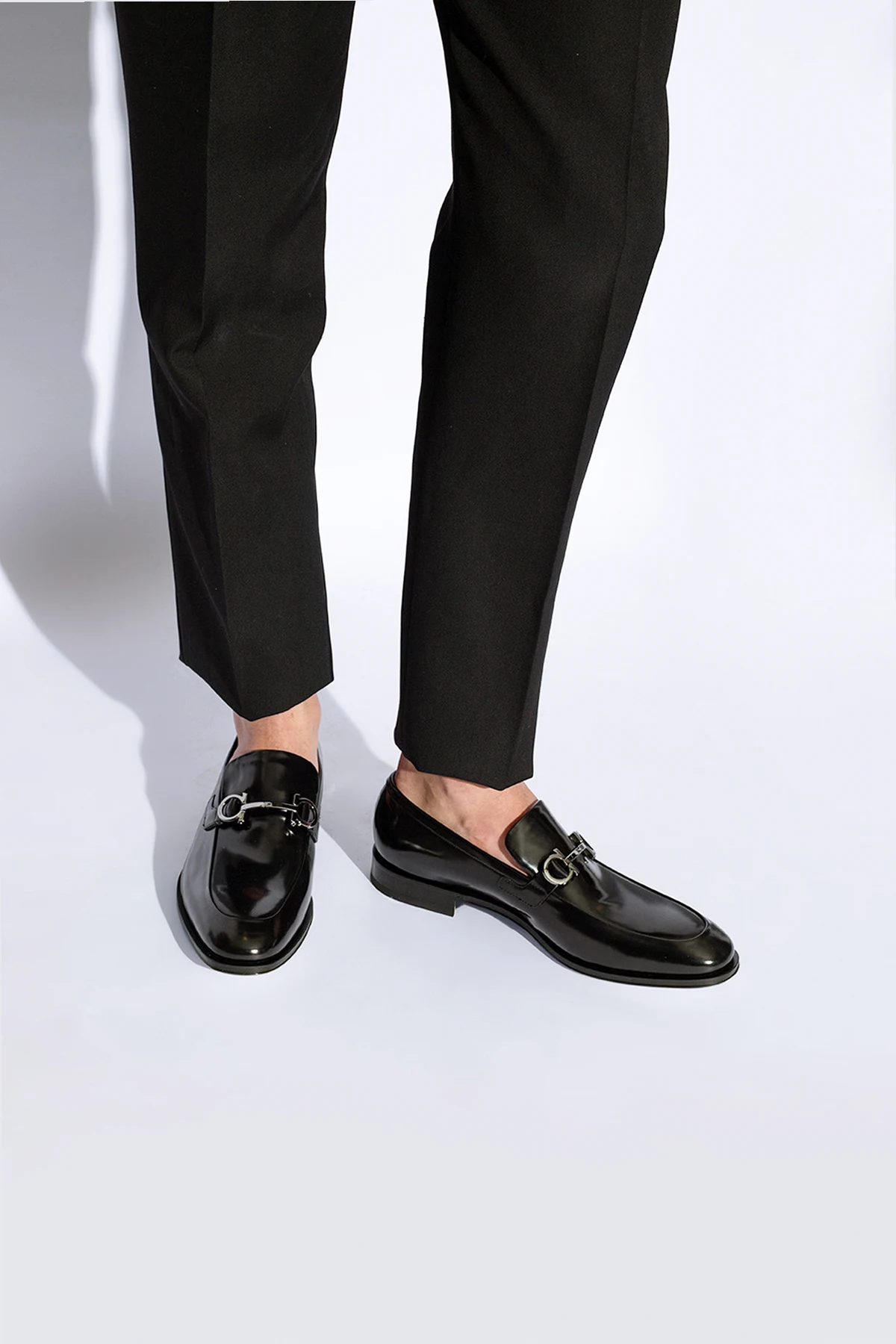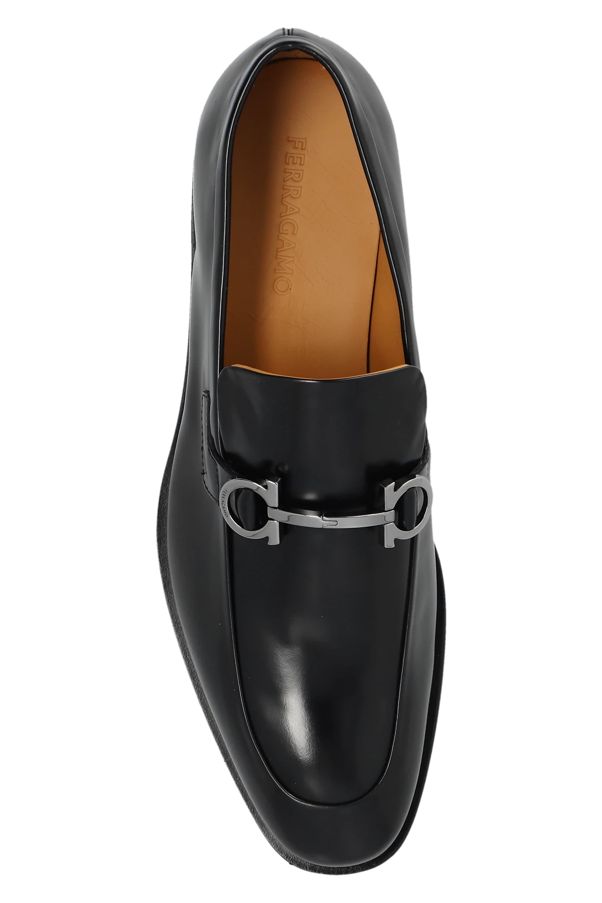Czarne buty, model ‘Finley’ FERRAGAMO. Wykonane ze skóry. Ozdobione aplikacją z logo ‘Gancini’. Beżowa, skórzana podeszwa. Wkładka o dużej szerokości.