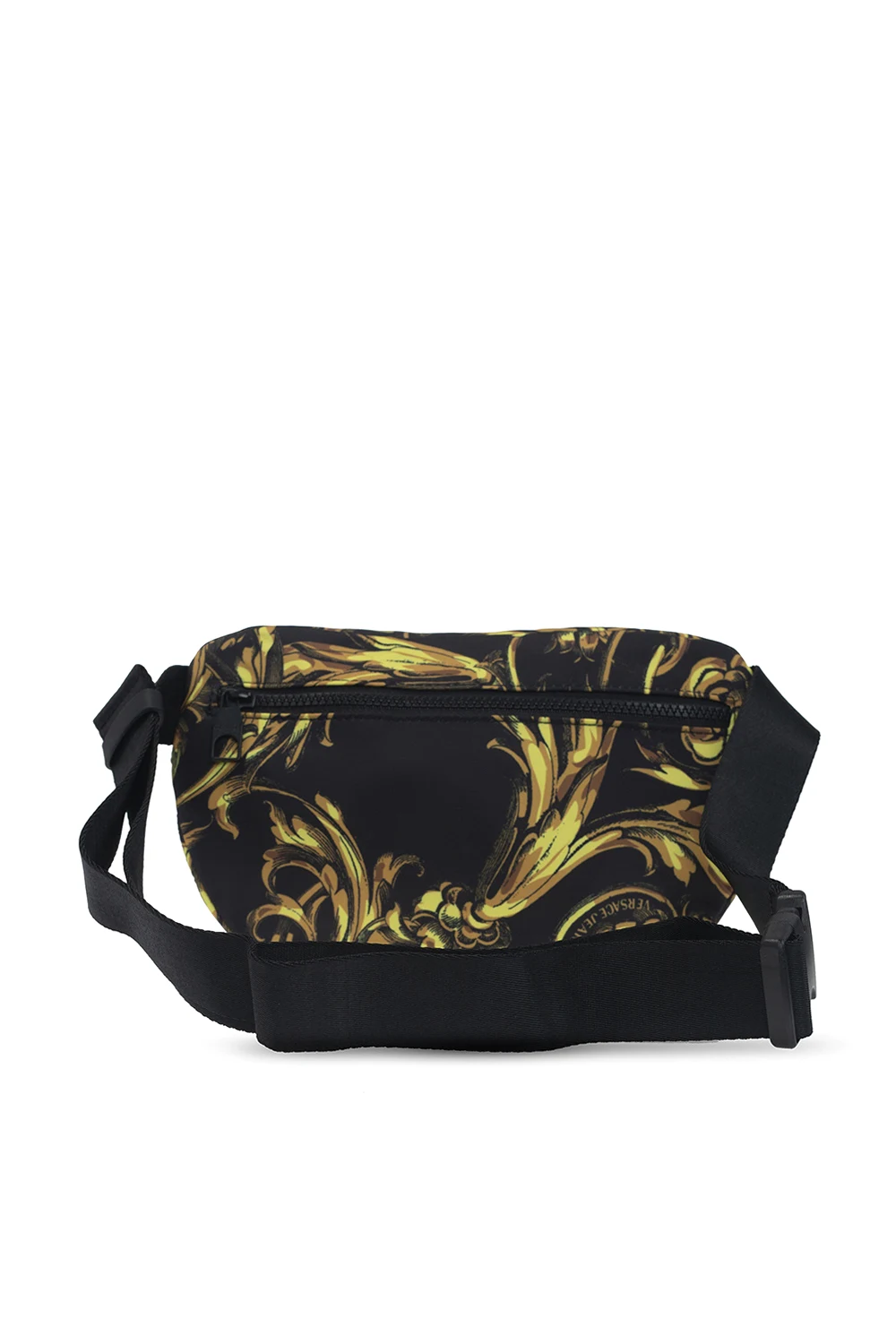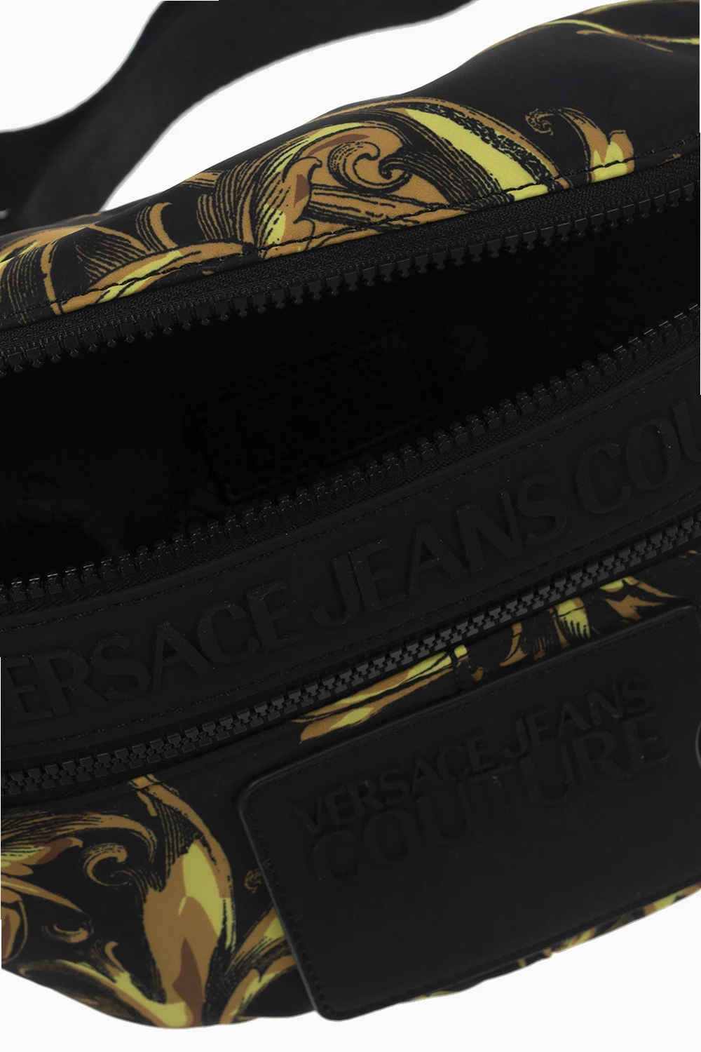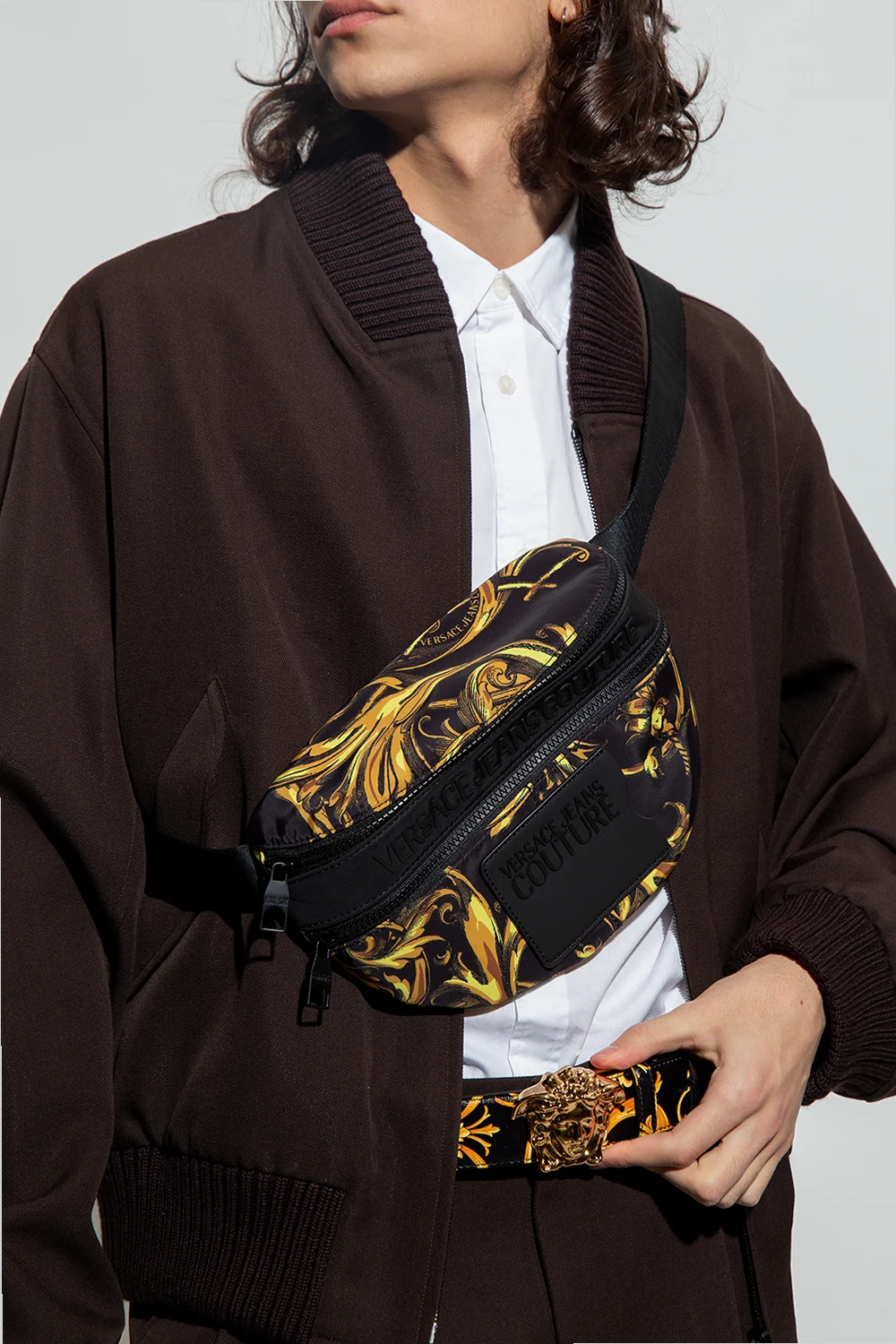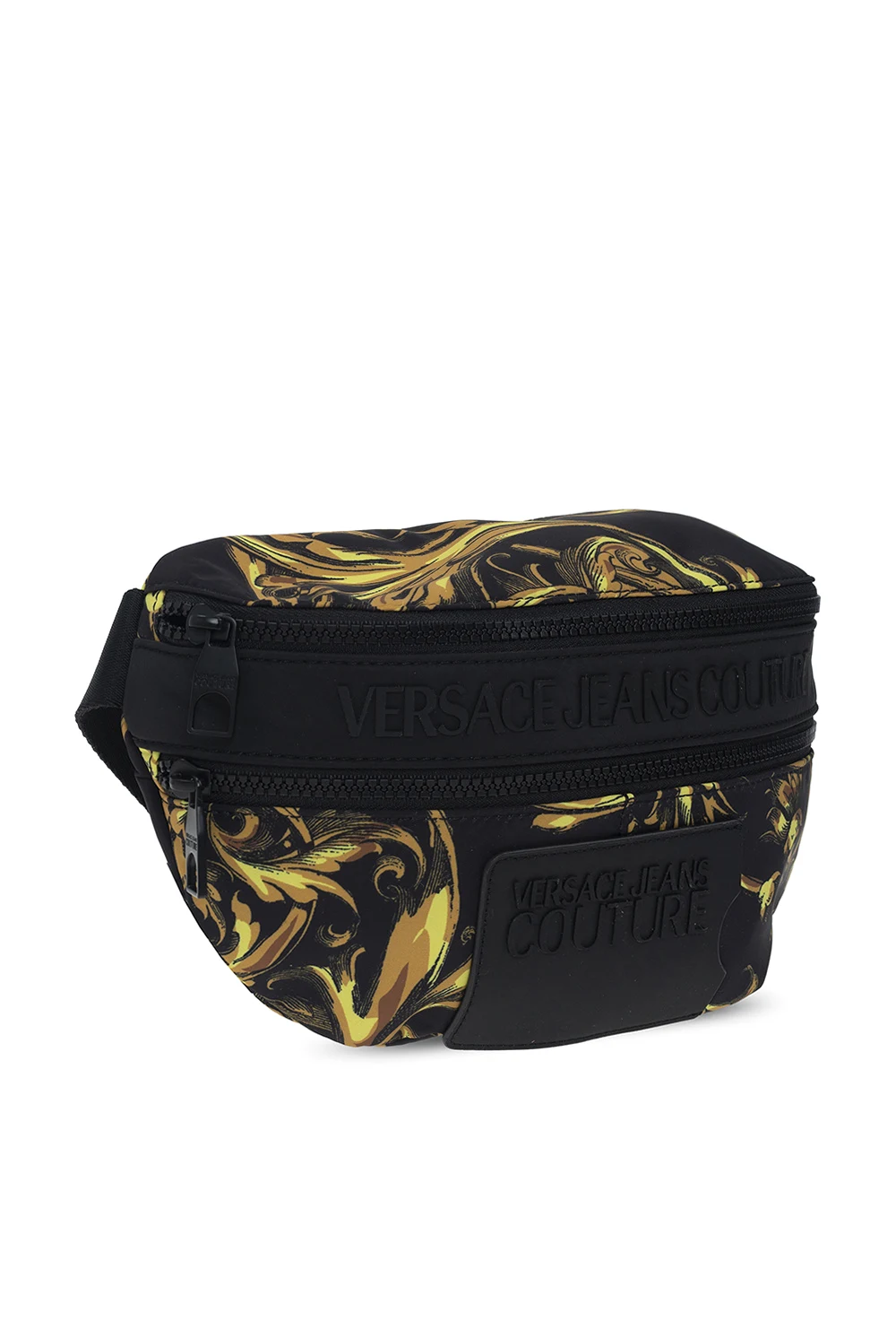 Czarna torba na pas Versace Jeans Couture. Zamykana na zamek. Ozdobiona charakterystycznym dla marki wzorem z motywem barokowym w kolorze jasnobrązowo-żółtym. Z przodu wypukłe logo oraz zamykana na zamek kieszeń i miejsce na kartę z logo. Z tyłu kieszeń na zamek. Pas z możliwością regulacji długości. Wewnątrz komora z wsuwaną kieszenią.