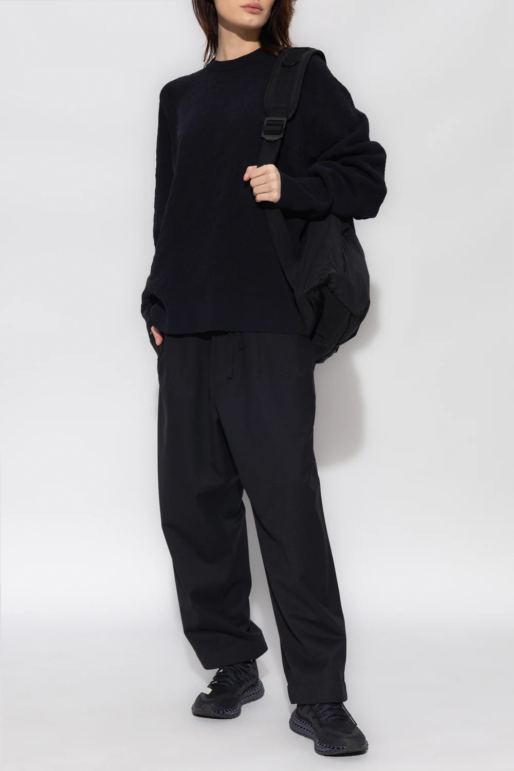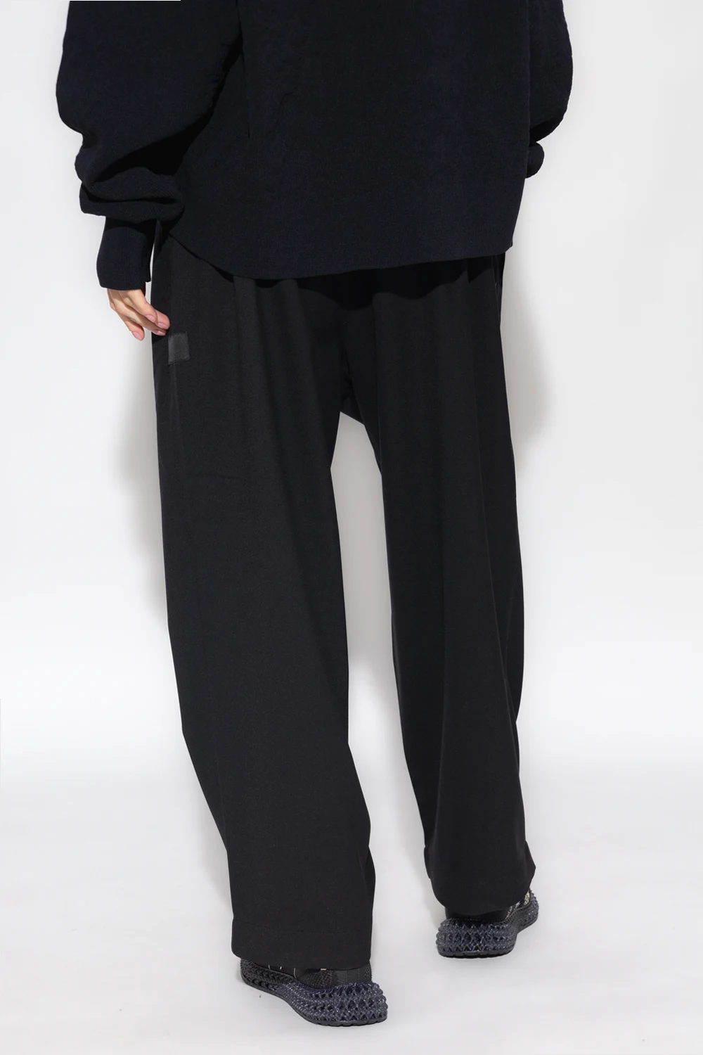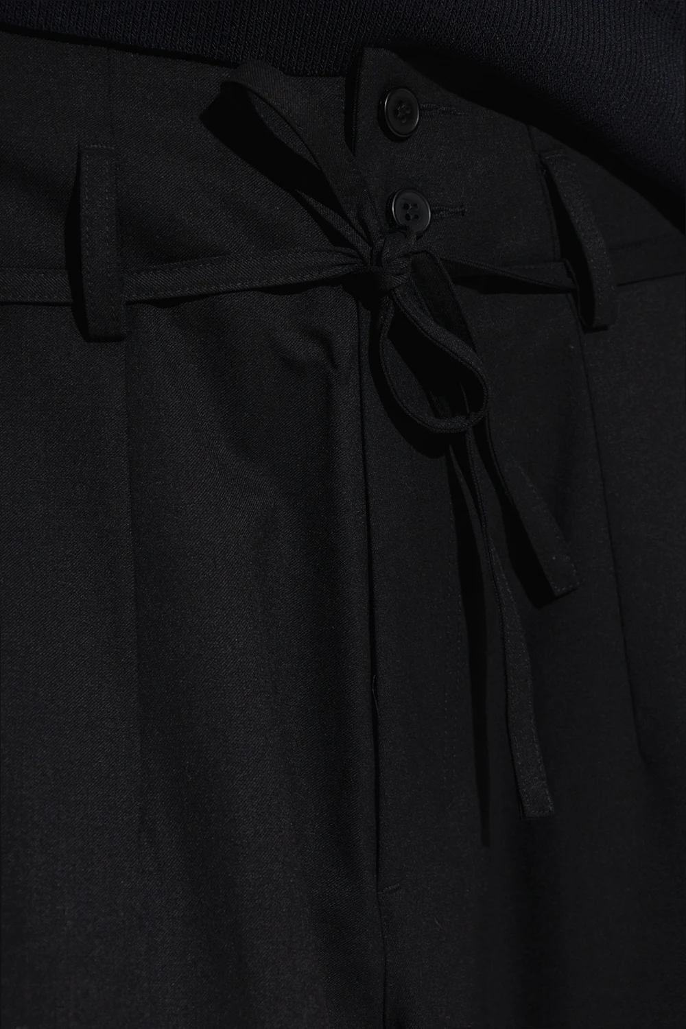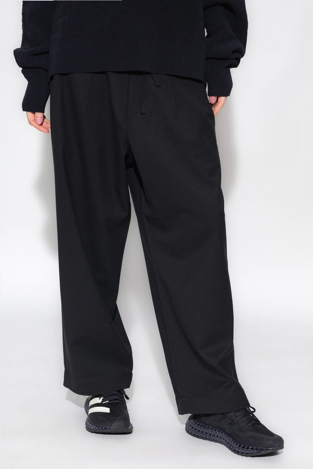 Czarne spodnie Y-3 Yohji Yamamoto. Wykonane z wełny i materiału z recyklingu. Zapinane na zamek, guziki oraz ściągane trokami. Dwie kieszenie wsuwane. Szerokie nogawki.