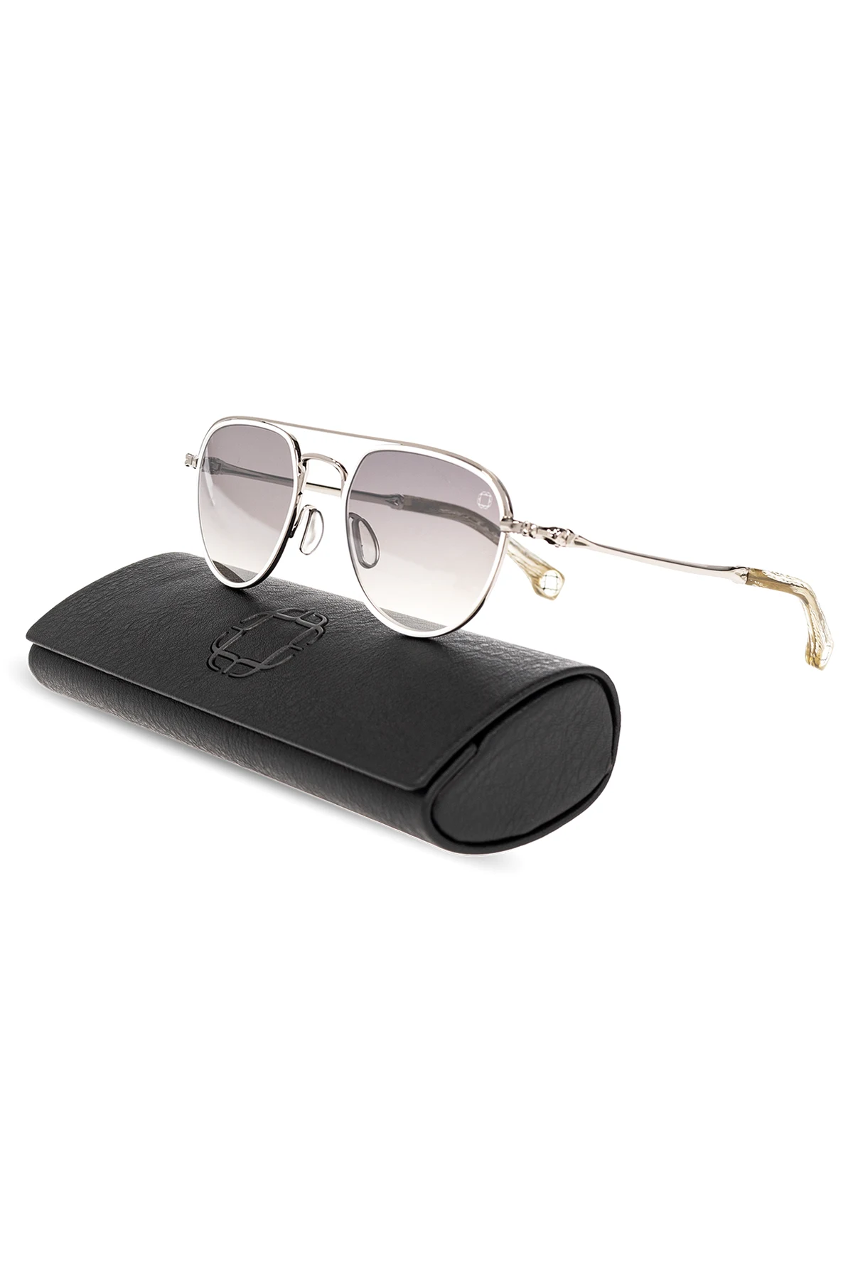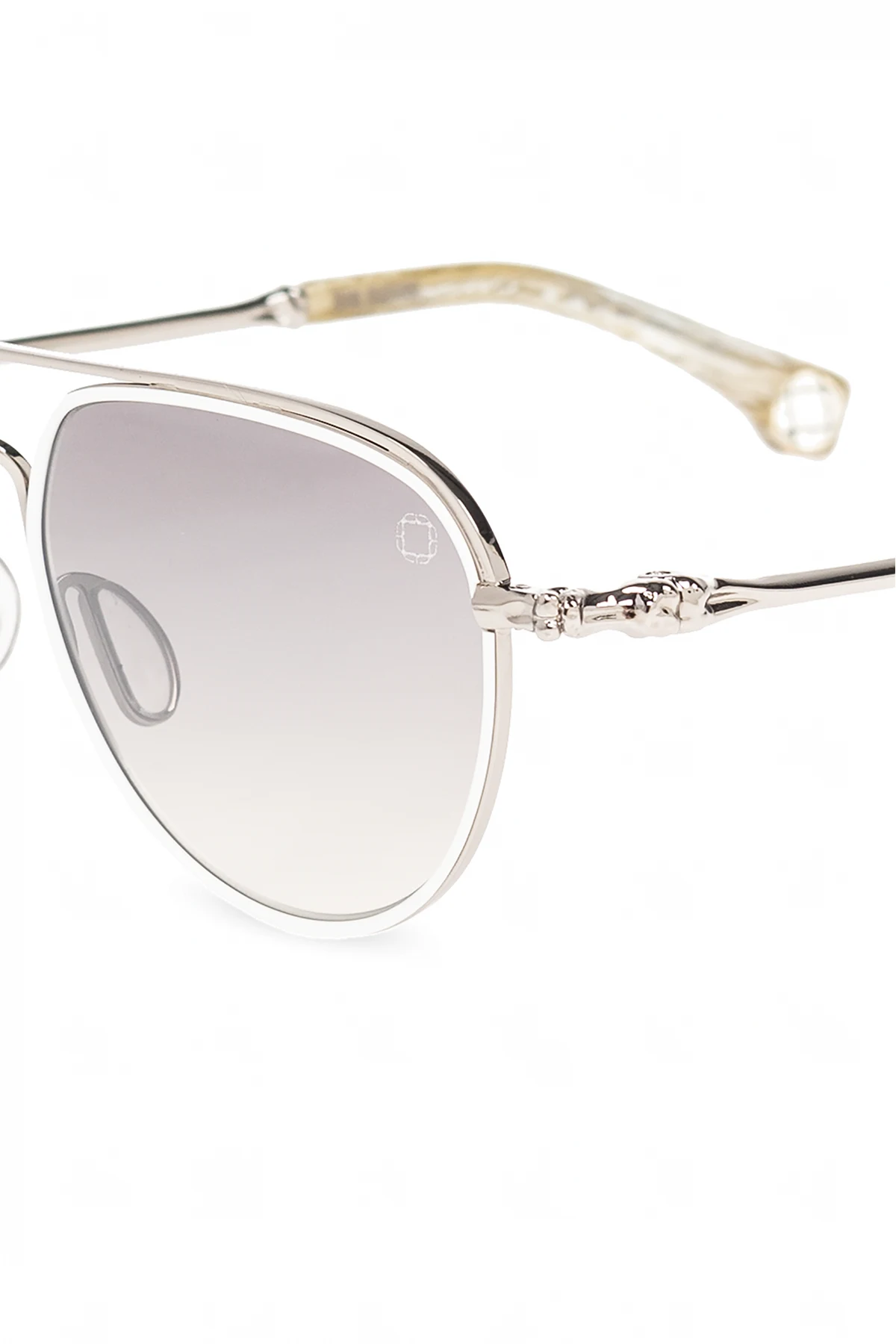 Okulary przeciwsłoneczne w kolorze srebrnym, model ‘BK 1005’ Blake Kuwahara. Oprawki typu ‘aviator’ wykończone białym acetatem. Podwójny mostek z regulowanymi noskami. Zauszniki z dekoracyjnymi końcówkami ozdobionymi logo, wzorowanym na japońskim herbie rodzinnym Blake'a Kuwahary. Szare, gradientowe szkła z efektem lustrzanym i z ochroną przed promieniami UV. Dołączone etui. Ręcznie wykonane w Japonii.
