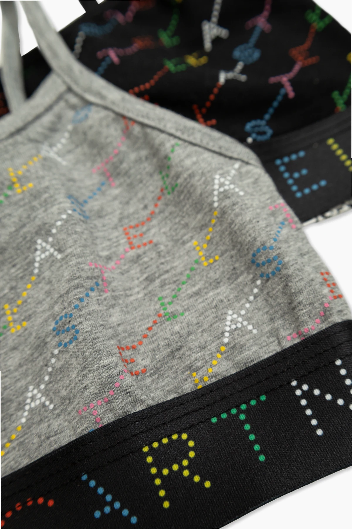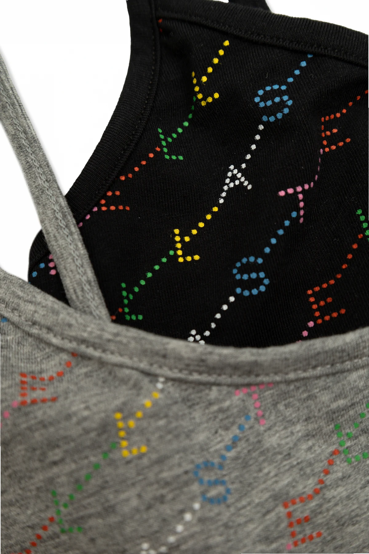 Wzór na materiałach składa się z kolorowych kropek, które układają się w napis "STELLAMcCARTNEY", nadając topom unikatowy charakter. Na szerokiej, elastycznej taśmie pod biustem również znajduje się ten napis, wykonany z kolorowych kropek.