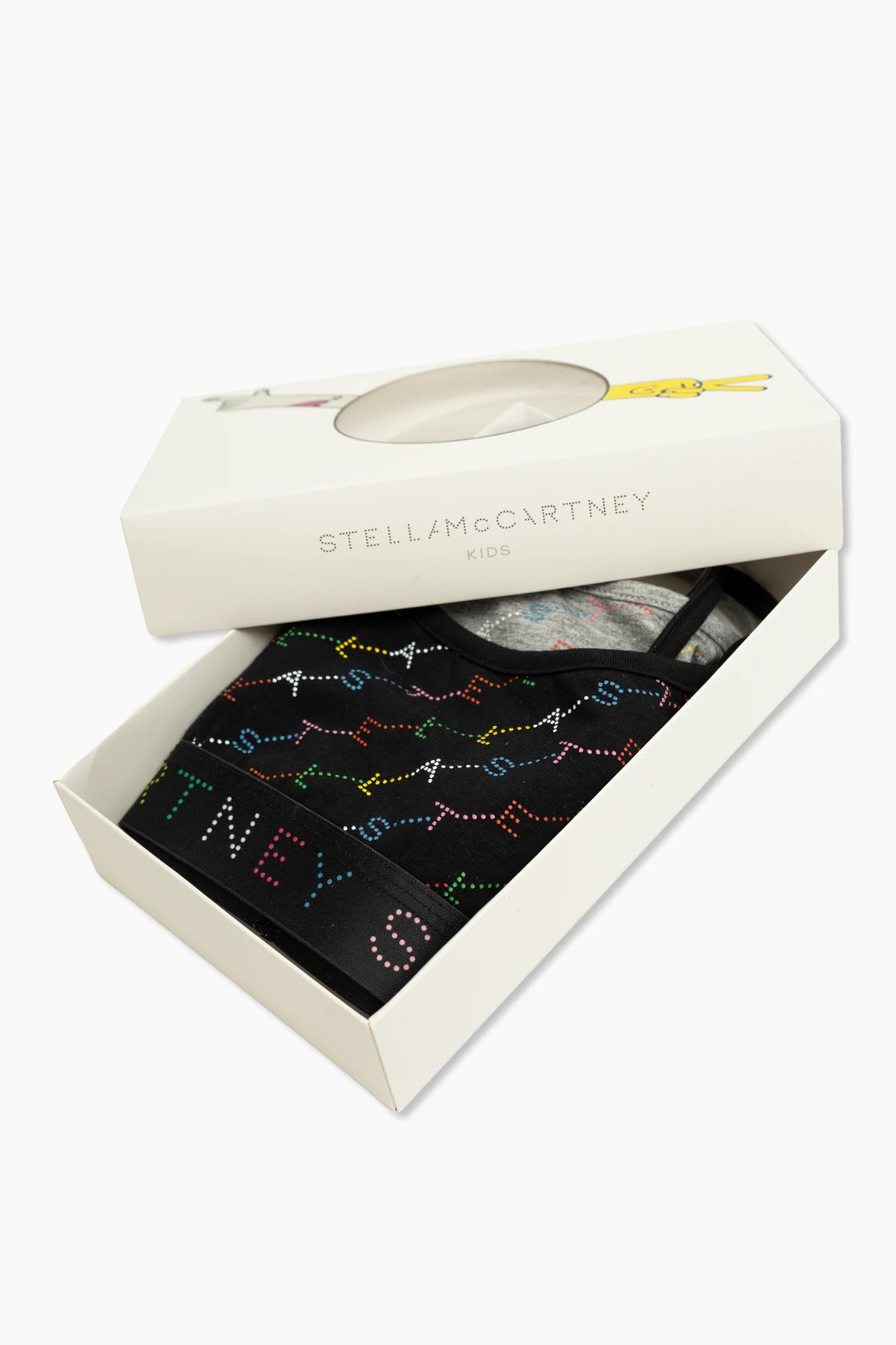Topy są starannie zapakowane w estetyczne białe pudełko z okienkiem, przez które widać produkty. Na opakowaniu znajduje się logo marki "STELLAMcCARTNEY KIDS" oraz grafika przedstawiająca postać z rozłożonymi rękami i żółtymi rękawiczkami.