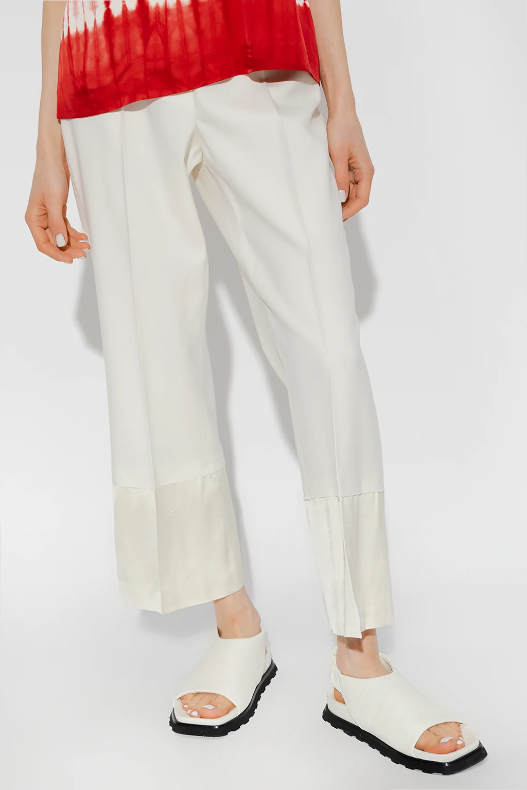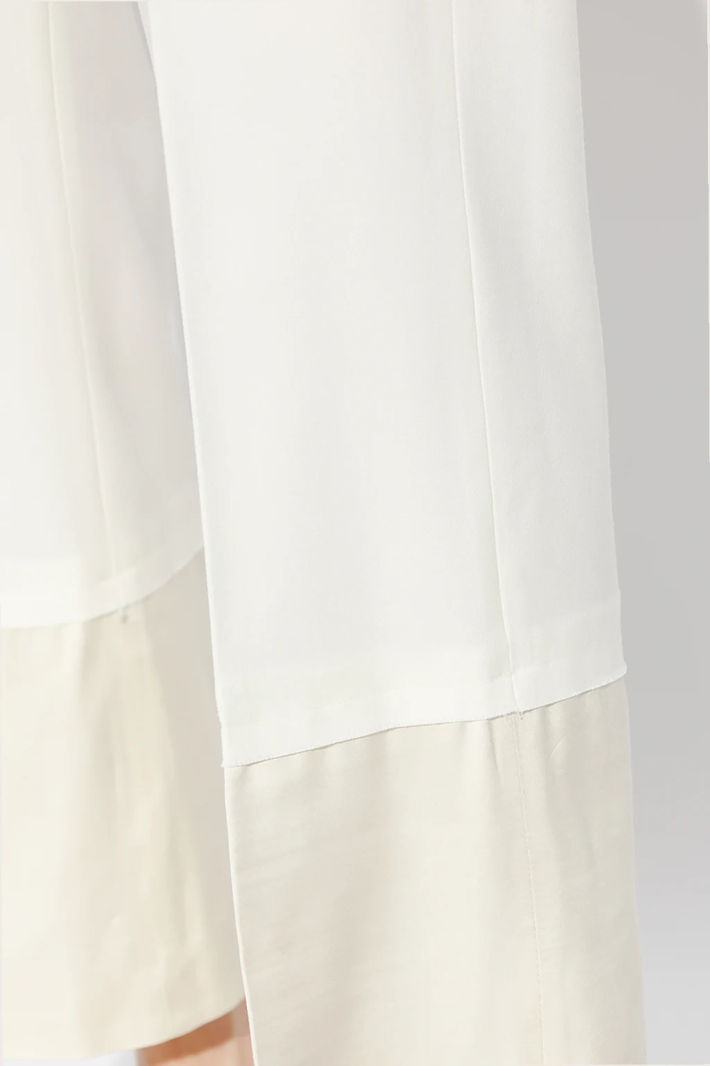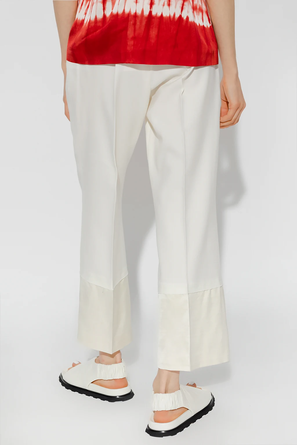 Kremowe, wełniane spodnie w kant, model ‘Harmony’ Wales Bonner. Zapinane na zaczepy i zamek. Z przodu dwie wsuwane kieszenie, z tyłu jedna. Szerokie nogawki wykończone połyskującą tkaniną.