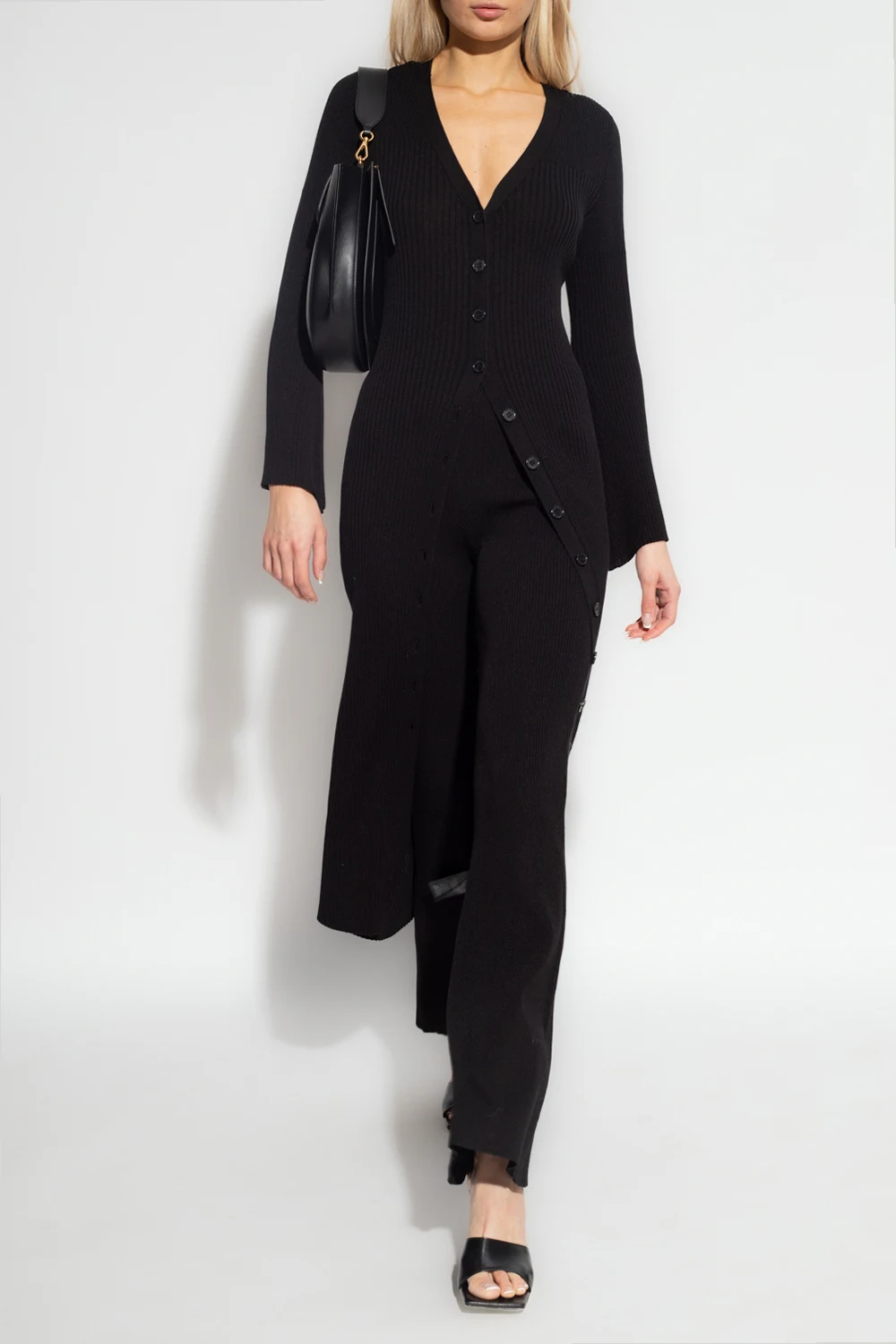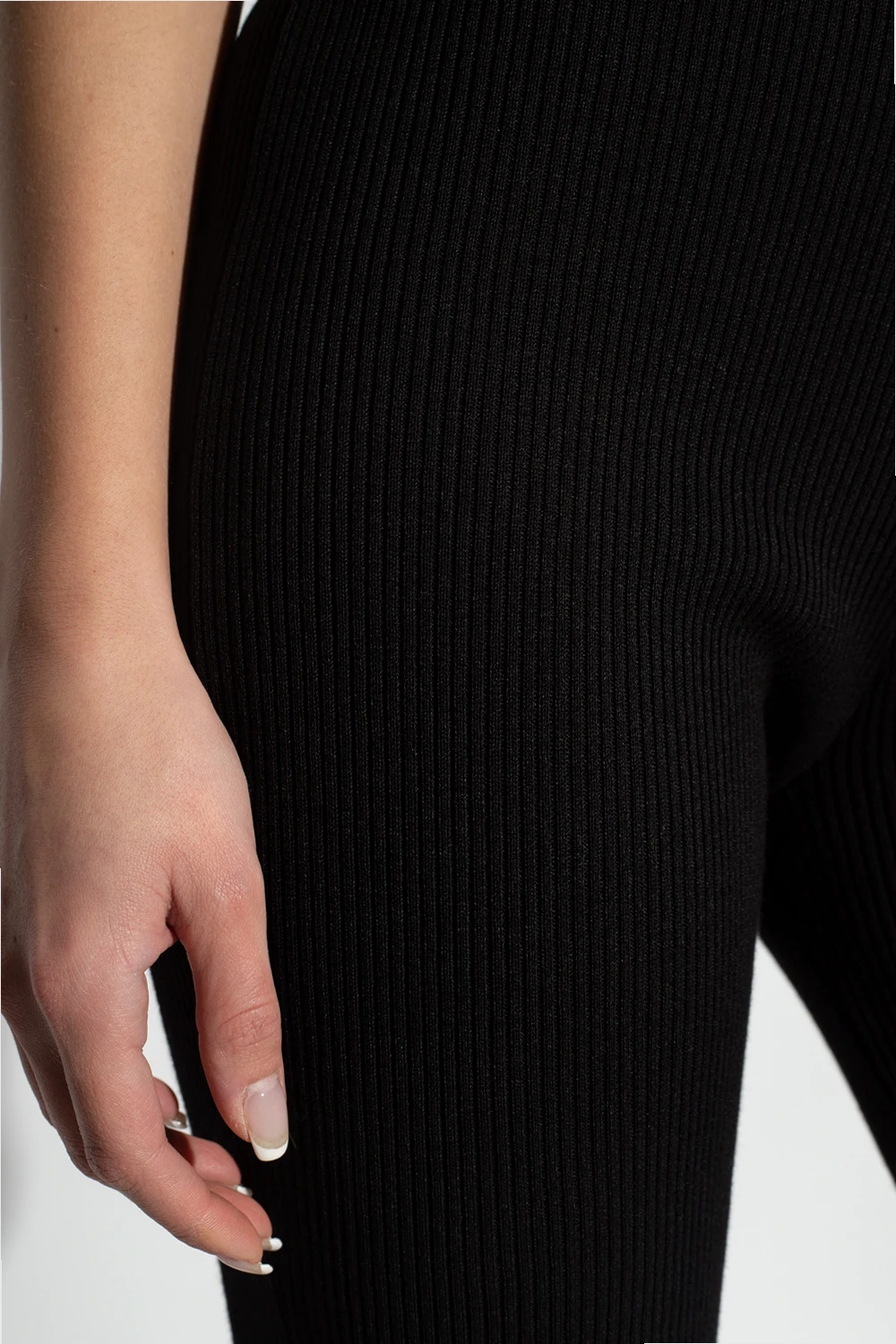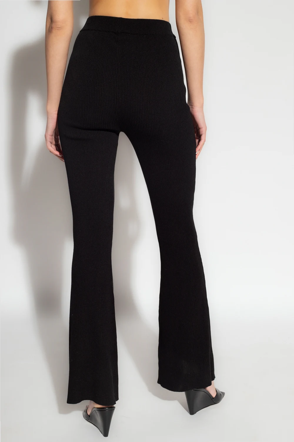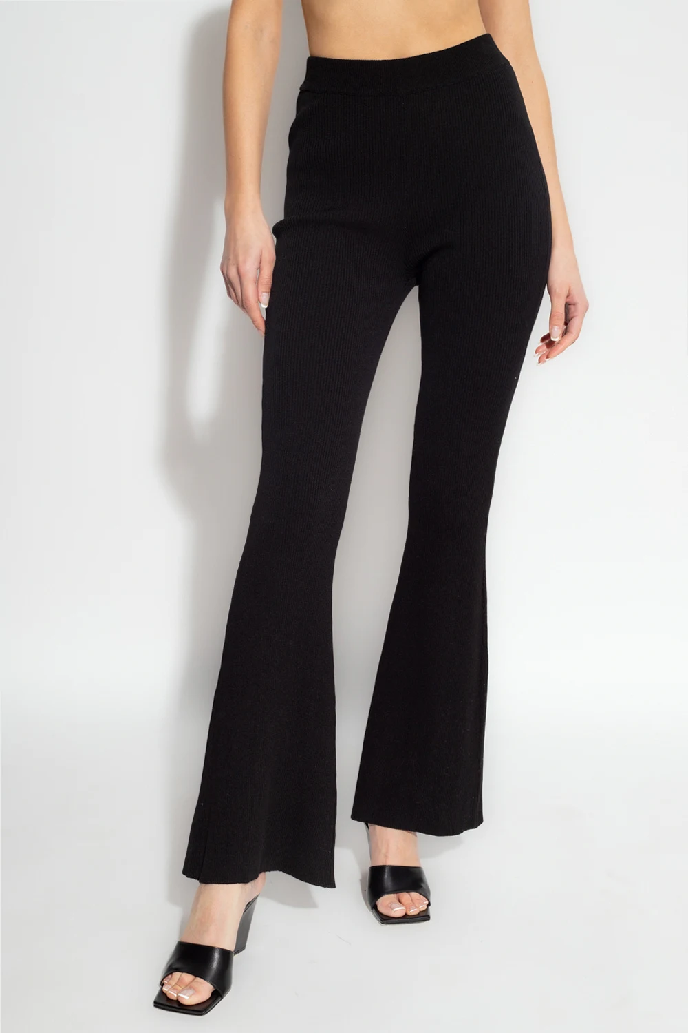 Czarne, prążkowane spodnie z wysokim stanem, model ‘AdaleaGZ’ Gestuz. Wykonane z mieszanki bawełny i materiału pozyskanego w zrównoważony sposób Naia™. W talii wszyta guma. Długie, rozszerzane nogawki.