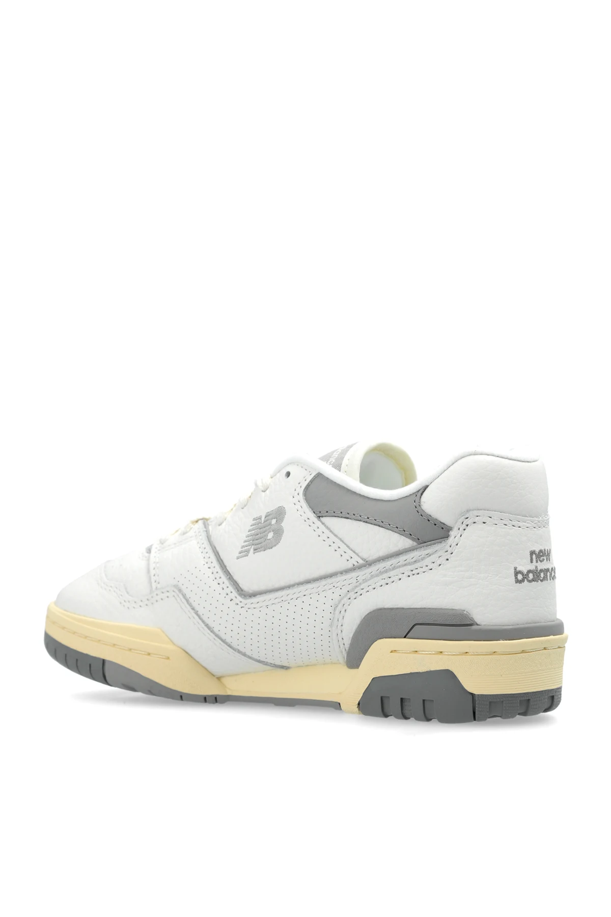 Detale, takie jak szare logo New Balance w formie litery "N" na bocznym panelu, napis "new balance" na pięcie oraz na bocznej podeszwie, a także oznaczenie modelu "550" na języku, świadczą o dbałości o najmniejsze szczegóły.