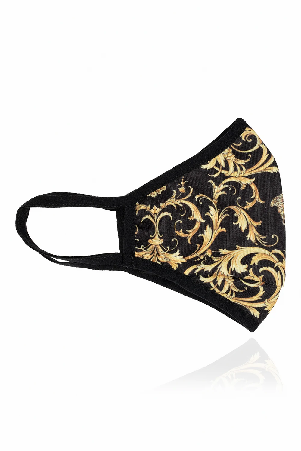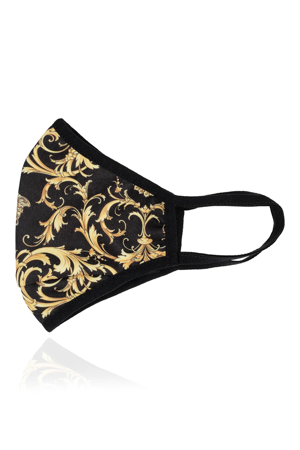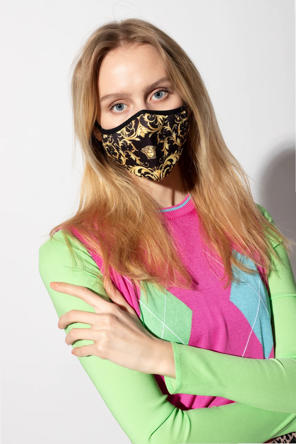Czarna maseczka Versace. Ozdobiona pomarańczowym nadrukiem z charakterystycznym dla marki motywem barokowym i głową Meduzy. Bawełniana warstwa wewnętrzna.