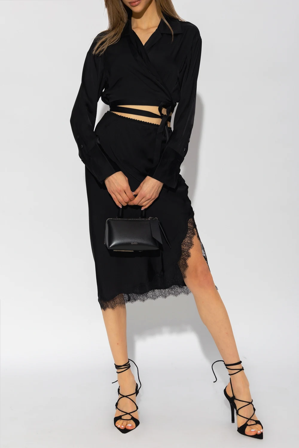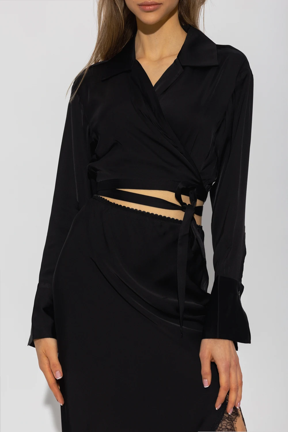 Czarny, kopertowy top, model ‘Zikka’ Birgitte Herskind. Na dole dekoracyjnie wiązany trokami. Długie rękawy zakończone mankietem zapinanym na guziki.
