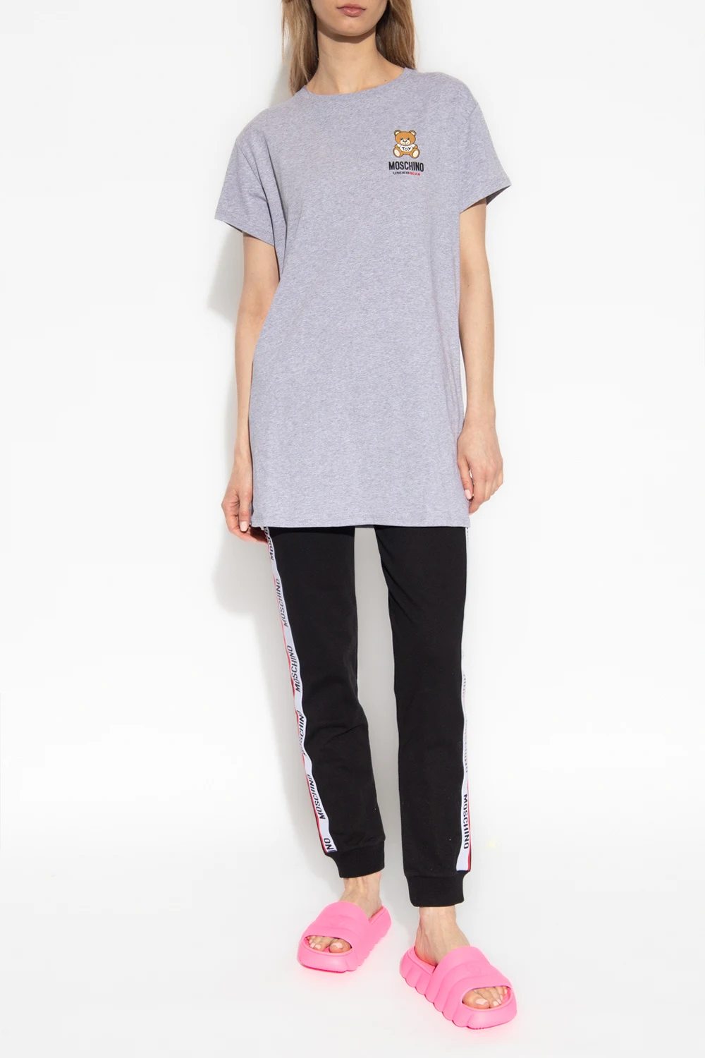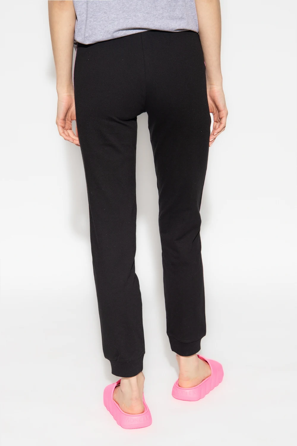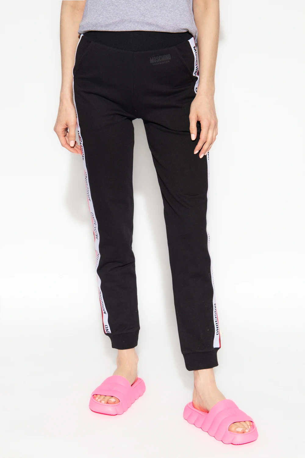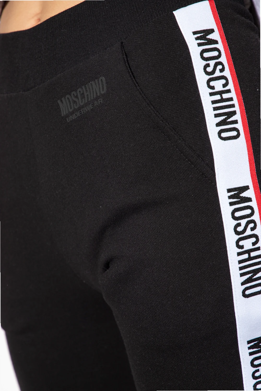 Czarne spodnie dresowe Moschino, kolekcja ‘Underwear’. Wykonane z bawełny. W pasie wszyta guma. Z przodu gumowa aplikacja z logo. Dwie wsuwane kieszenie. Długie nogawki ozdobione biało-czerwono-czarnymi lampasami z logo oraz wykończone ściągaczem.