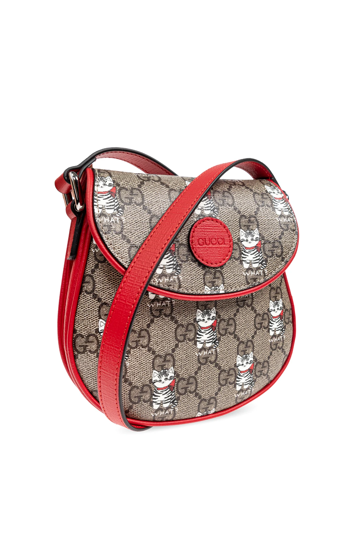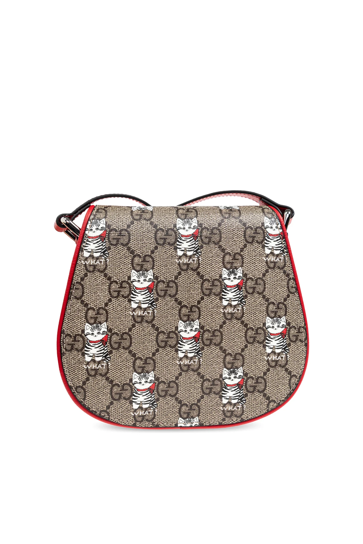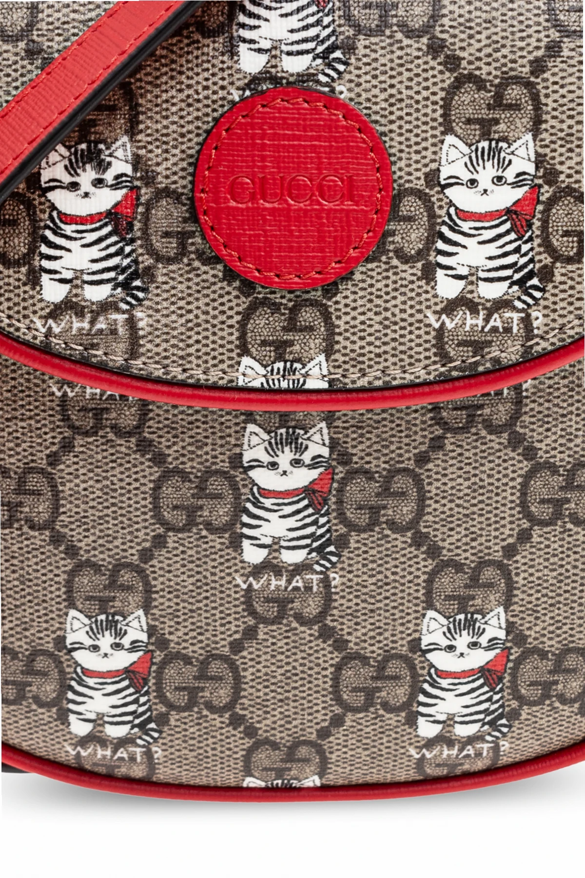 Utrzymana w beżowej tonacji, torba emanuje charakterystycznym wzorem monogramu, urozmaiconym grafiką kotków i napisem "WHAT". Czerwone skórzane wykończenia oraz kontrastujące paski pięknie współgrają z beżowym tłem, a wnętrze torby, również czerwone, podkreśla harmonię i wyrafinowany styl produktu.