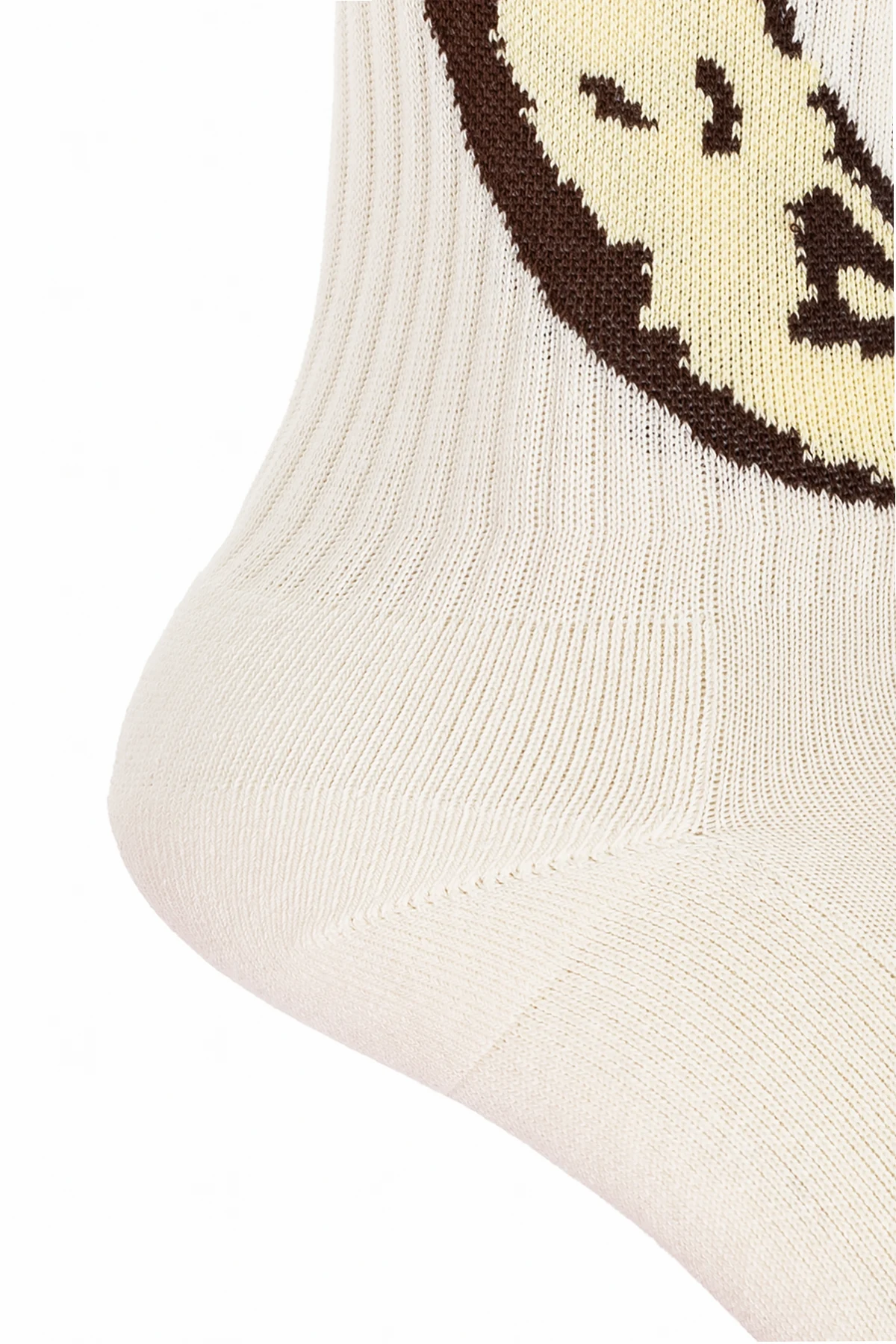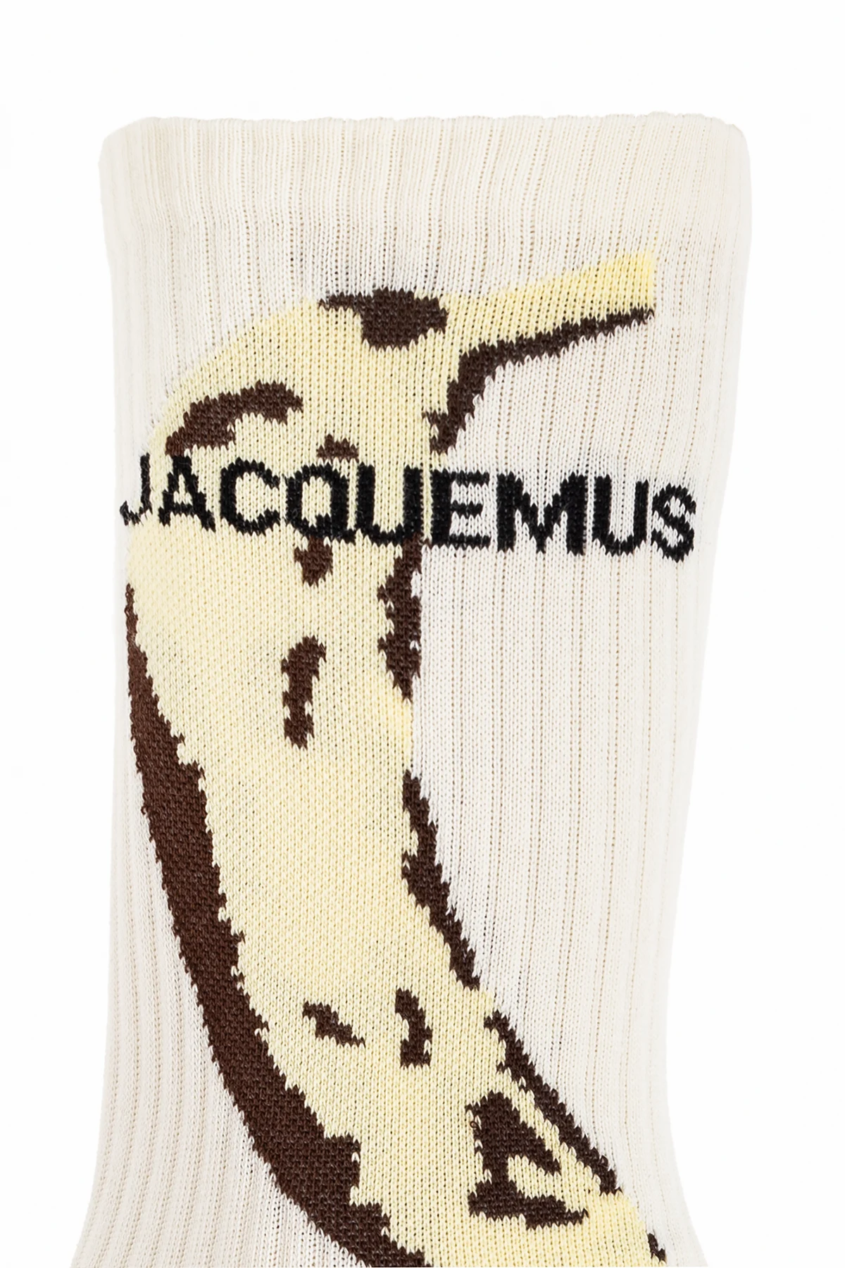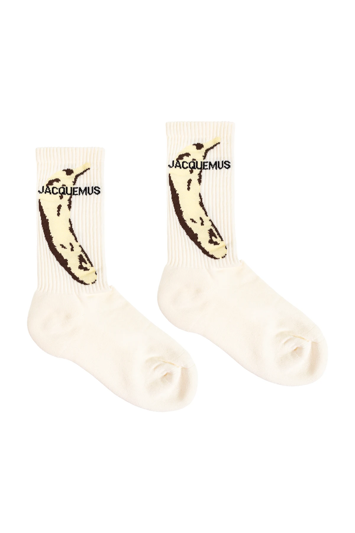Oto skarpety z logo - kwintesencja ekskluzywności i oryginalności, stworzone przez renomowaną markę modową Jacquemus . Te wyjątkowe skarpety, o dominującej białej tonacji, przyciągają wzrok żebrowanym wzorem i dużą grafiką banana w subtelnych odcieniach beżu i brązu. Delikatnie umieszczone czarne logo "JACQUEMUS" dodaje im wyrafinowanego charakteru.