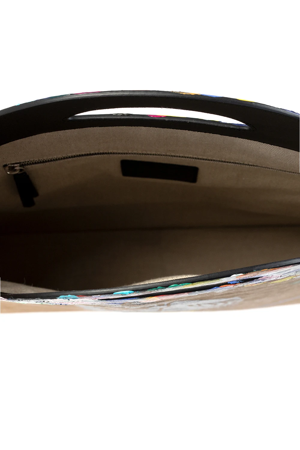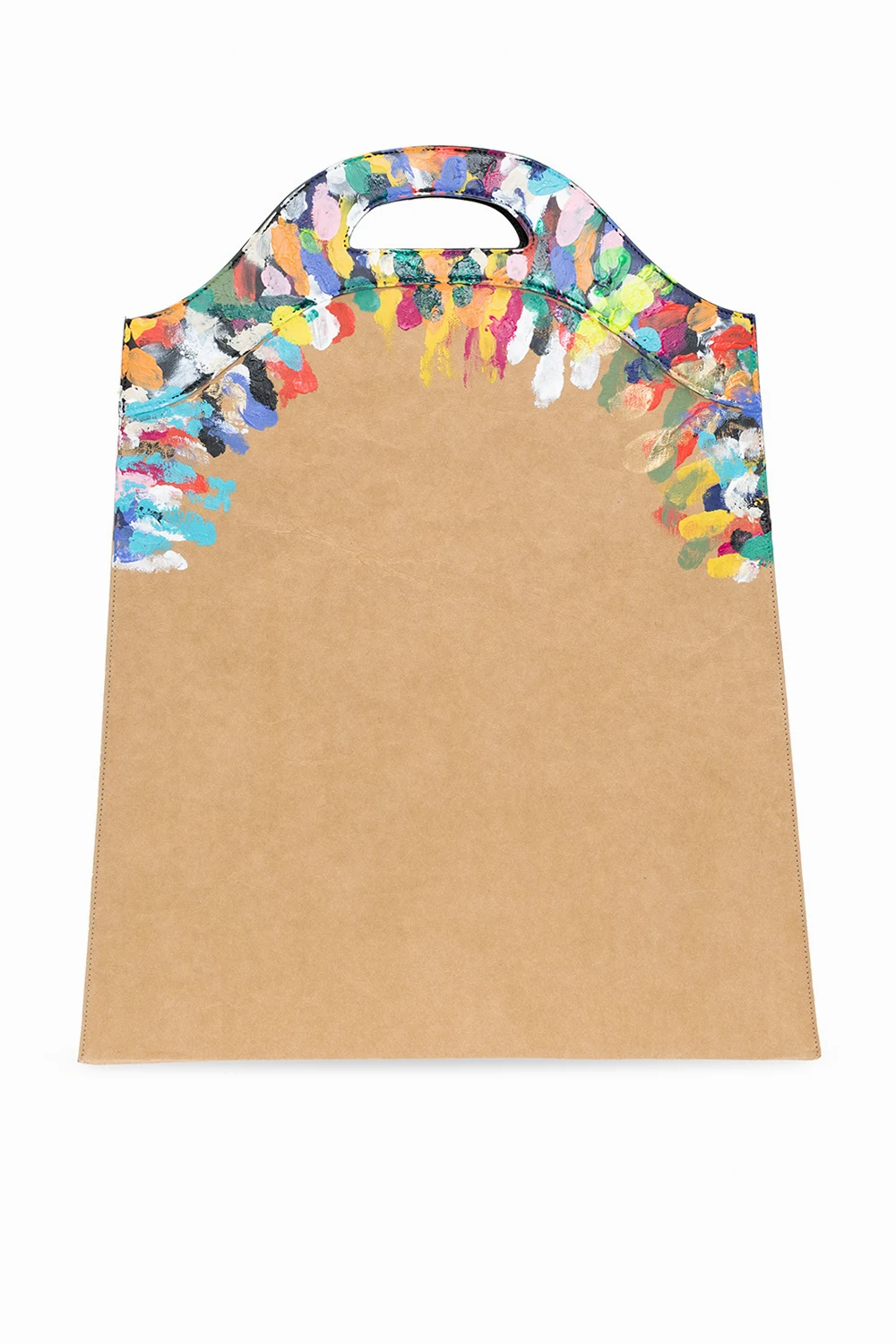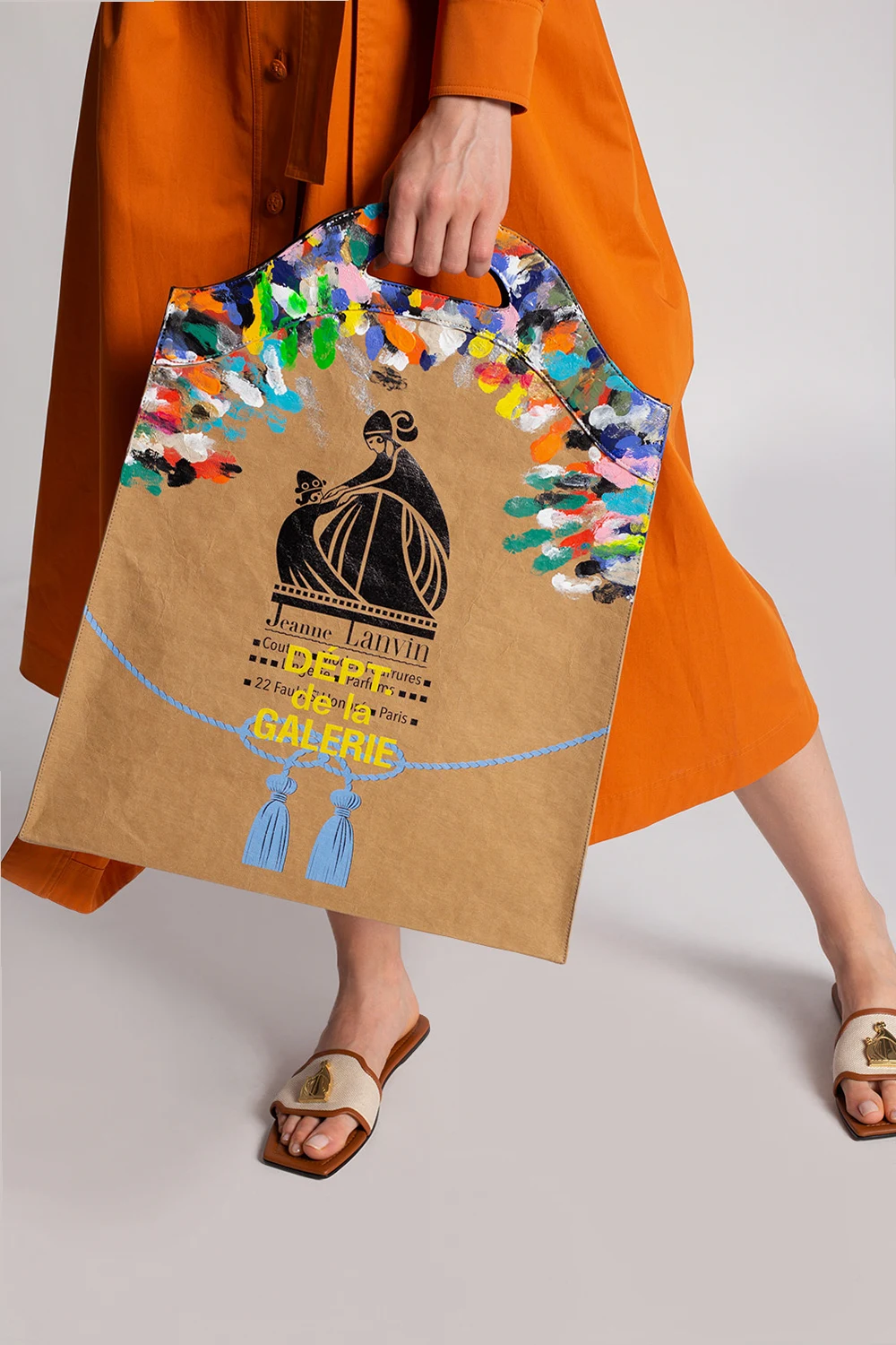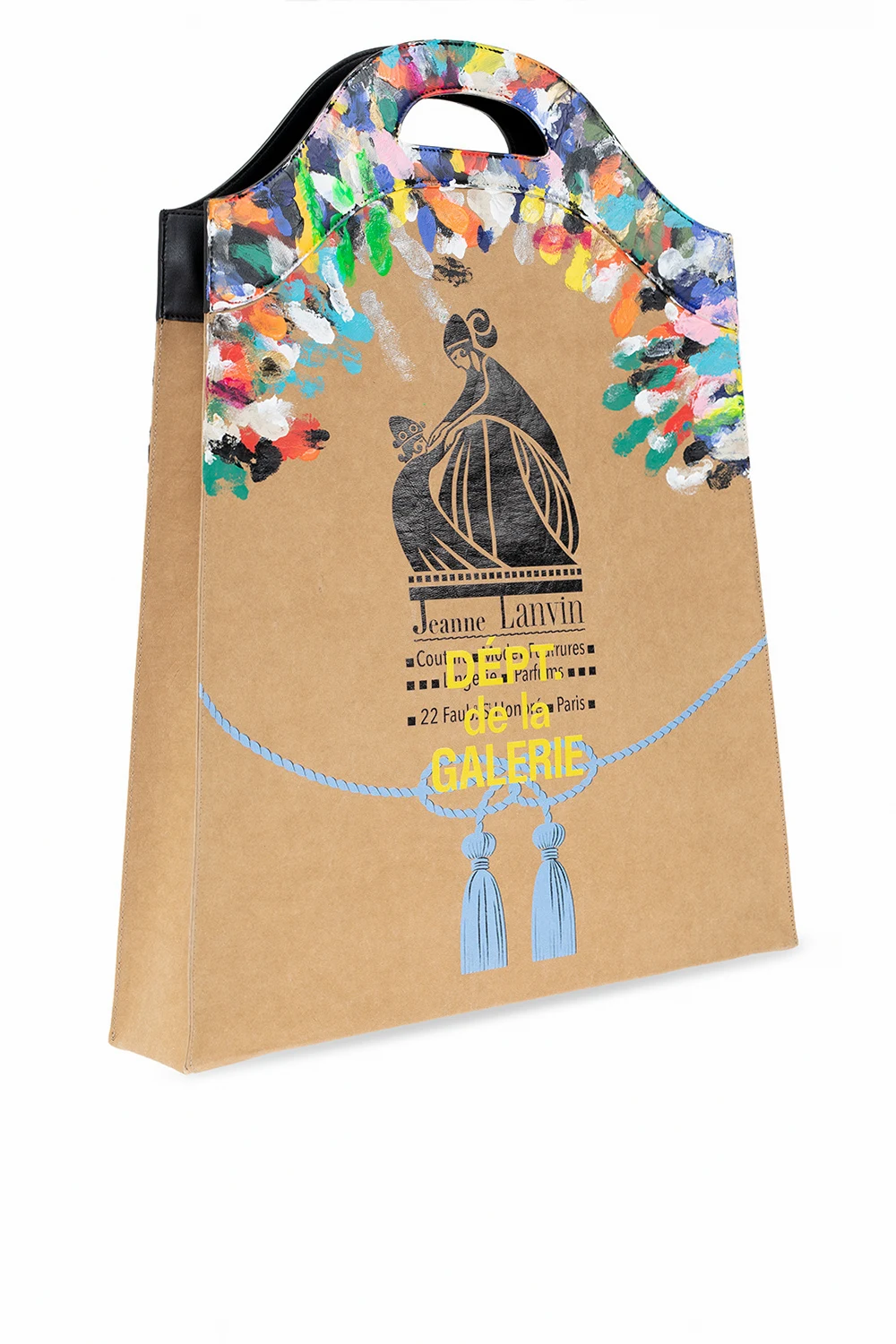 Brązowa torba do ręki Lanvin. Wykonana z papieru. Nadrukowany kolorowy wzór z logo. Dwie półokrągłe rączki. Wewnątrz komora z dwiema kieszeniami: wsuwaną oraz zamykaną na zamek.
