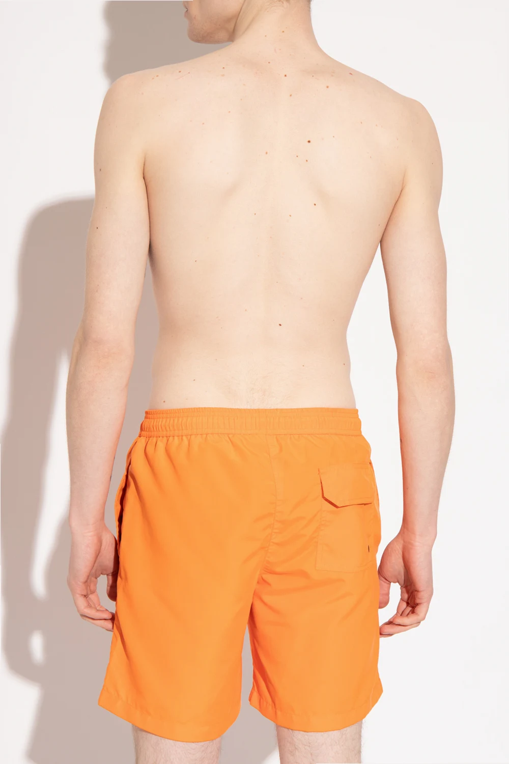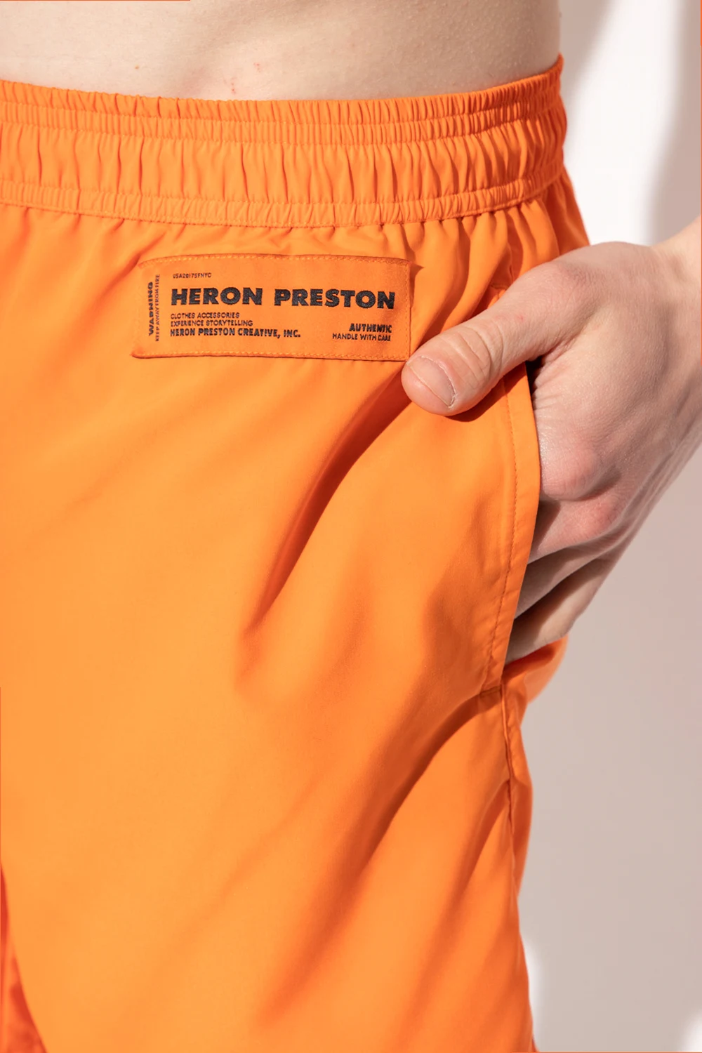Pomarańczowe szorty kąpielowe Heron Preston. W pasie ściągane trokami. Z przodu naszywka z logo. Trzy kieszenie: dwie z przodu i jedna z tyłu z patką zapinaną na rzep.