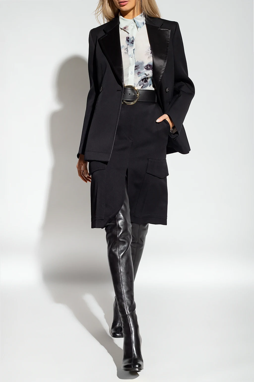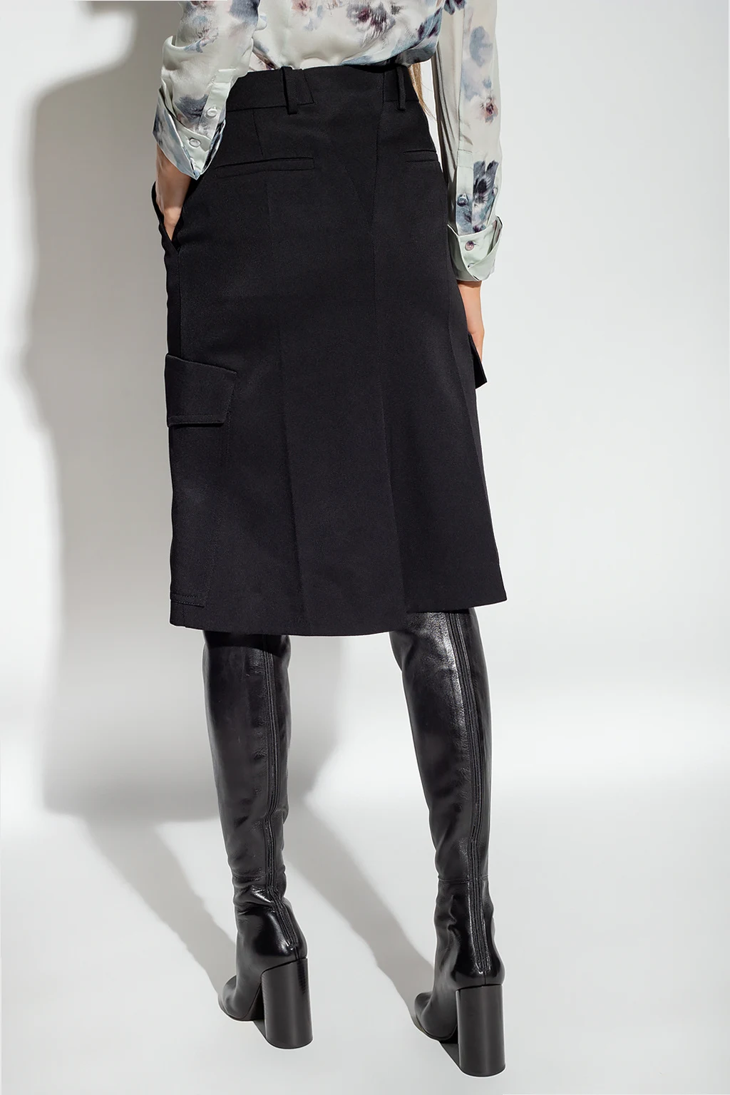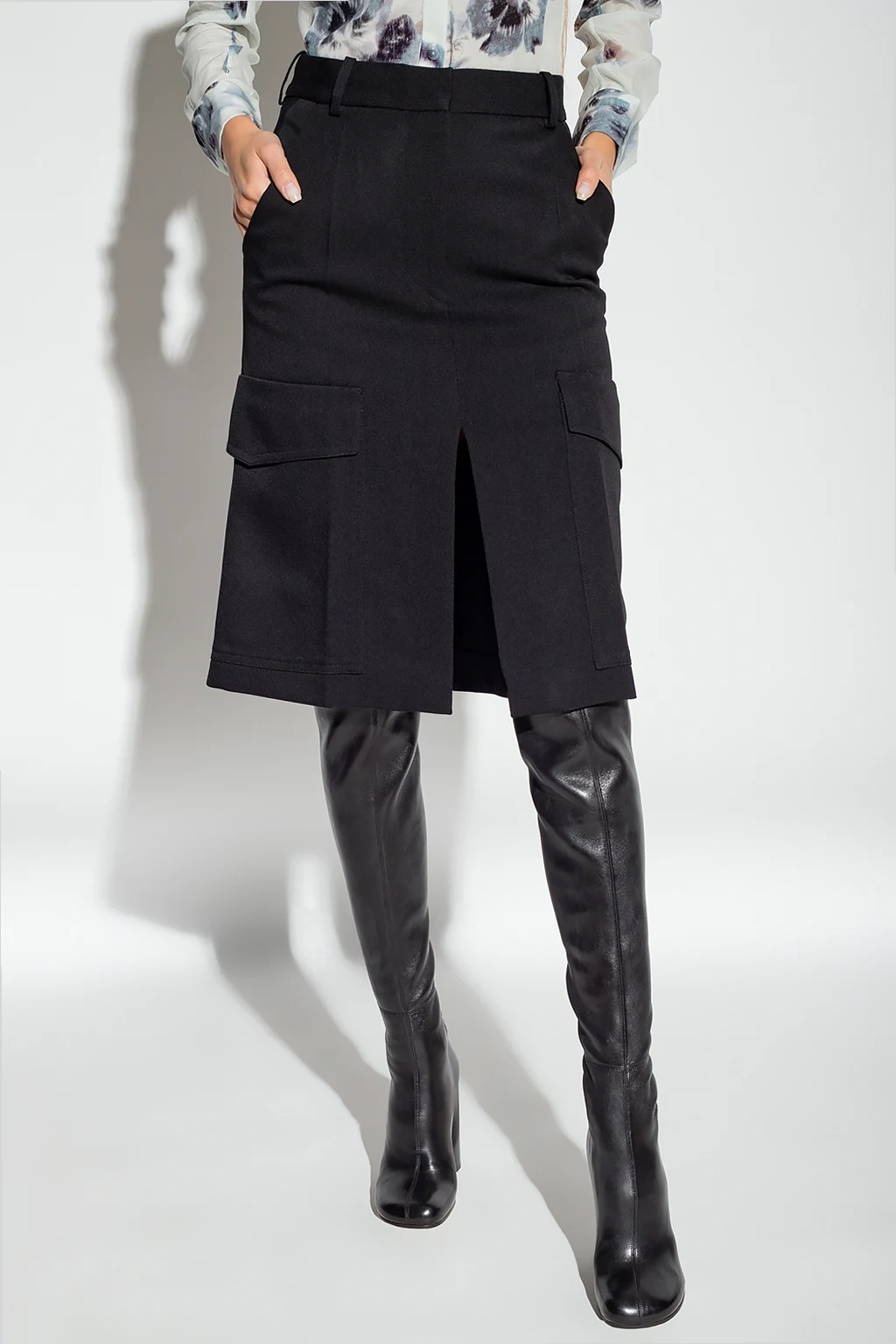 Czarna, wełniana spódnica Victoria Beckham. Zapinana na zamek, zaczep i guzik. Sześć kieszeni, dwie z patką. Z przodu pojedyncze rozcięcie.