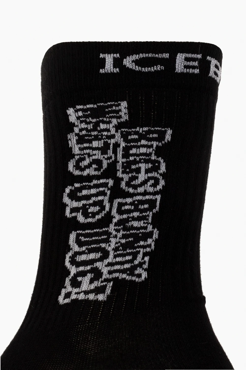 Czarne skarpety Iceberg. Wykonane z bawełny. Ozdobione wzorem z logo w kolorze białym. Wykończone ściągaczem.