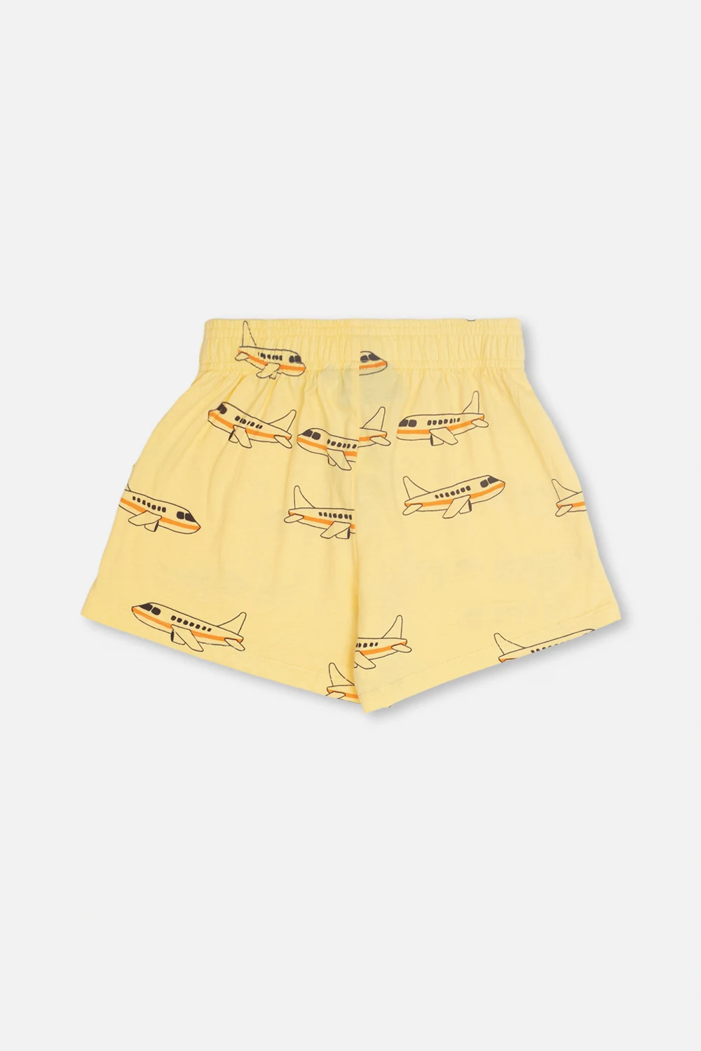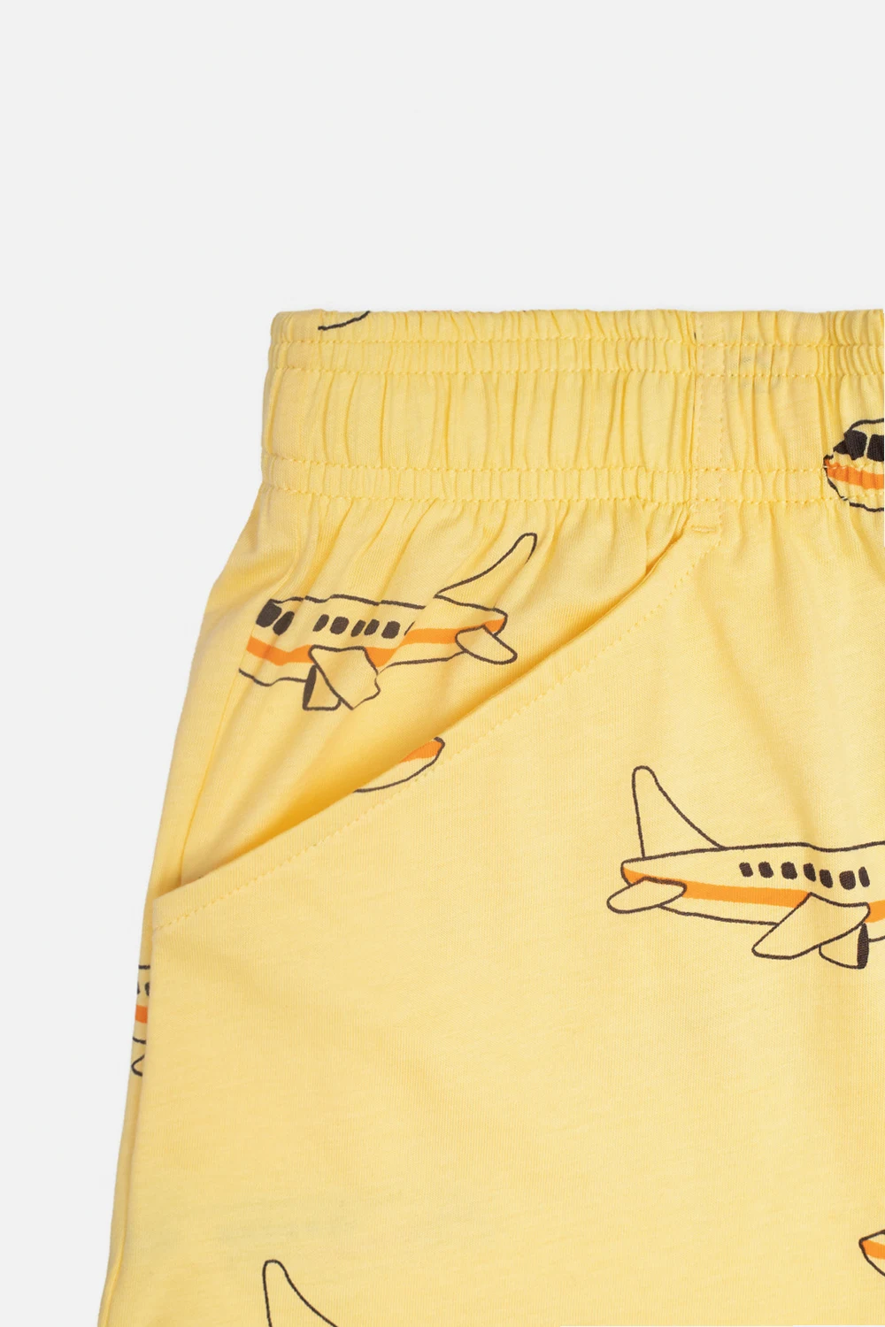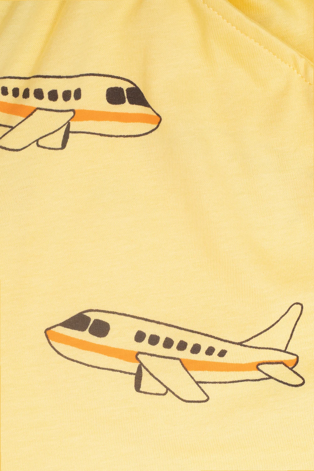 Żółte szorty Mini Rodini. Wykonane z bawełny organicznej z certyfikatem GOTS. W pasie wszyta guma ściągana trokami. Ozdobione czarno-pomarańczowym wzorem z motywem samolotów. Dwie wsuwane kieszenie.