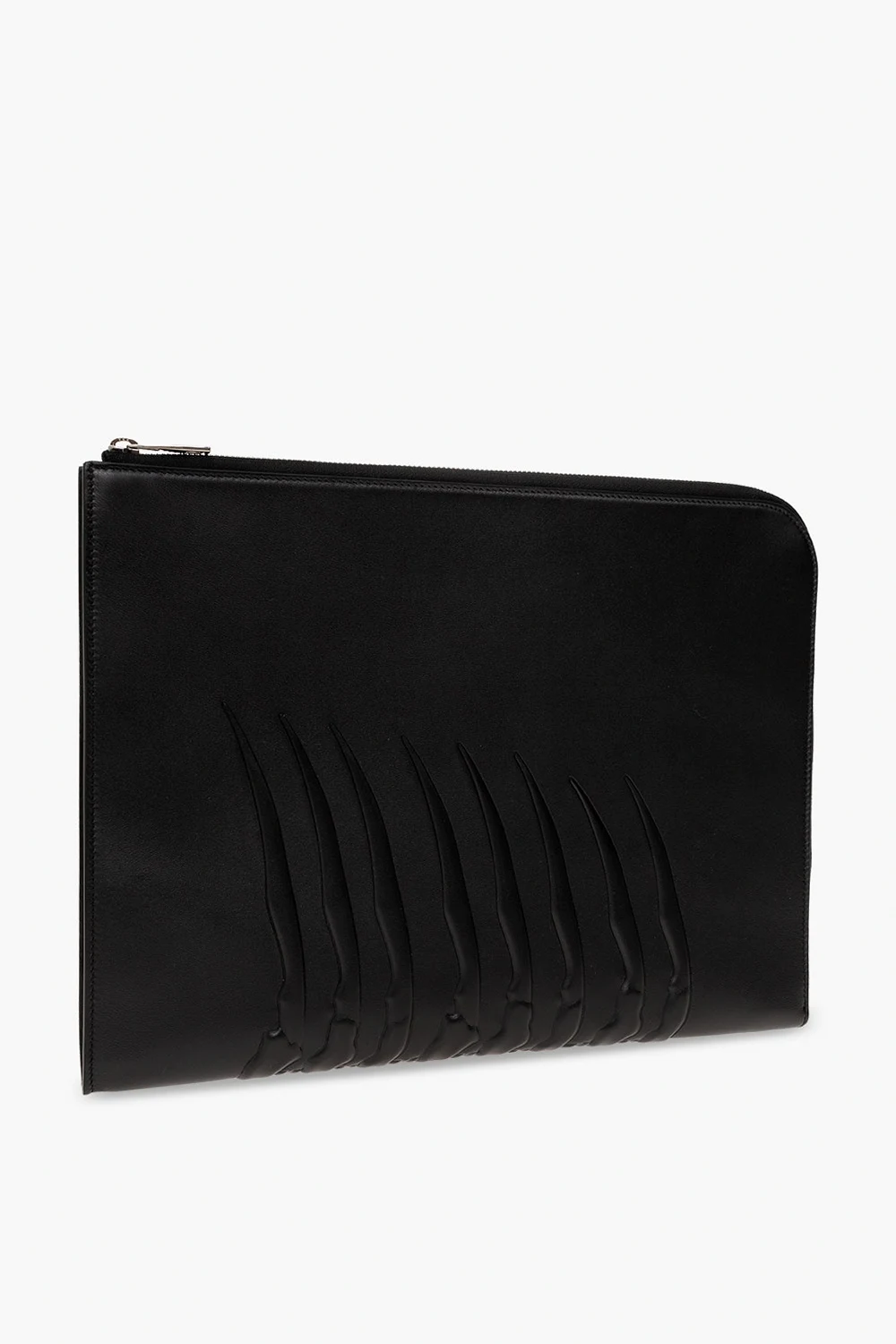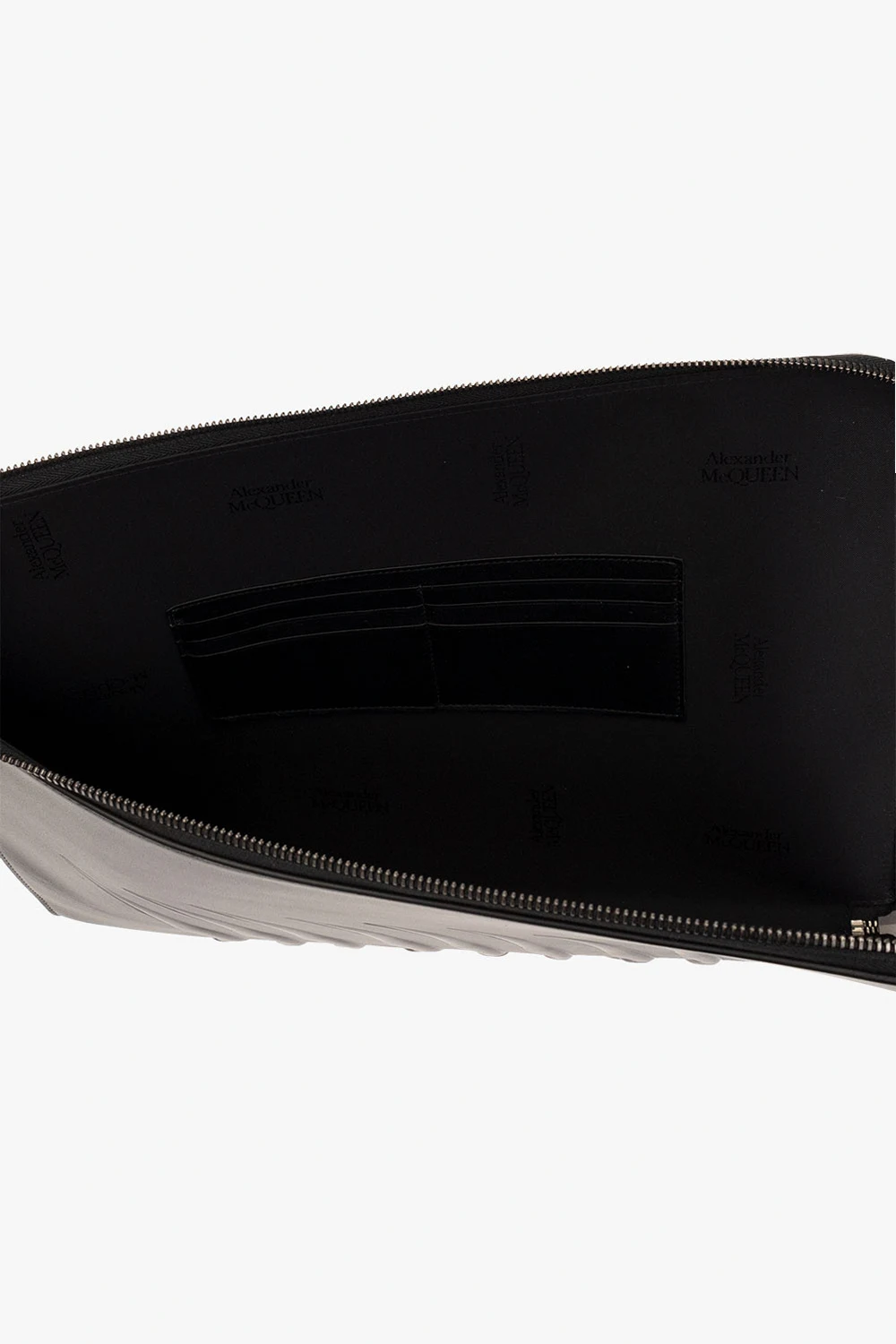 Czarna aktówka Alexander McQueen. Wykonana ze skóry. Zamykana na zamek. Ozdobiona wypukłym wzorem. Wewnątrz komora z wsuwaną kieszenią i sześcioma miejscami na kartę. Metalowe elementy w kolorze srebrnym.