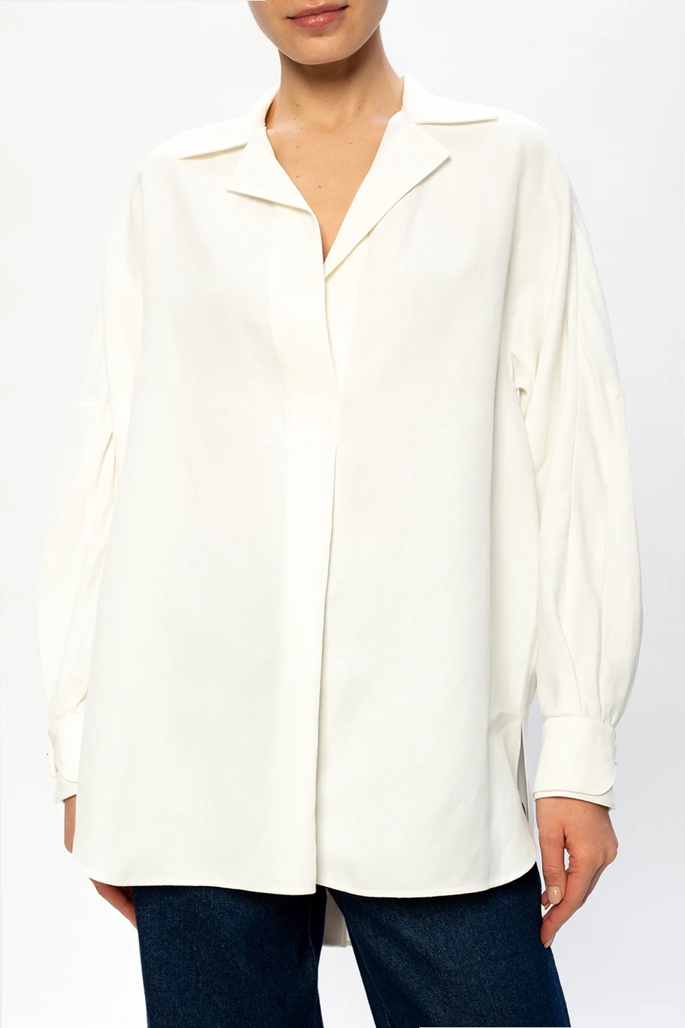 Kremowa koszula Agnona. Zapinana na guziki z krytą plisą. Otwarte klapy. Długie rękawy.