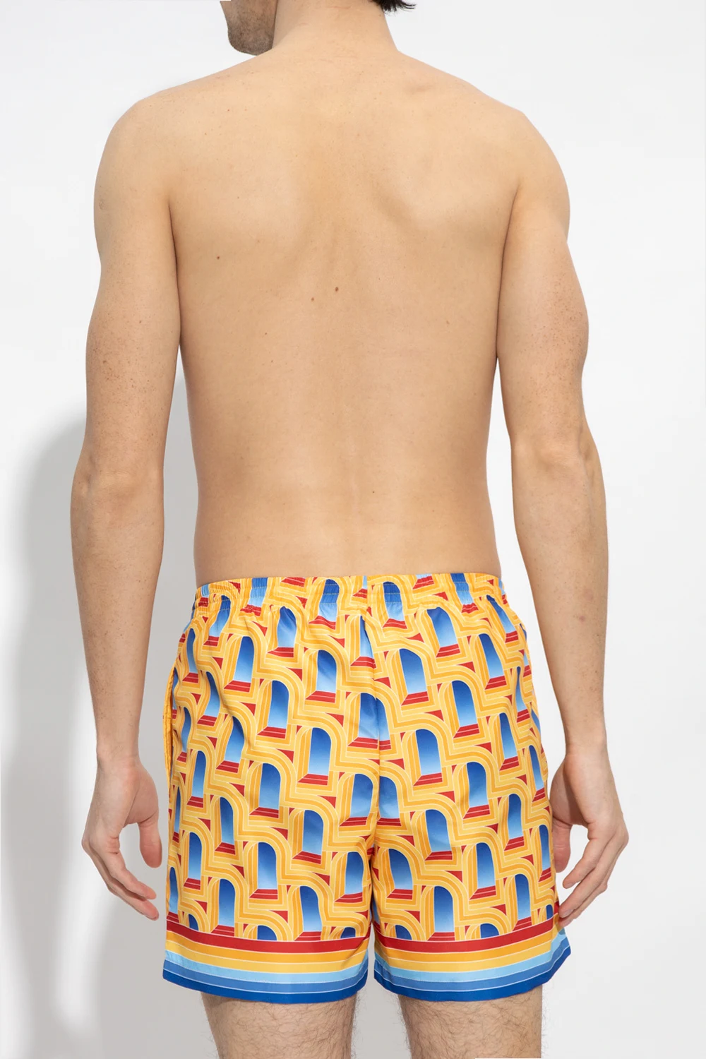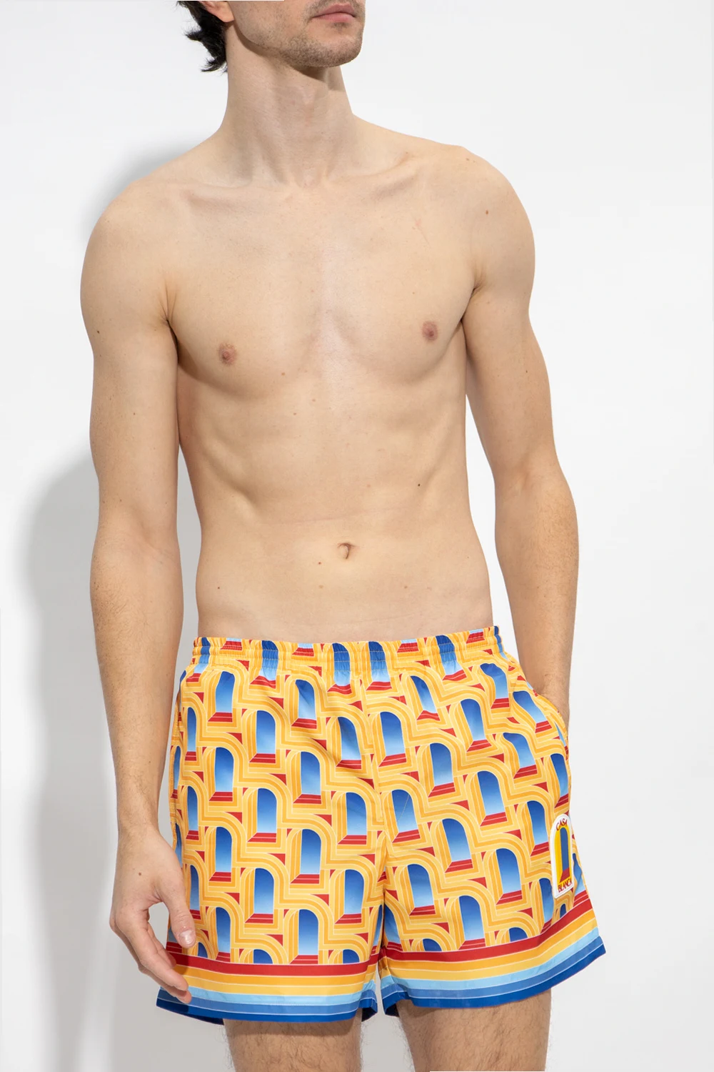 Kolorowe szorty kąpielowe, model 'Arche De Jour' Casablanca. W pasie wszyta ściągana trokami. Ozdobione wzorem oraz gumową aplikacją z logo. Dwie wsuwane kieszenie. Krótkie nogawki.