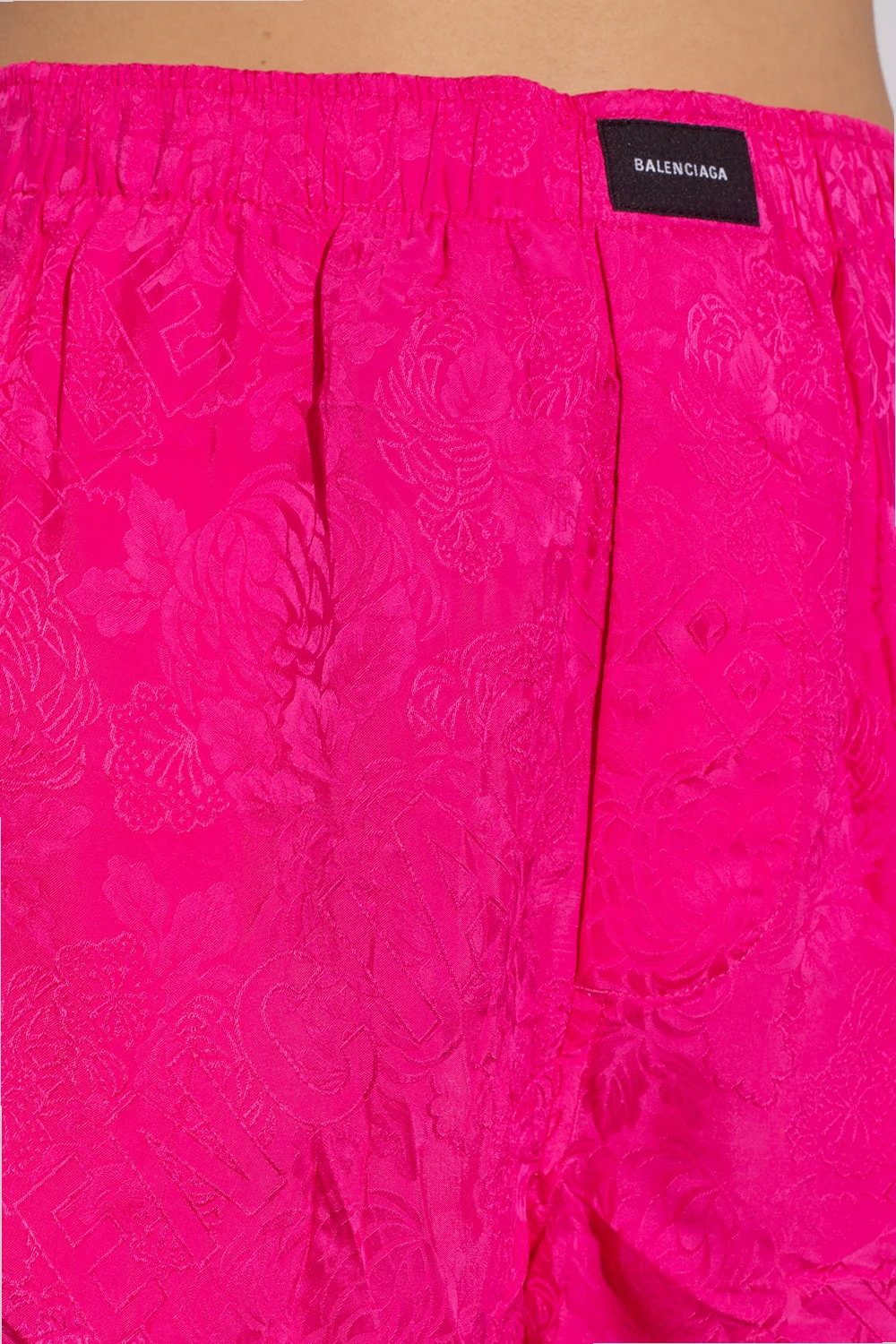 Różowy dół od piżamy Balenciaga. W pasie wszyta guma ściągana trokami. Z przodu zapięcie na guziki kryte plisą. Ozdobiony wyszytym wzorem z motywem kwiatowym oraz logo.