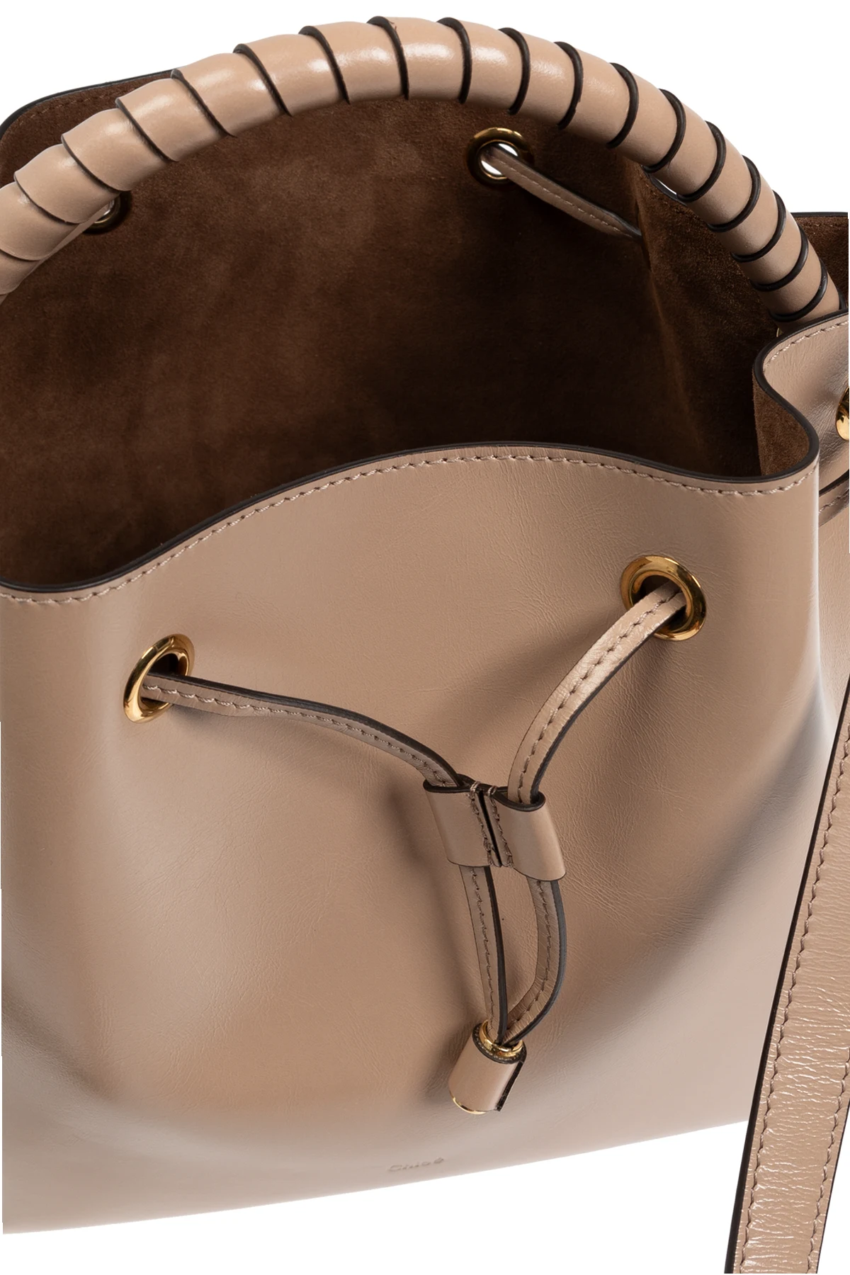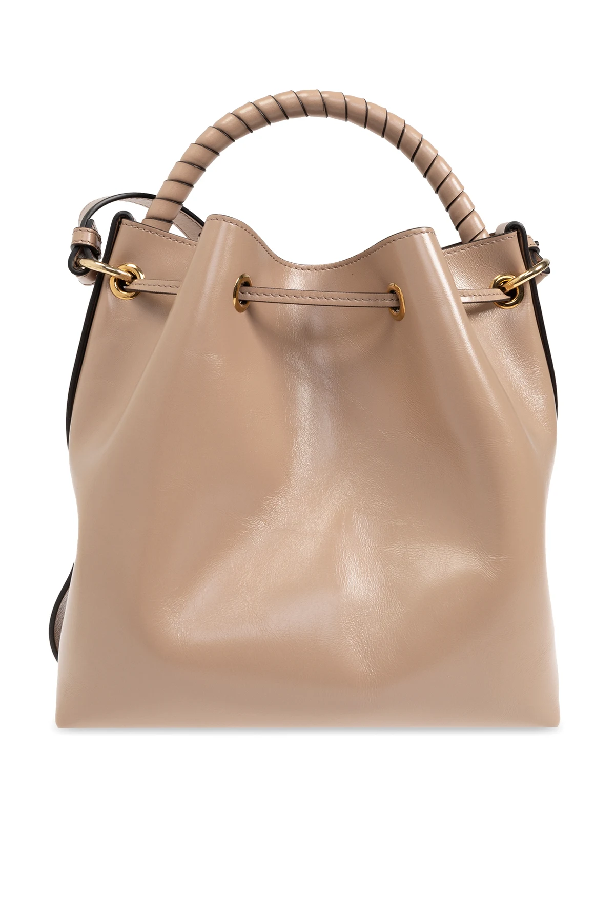 Rączka torby, owinięta skórzanymi paskami, gwarantuje komfort noszenia, a dodatkowy długi pasek umożliwia noszenie torby na ramieniu lub przez ciało. Zapięcie torby za pomocą skórzanego sznurka oraz złotych okuć podkreśla jej wyrafinowanie.