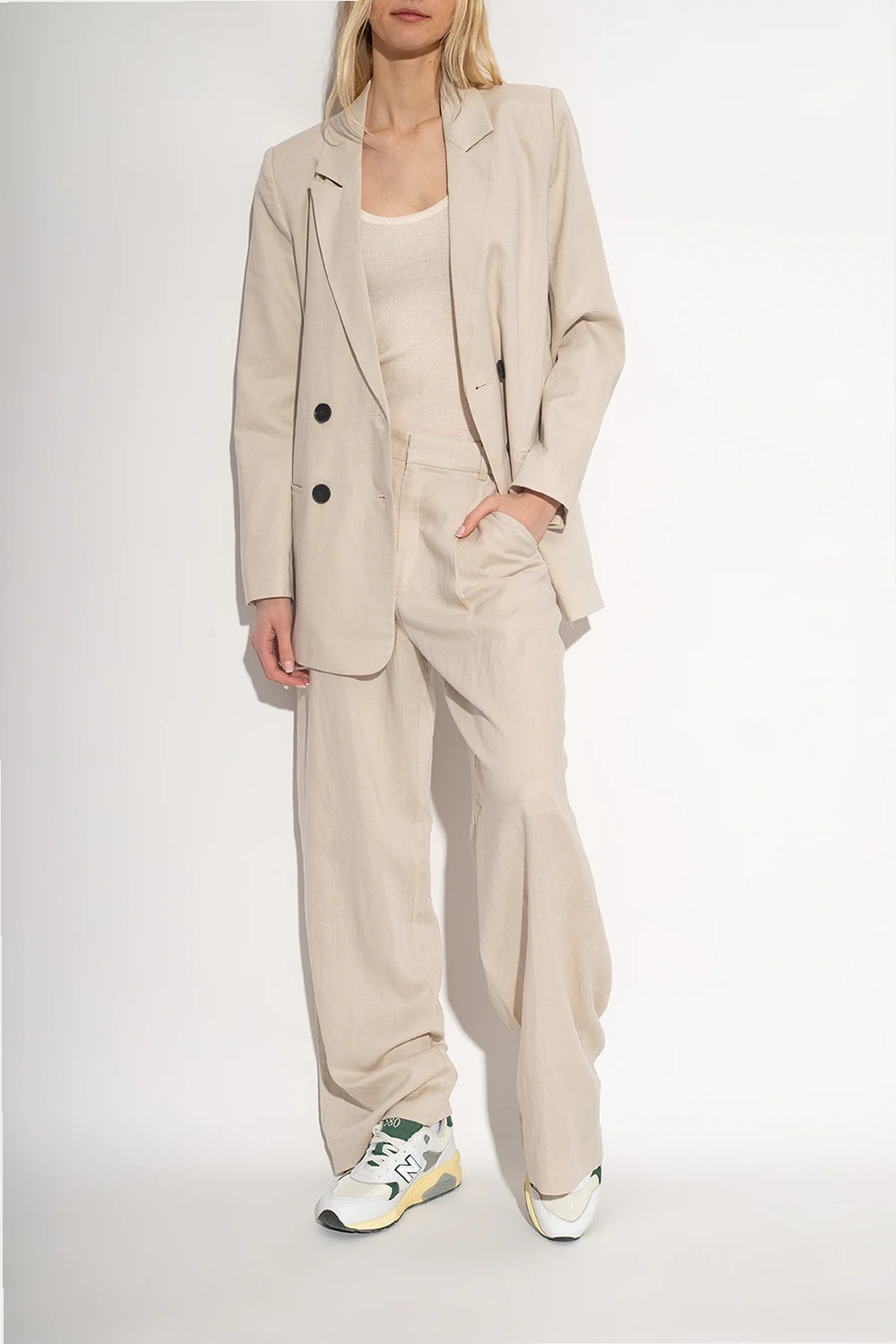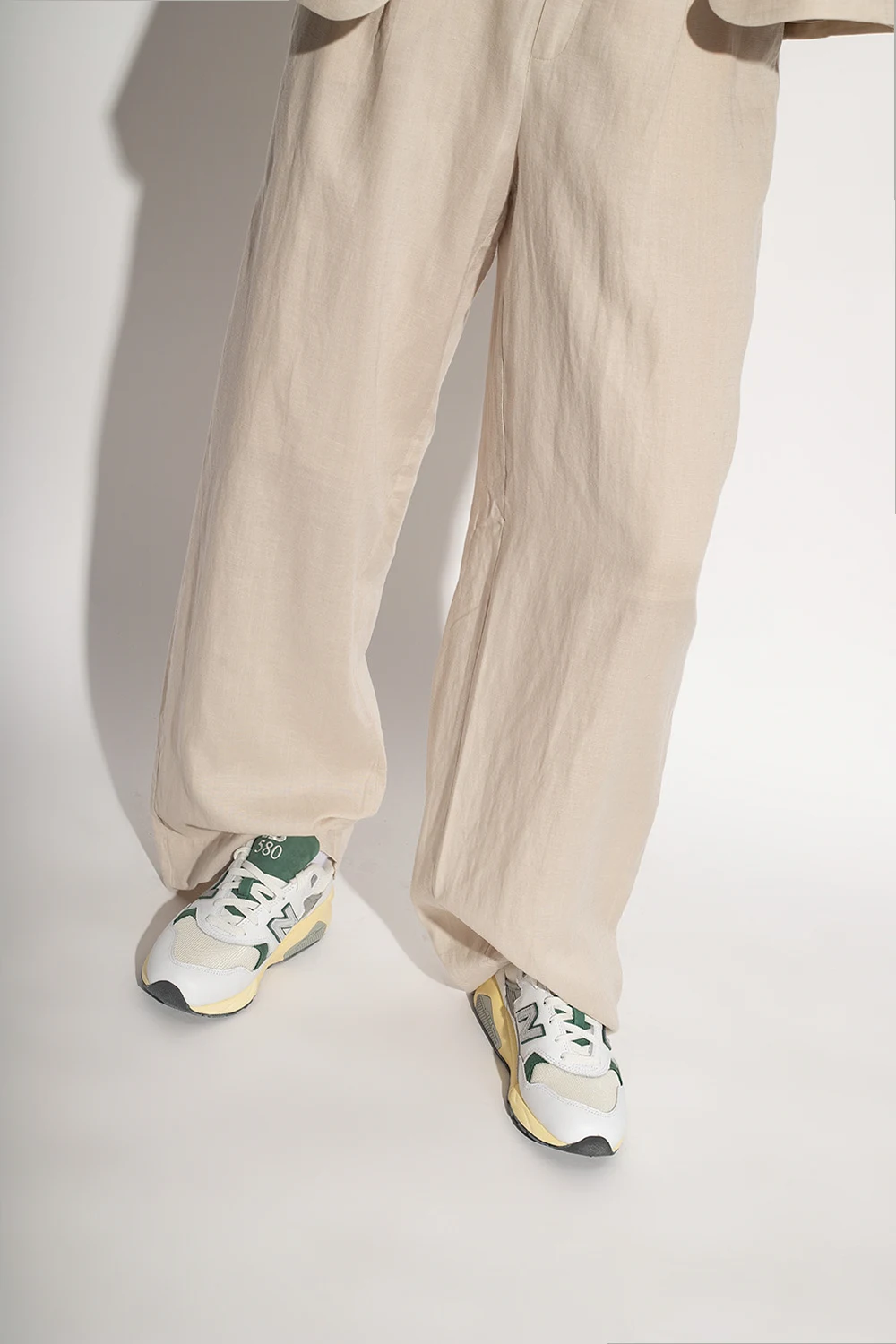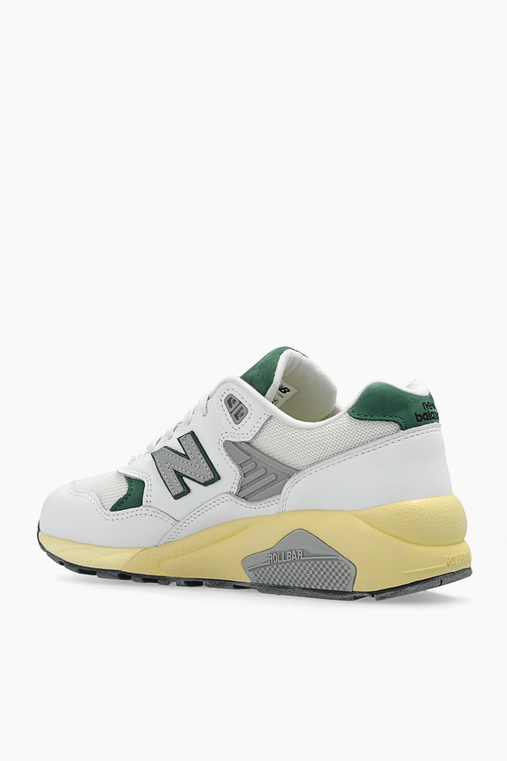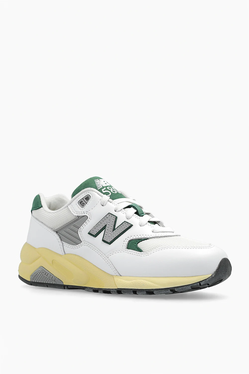 Biało-szaro-żółte, sznurowane buty sportowe, model ‘MT580RCA’ New Balance. Wykonane ze skóry i materiału. Ozdobione aplikacją z logo. Żółto-szara, gumowa podeszwa.