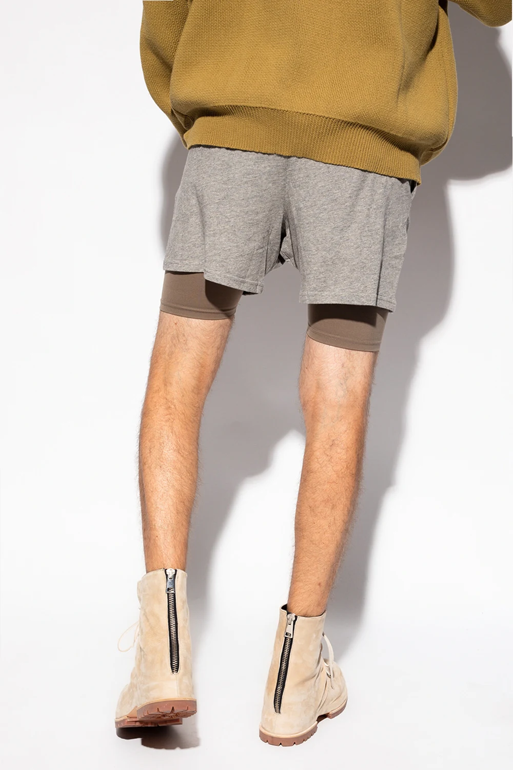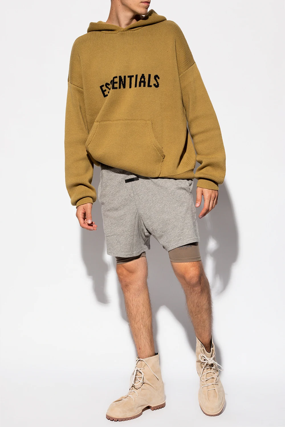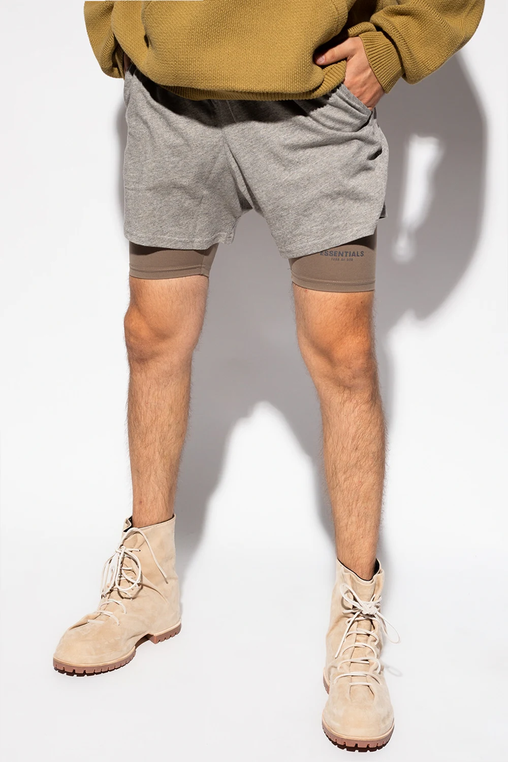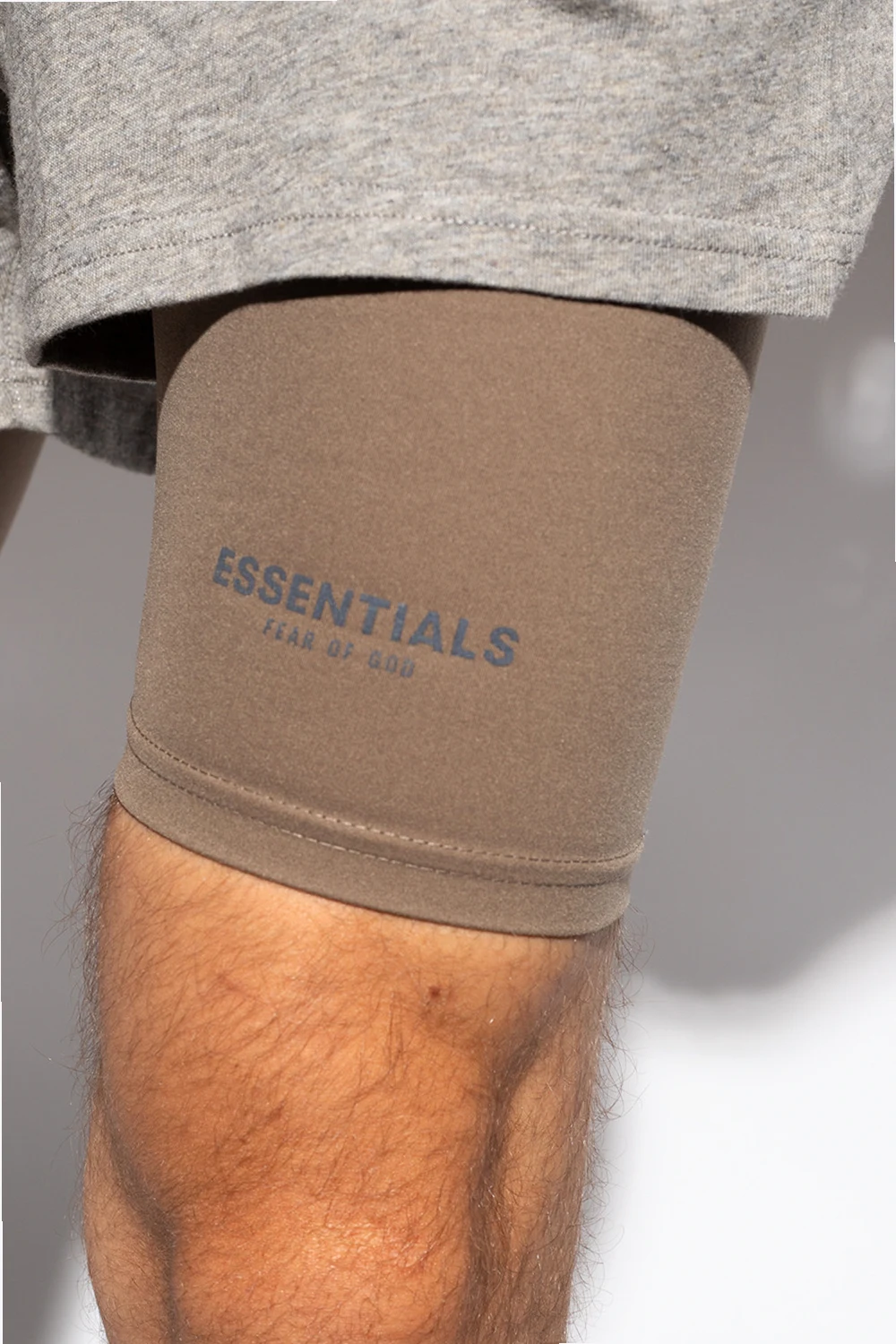 Krótkie, brązowe legginsy Fear Of God Essentials. W pasie wszyta czarna guma z wyszytym szarym logo. Z przodu ozdobione nadrukowanym logo z efektem odblaskowym.