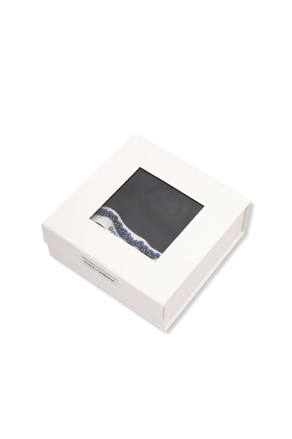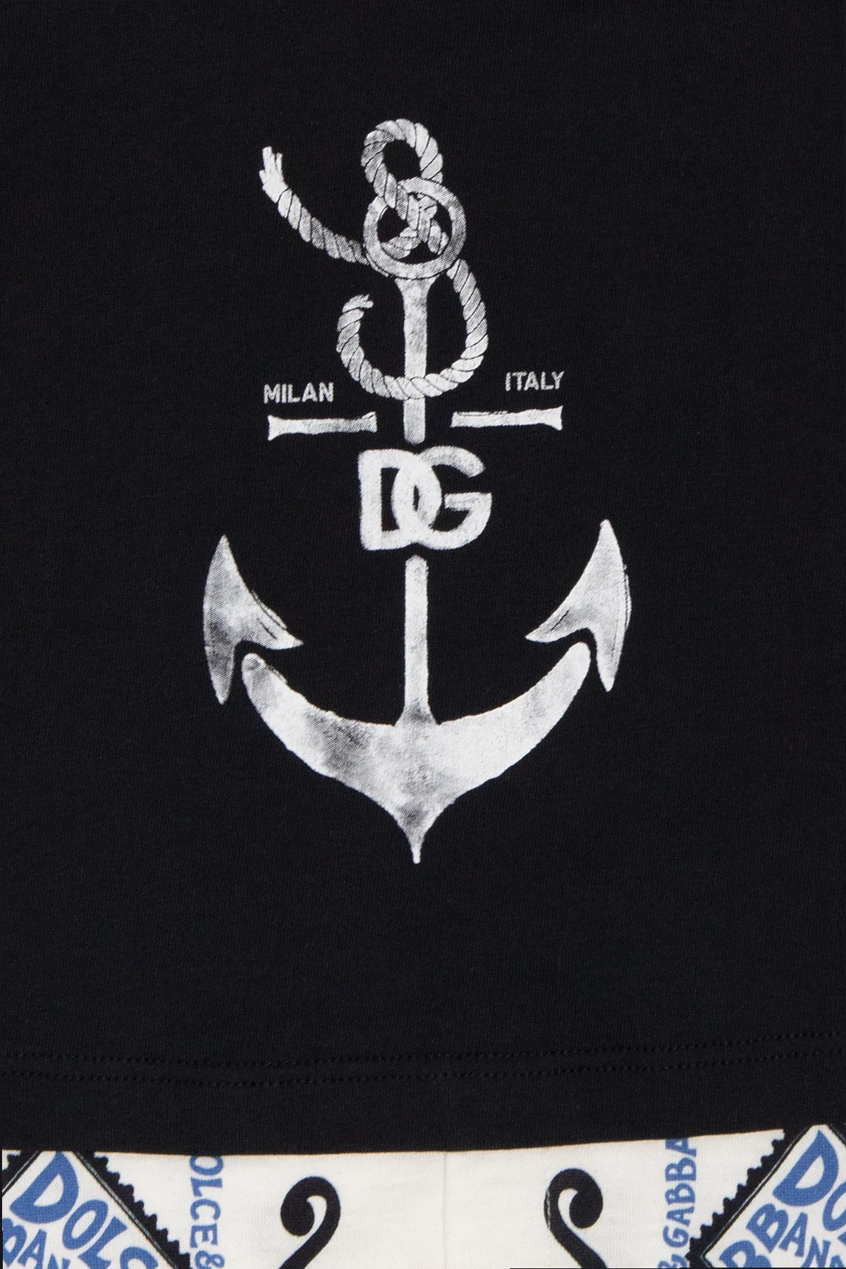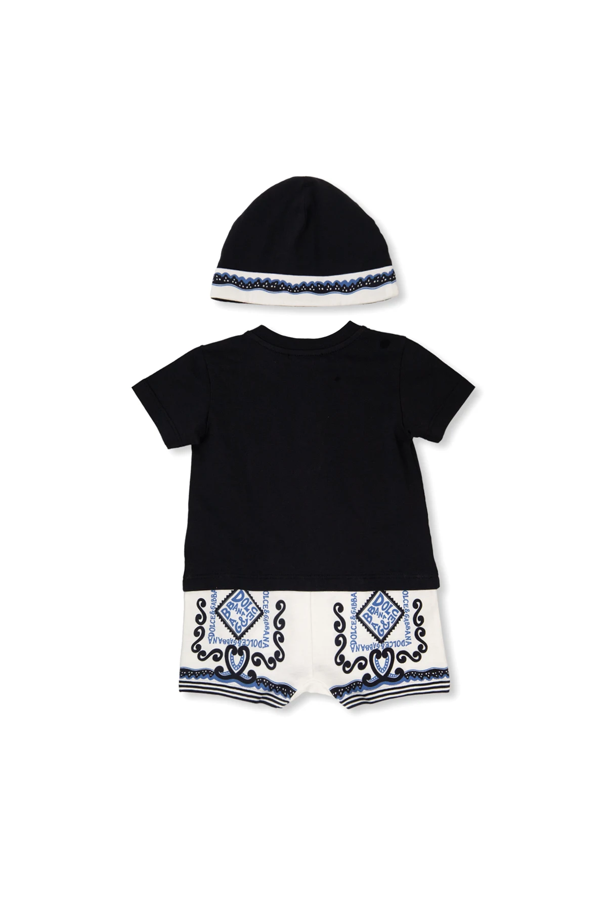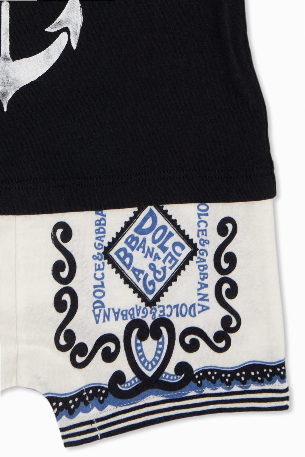 Granatowo-biały komplet: rampers i czapka Dolce & Gabbana Kids. Wykonany z bawełny. Ozdobiony niebiesko-granatowym wzorem ‘Marina’, logo i biało-szarym motywem kotwicy. Rampers na ramieniu i na dole zapinany na zatrzaski. Okrągły dekolt. Krótkie rękawy i nogawki.