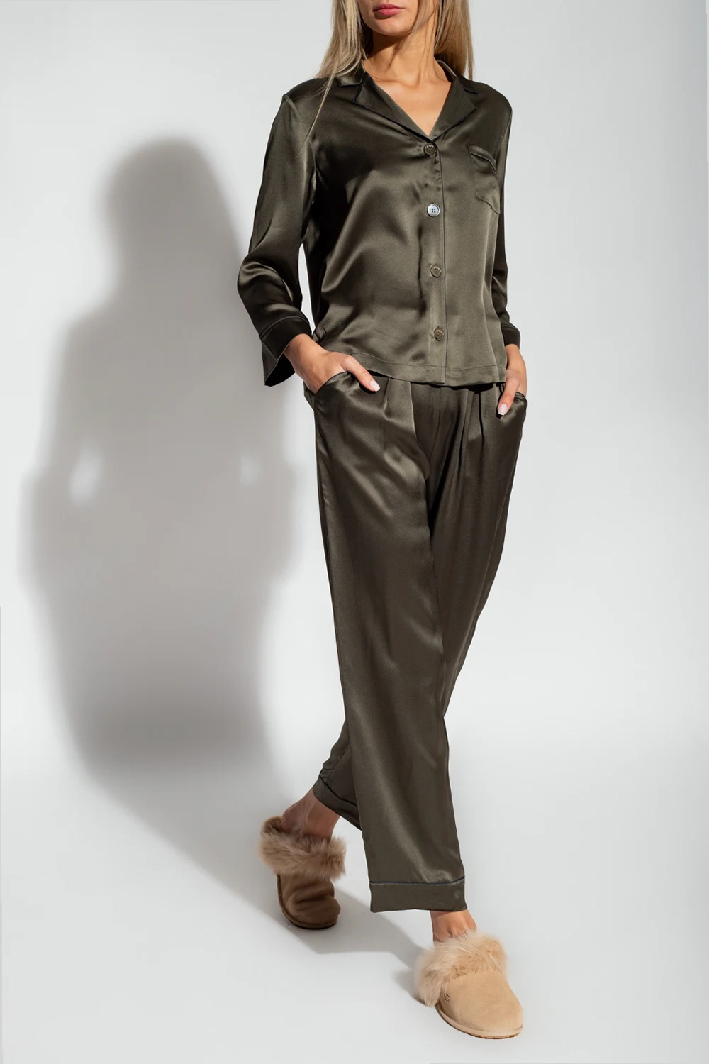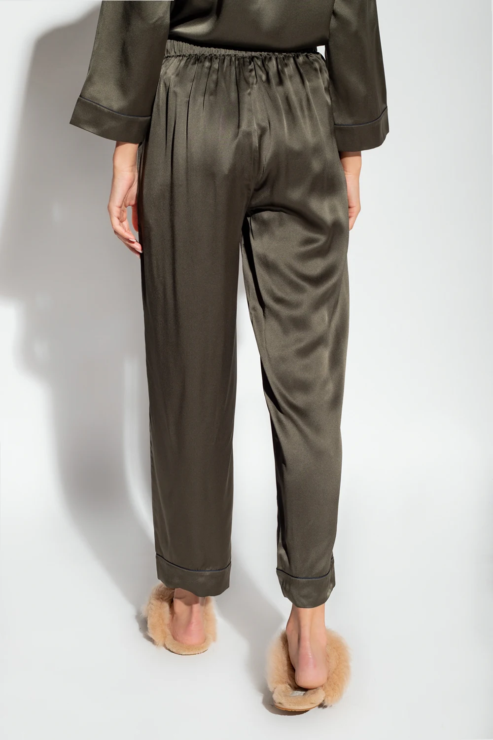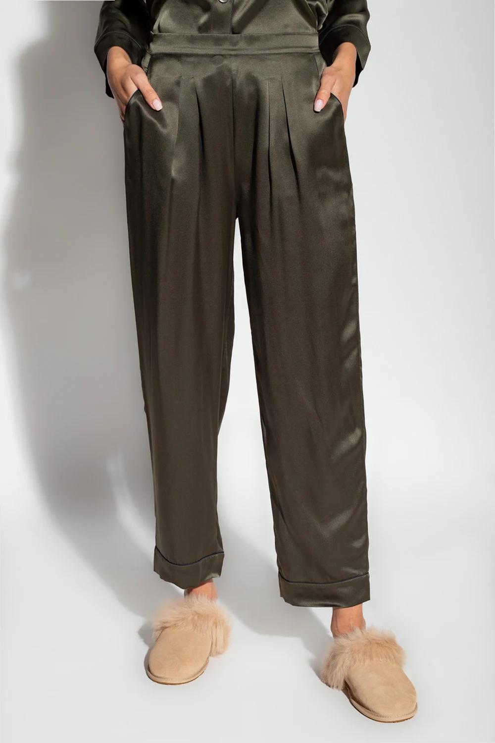Ciemnozielony dół od piżamy, model ‘Mondain’ Eres. Wykonany z jedwabiu. W pasie wszyta guma. Dwie wsuwane kieszenie. Z przodu dekoracyjne zakładki. Długie nogawki o luźnym kroju.