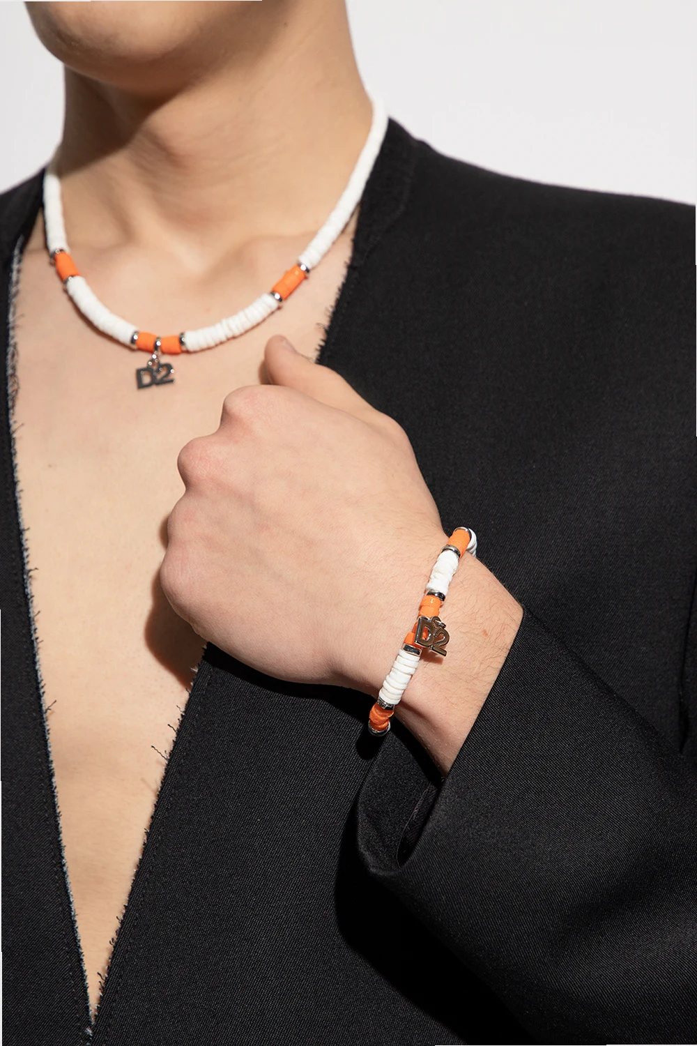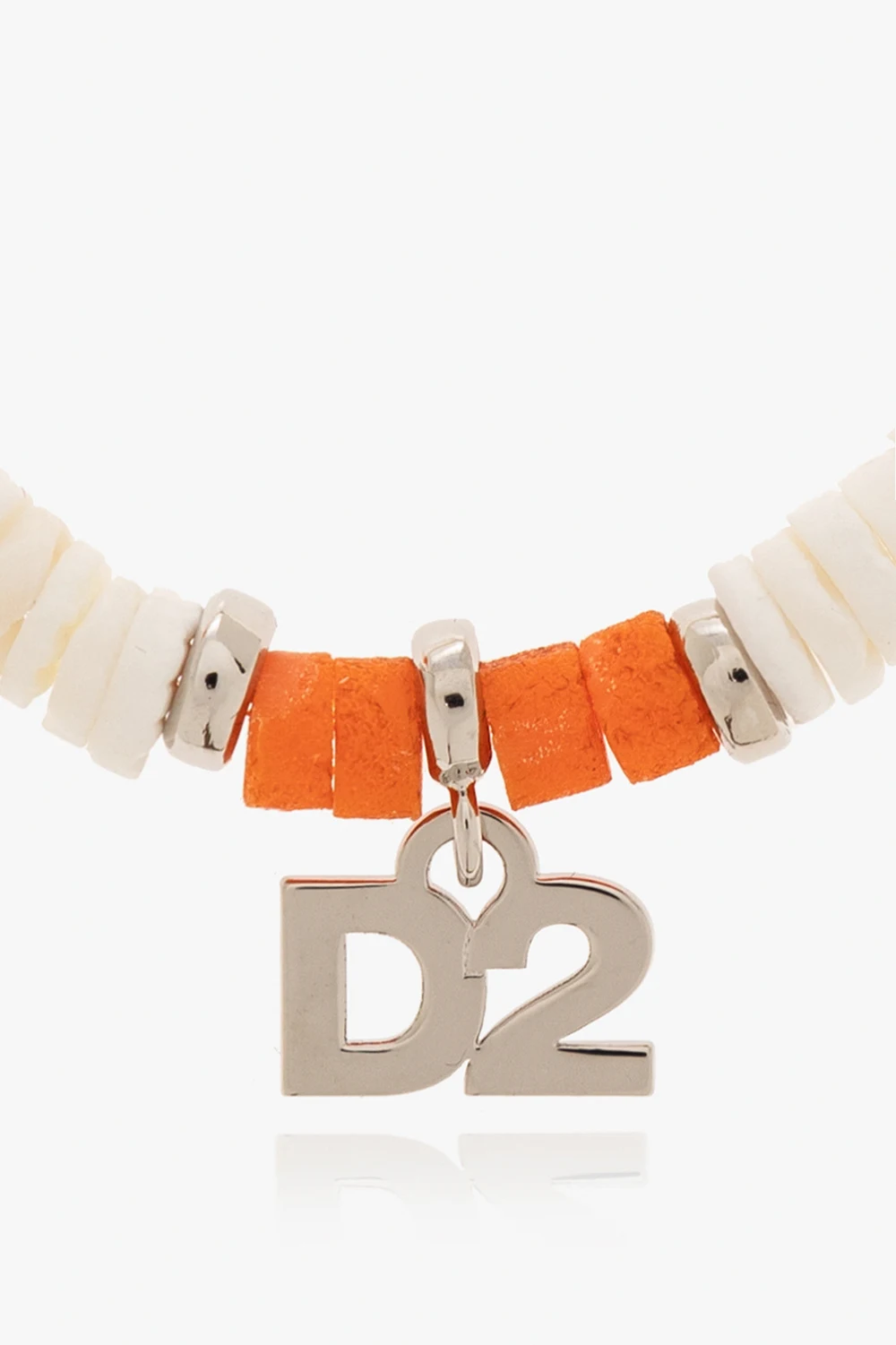 Kremowo-pomarańczowa bransoleta Dsquared2. Wykonana ze skorup muszelek. Wykończona mosiężnymi elementami w kolorze srebrnym. Zawieszka z logo.